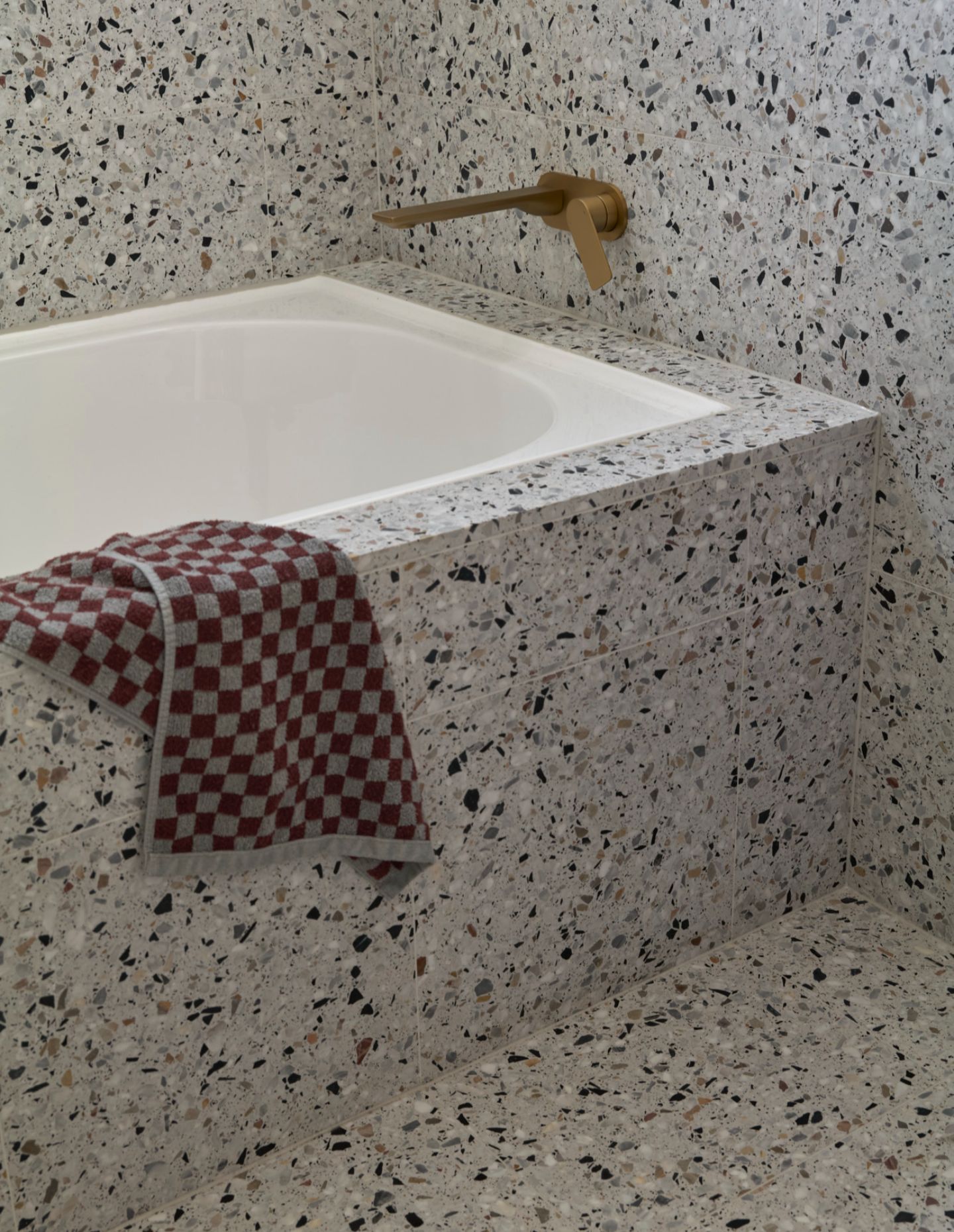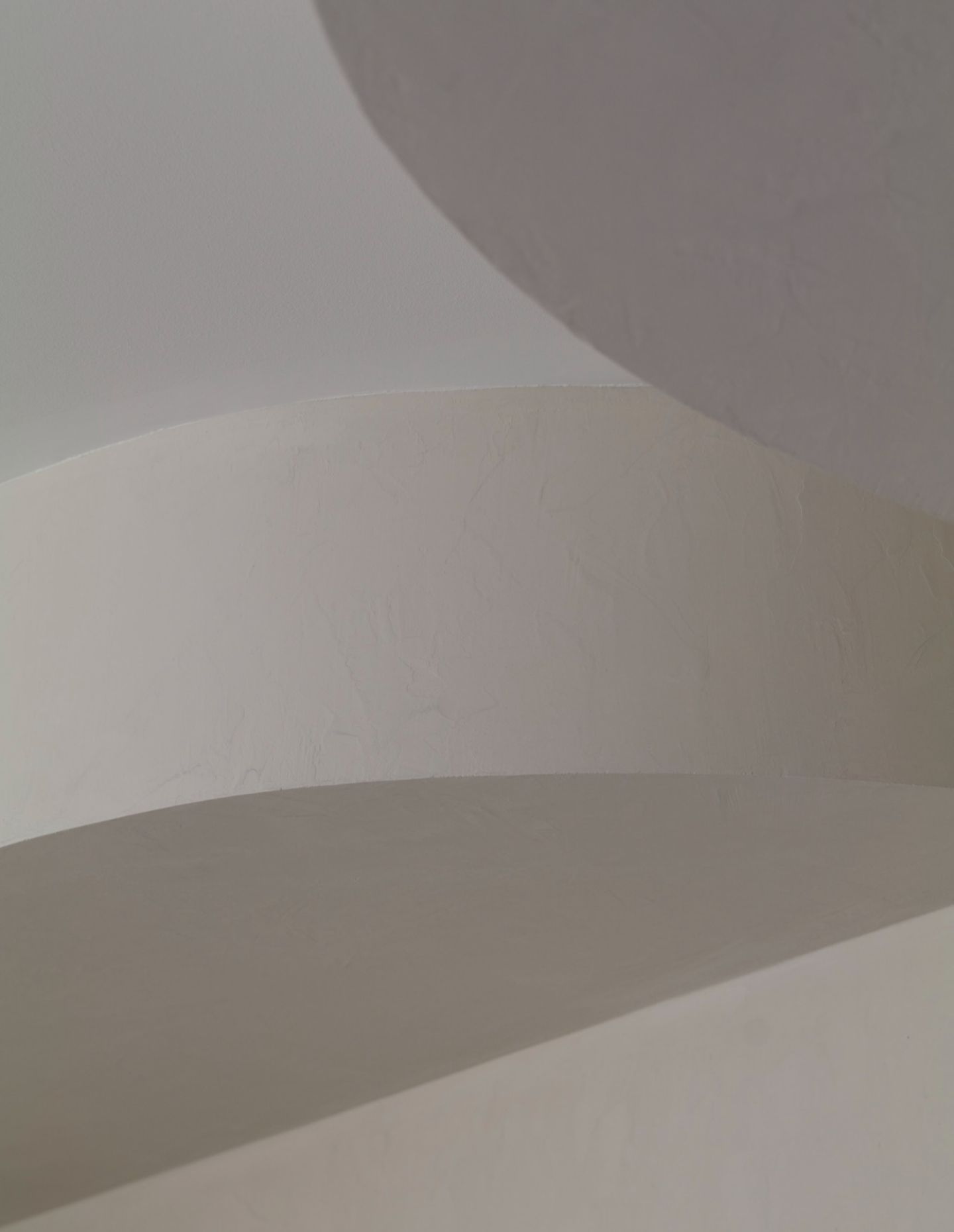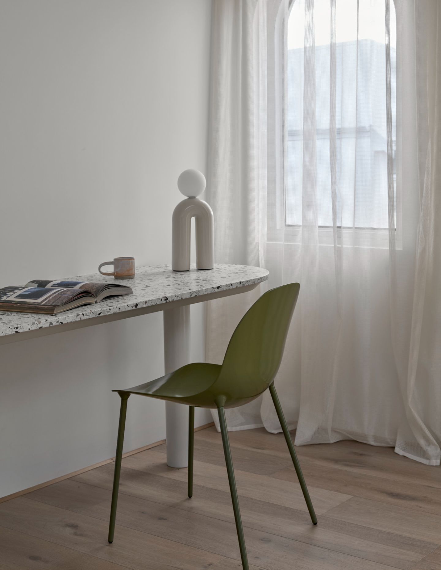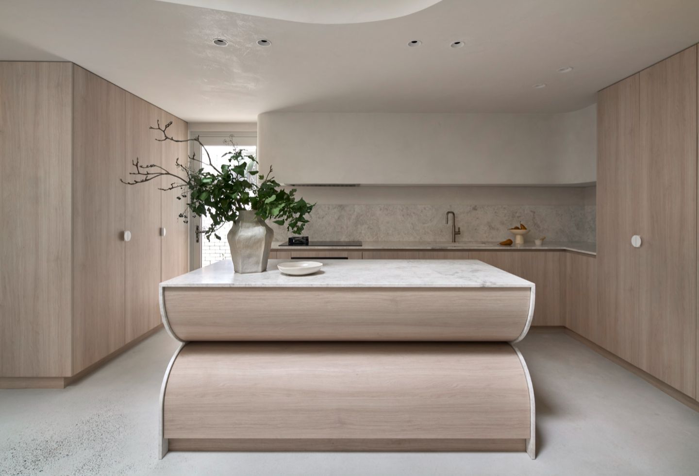 The curves return as a motif in the interior design – unexpectedly in the kitchen island and the stepped ceilings, to the more intimate details: the joinery, tapware and ambient lighting. They continue a fluidity that envelops, also seen in the rendered tactility continuing from the walls to the ceilings and again in the bathrooms, where floor-to-ceiling tiling creates immersive texture.