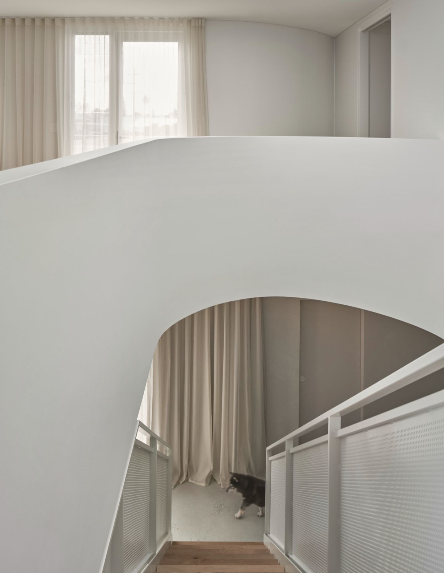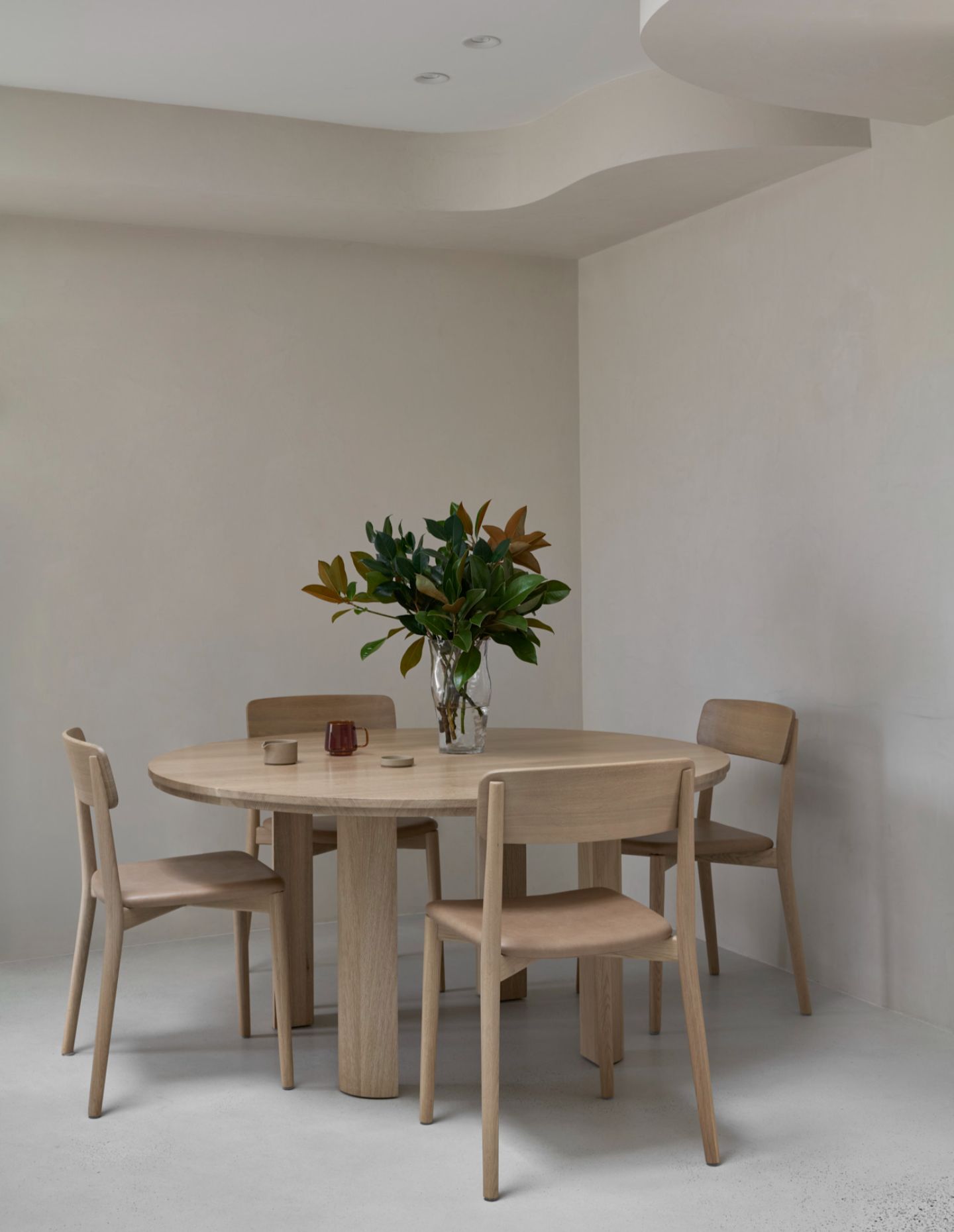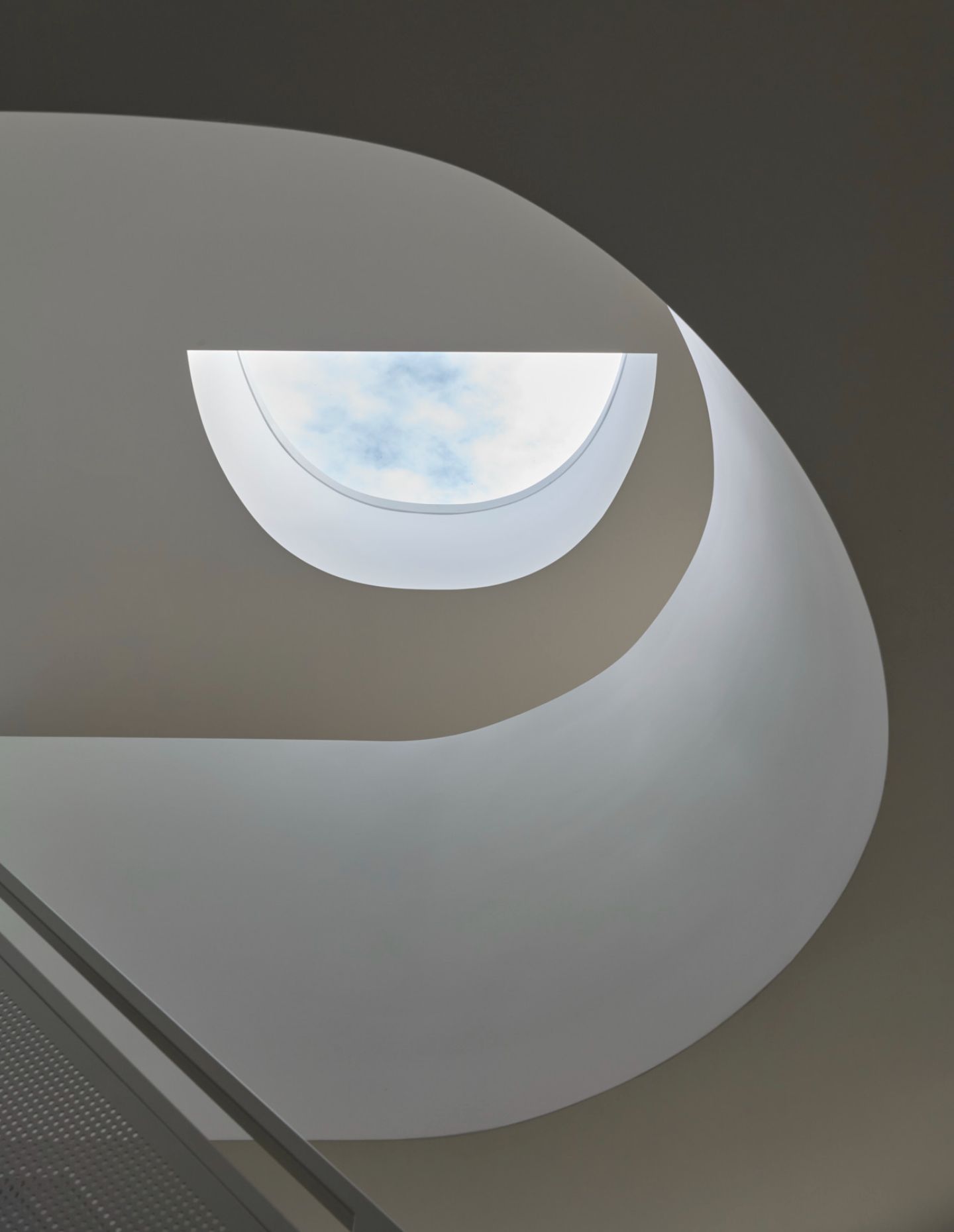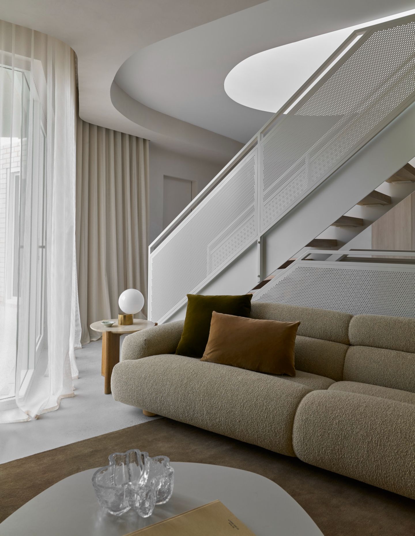 Repeatedly throughout the design, the architects allow curves to soften the angular form defined by the site constraints. State of Kin designed a central ‘sculptural anchor’ staircase to connect three levels and a skylight overhead floods the interior with natural light. “Here, curvature is not only aesthetic but functional – guiding movement, framing views and diffusing light, transforming a circulation element into a defining spatial experience,” says French. “The interplay of light within this core creates moments of drama and delight in everyday movement through the home.”
