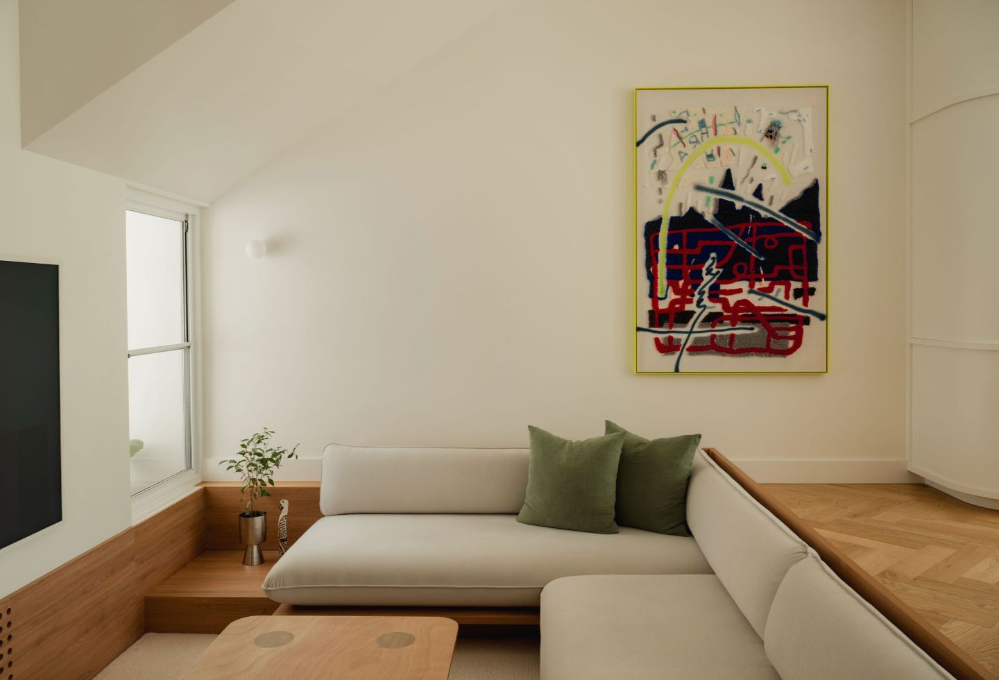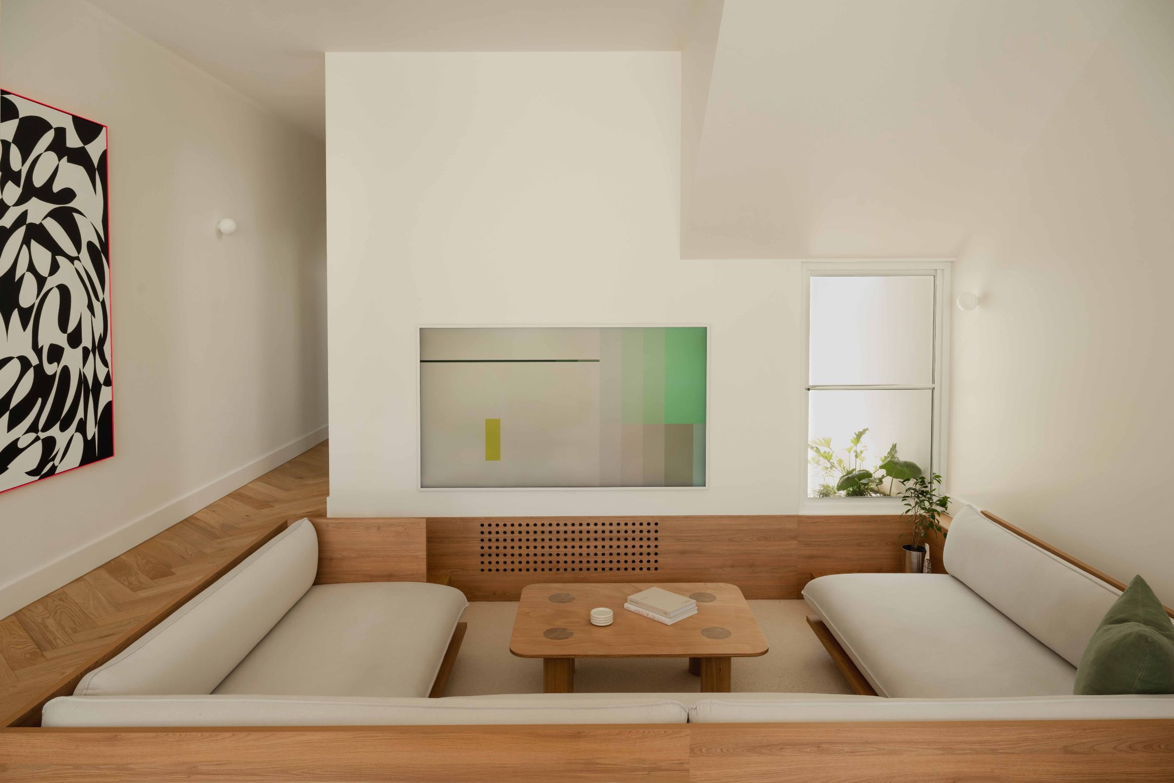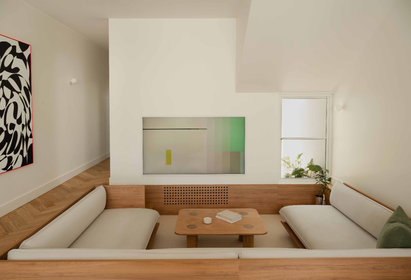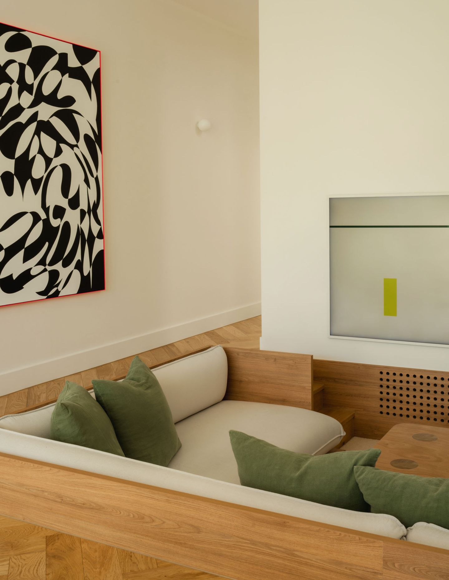 A sunken living area subtly increases the perceived height of the living room, creating a secondary zone within the open plan, maintaining visibility and connection. The move reinforces a sense of openness without sacrificing intimacy.