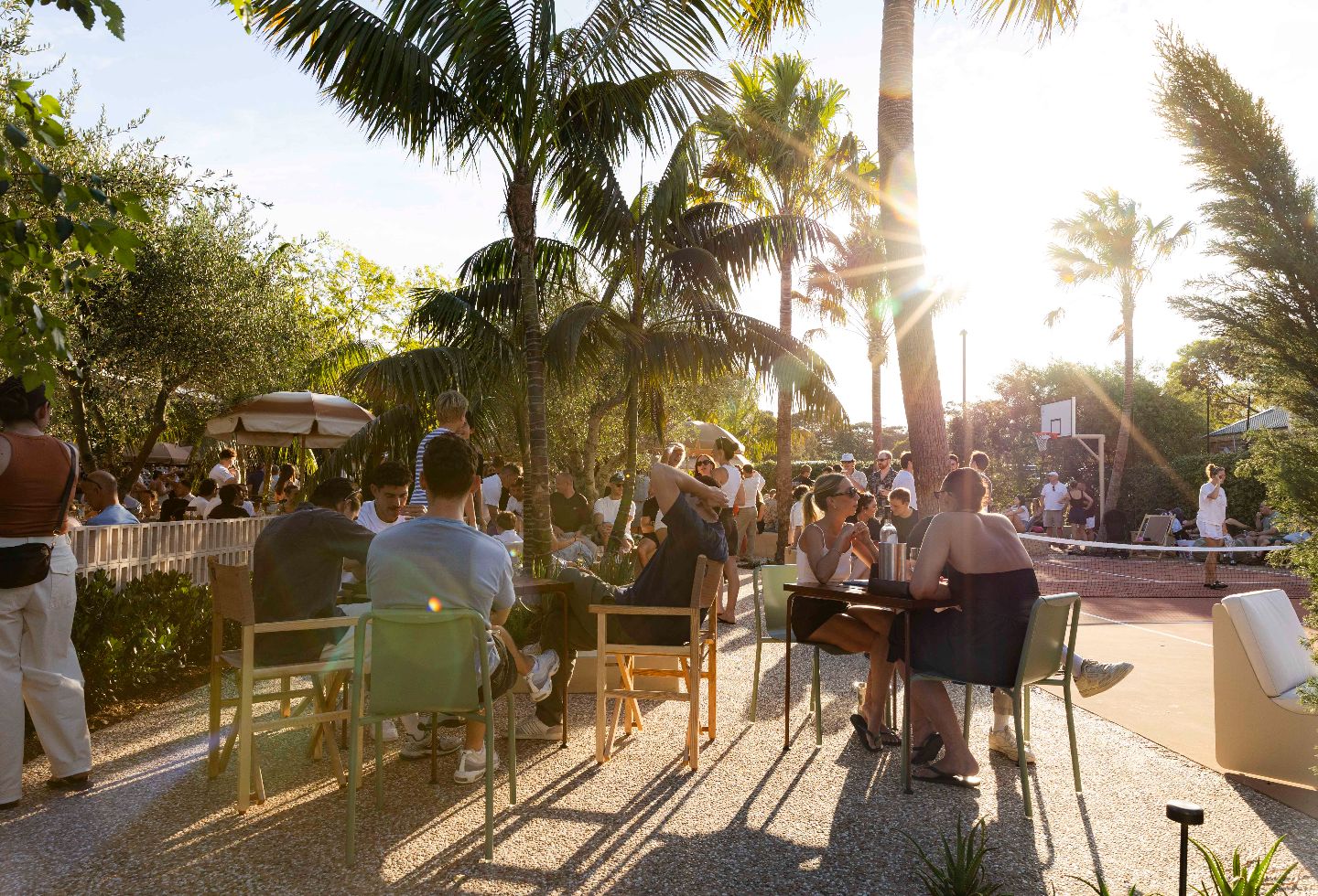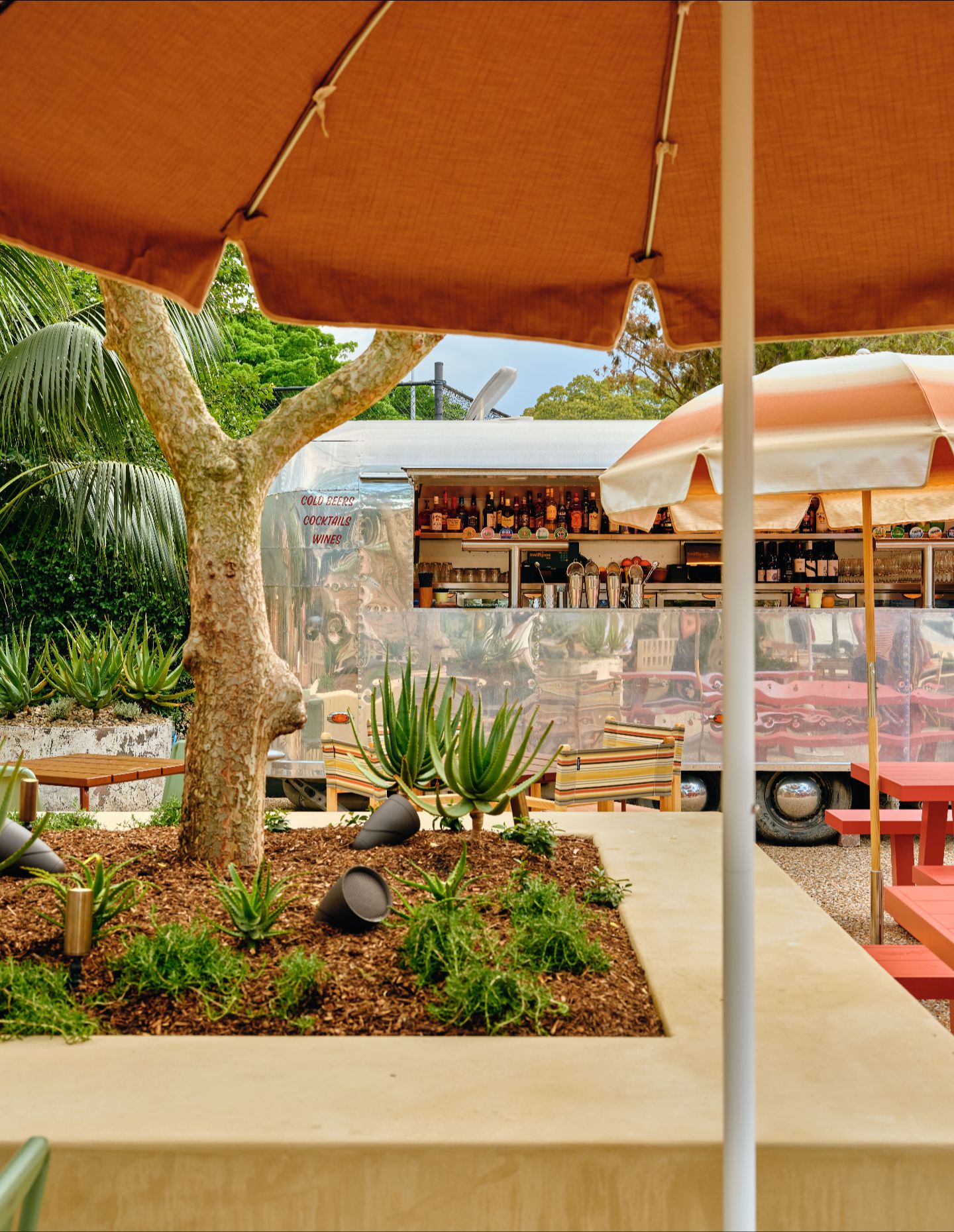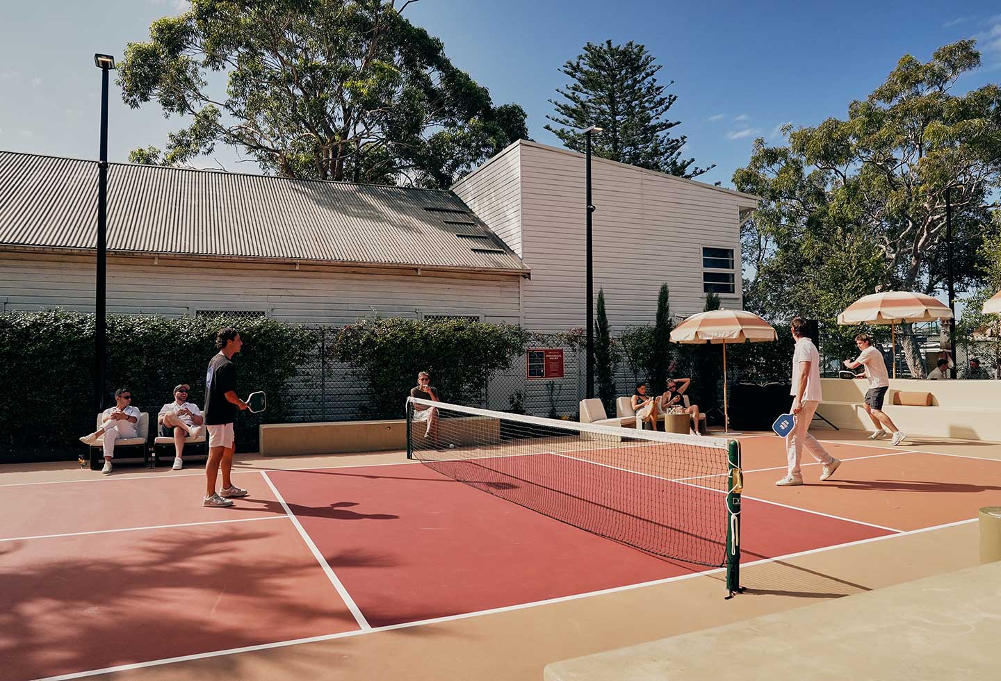 That sense of permeability extends outward into the reworked courtyard, which operates as the project’s social centre of gravity. Here, a full-size pickleball court and half basketball court sit alongside alfresco dining and an Airstream bar, all threaded together with planting and rain gardens. It’s a space designed for overlap: families, locals, beachgoers and dogs moving through the same field without hierarchy. The proximity to the water is tangible — people arrive mid-walk, mid-swim, mid-afternoon — and the architecture accommodates that informality rather than resisting it.