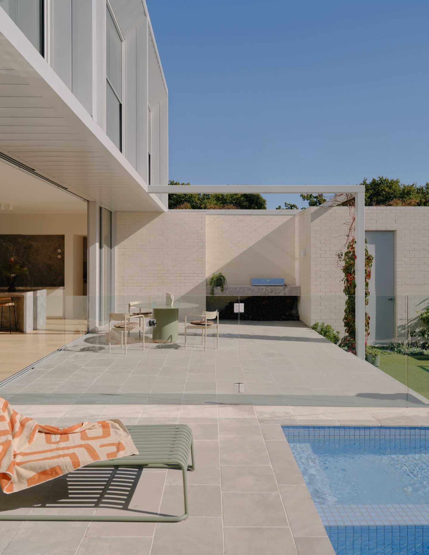 Further adding to the feeling of calm and disconnection from the outside, each material expression is kept deliberately quiet and restrained. A combination of soft-toned bricks meet pale-coloured metal cladding at the rear, with the upper level appearing to float above the timber-lined interior. Stone, timber and crisp whites all come together to create a palette that feels both durable and expressive, while bathrooms rely on blade walls – rather than glass – to privilege texture and longevity over boldness or ornate detailing. The combination of deep eaves, cross-ventilation, shaded courtyards and thermal mass ensure the home settles comfortably across seasons.