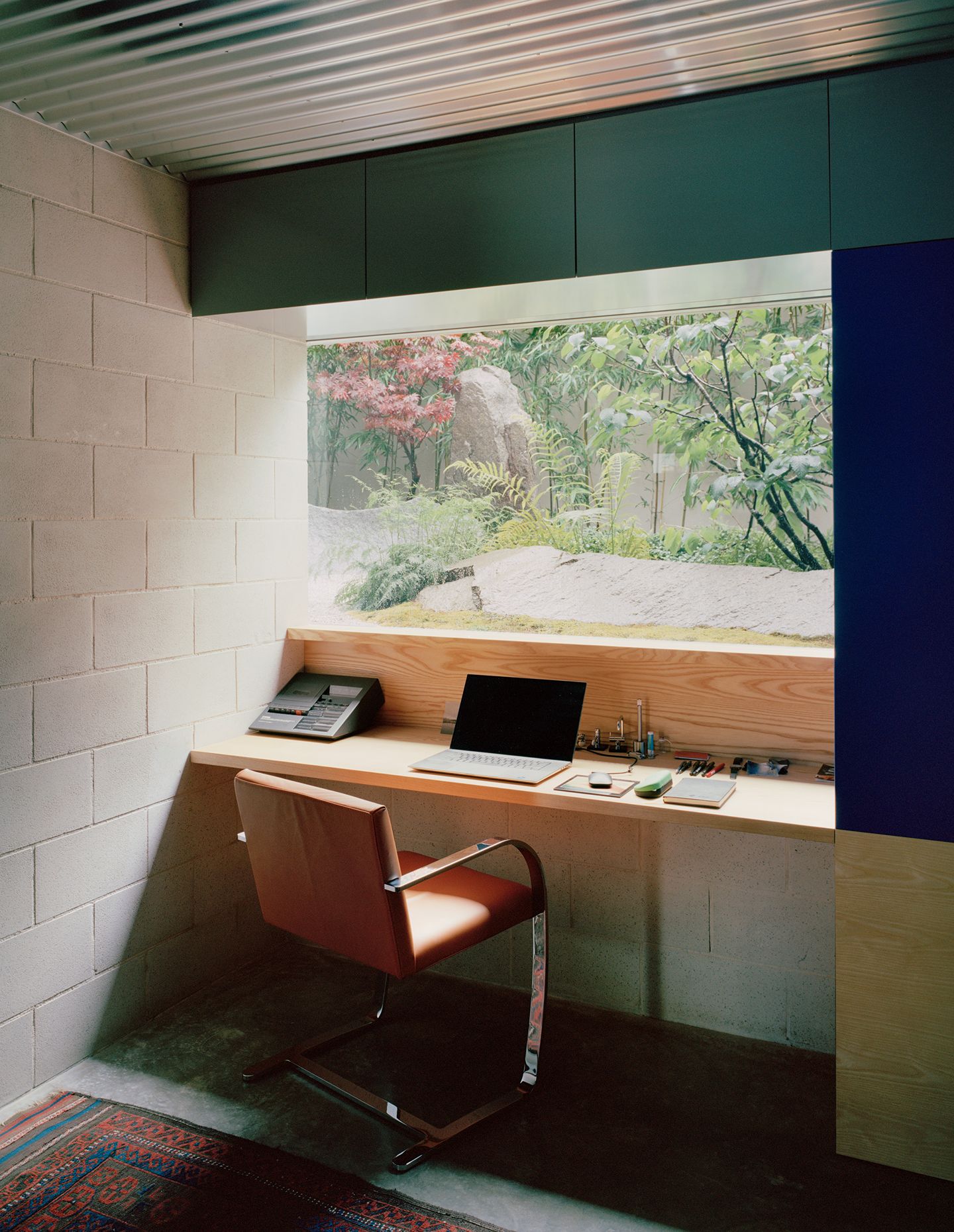 Clerestory windows bring light into the main upper space, with bespoke timber storage cabinets and bookcases used to break up the apertures. It is a clever way of dealing with the problem of overlooking neighbours in this dense location, but, most importantly, it leads to what is perhaps the climax of the project – a sensitively framed garden that ties together the atmospherically contrasting upper and lower levels. With the garden evoking a ‘borrowed landscape’ aesthetic, it is utterly appropriate that Langston-Jones has chosen to restrict and curate visual interaction with it. “The framing of the view makes it that much more intense and precious,” he adds.