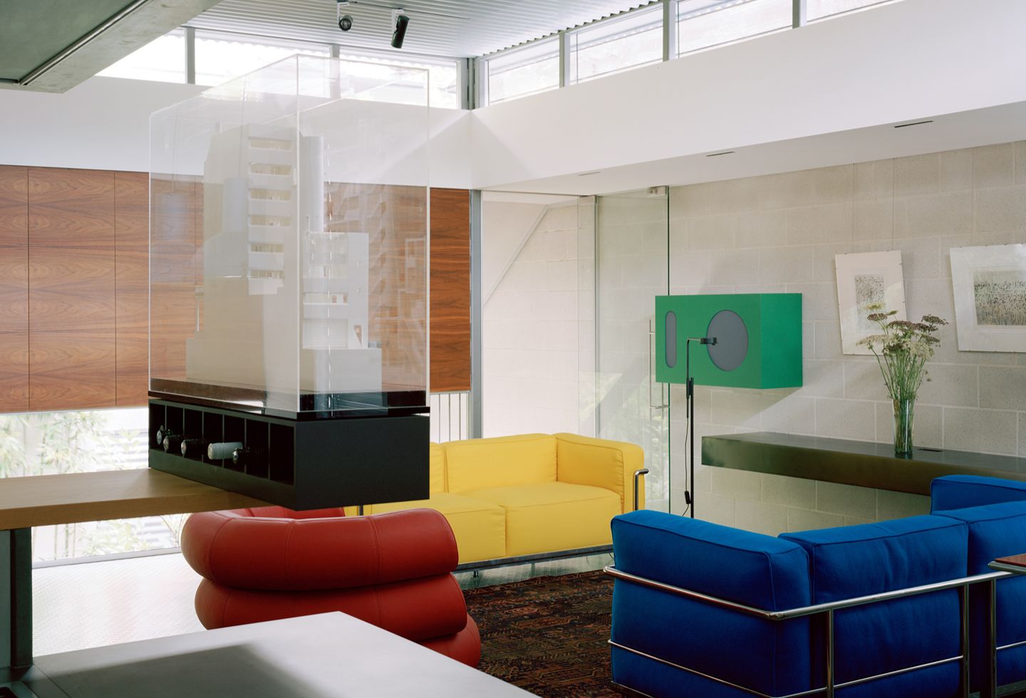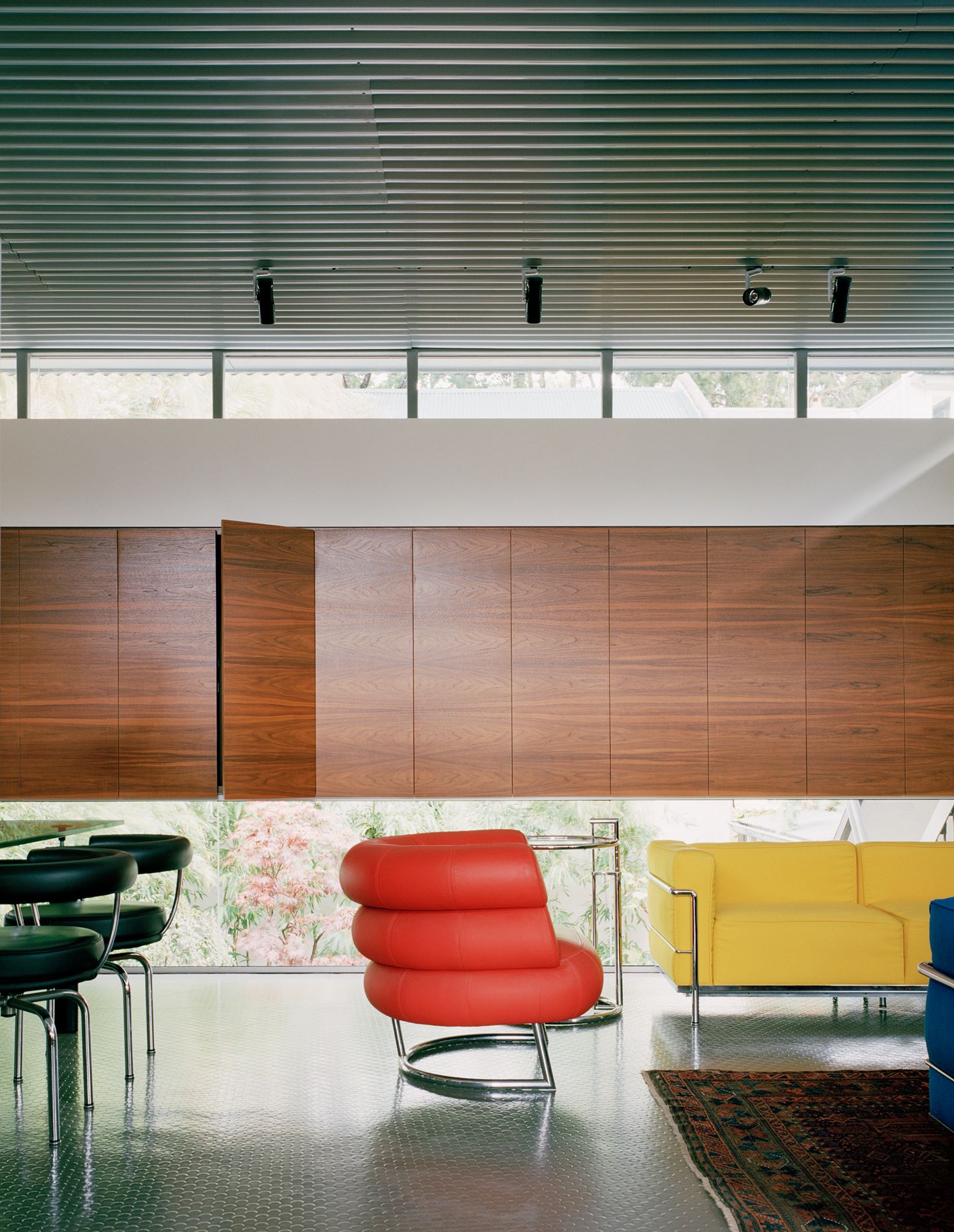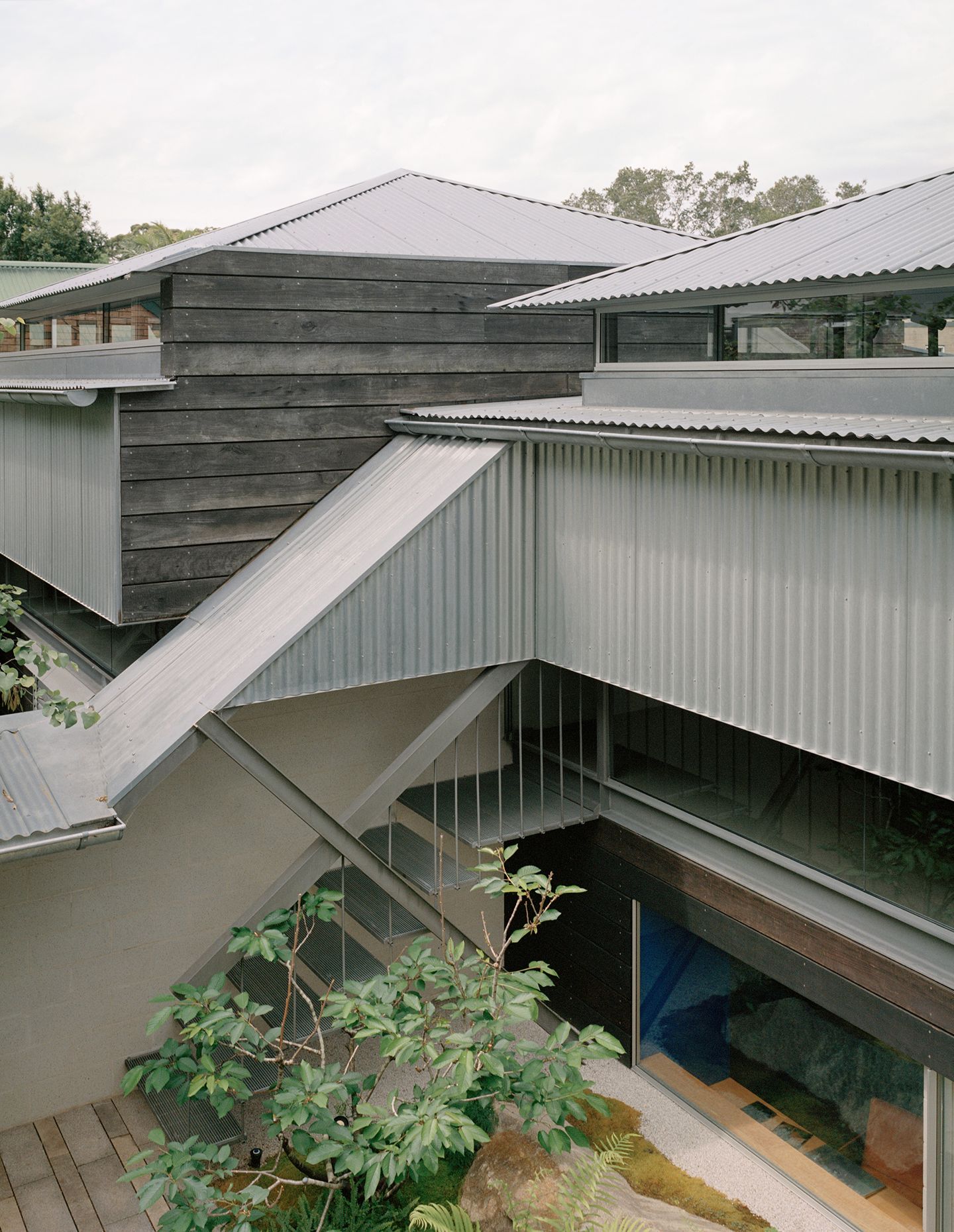 The sense of architectural rigour is captured in the initial encounter with the Zen garden on the same level, which caters to the more private spaces of each house. Due to the sloping site, the windowsill levels of the bedroom and office rooms here are fitted precisely to meet the ground plane of the garden. It is a quietly thoughtful and magical touch that embeds the houses in the earth, creating a sense of assured peace and sturdiness.