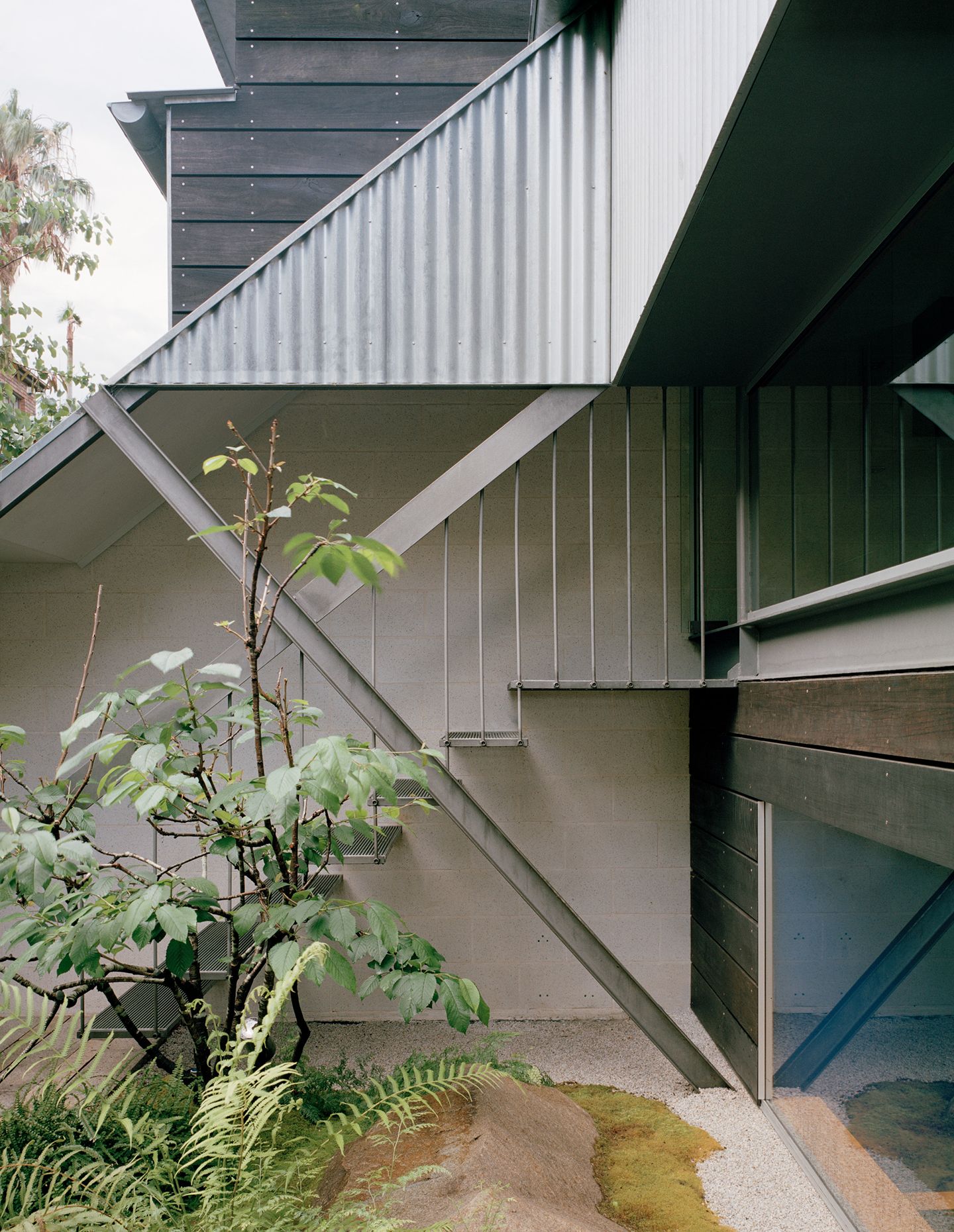 David Langston-Jones’ twin houses unveil themselves unhurriedly as one approaches through the backstreets of Redfern, Sydney. Indeed, Little Young Street itself is a slightly curious hodgepodge of garage doors and even an apartment block with no apparent entrance. “There’s an element of the streetscape that is quite unfriendly – you have to remember that it’s a gritty, inner-city context,” says Langston-Jones. “Somehow, we had to make something that would feel friendly, activate the street and would also look down the street.”