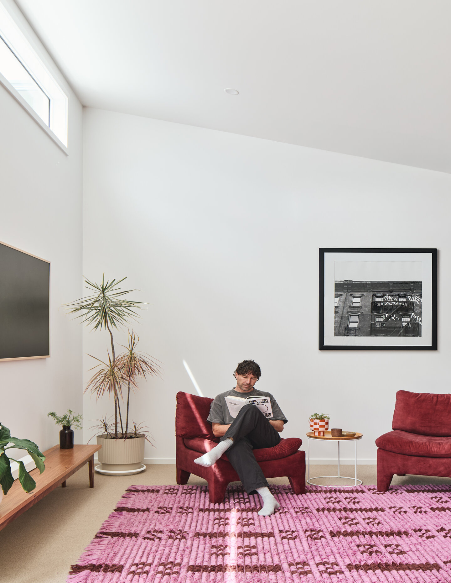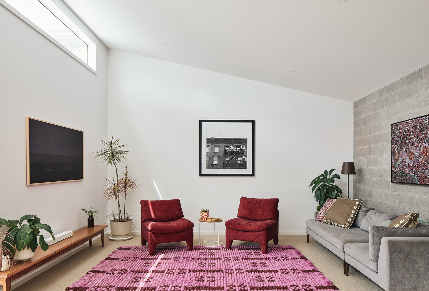 Internally, a concrete blockwork wall anchors the main living, kitchen and dining spaces. It introduces a sense of weight and texture, and provides a tactile contrast to the softer finishes elsewhere in the home. The palette was selected to feel robust and expressive rather than overly refined, supporting the clients’ preference for materials that reveal age and use.