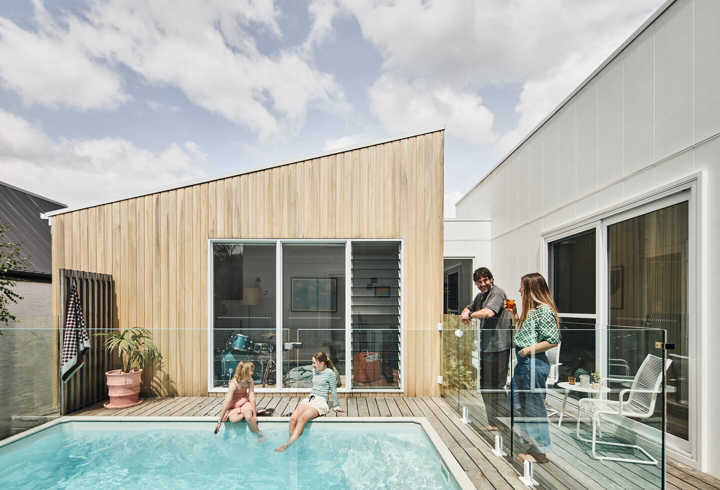 A central courtyard and pool act as the functional and social heart of the home, with living spaces opening directly onto this shared outdoor area. This creates a clear relationship between indoor and outdoor living, while allowing parents to maintain visual connection across different parts of the house.