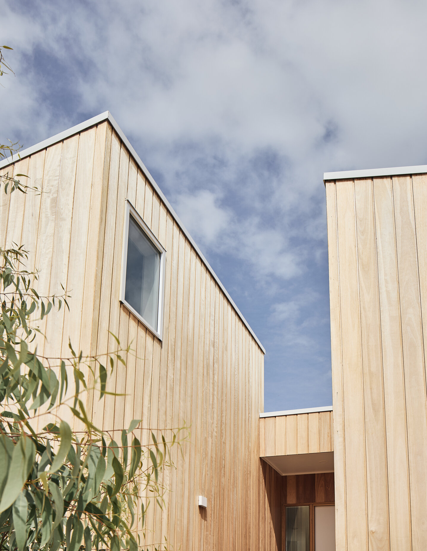 The material approach is deliberately restrained, allowing light, landscape and spatial relationships to take precedence. Externally, timber cladding wraps key volumes and is intended to weather and soften over time, echoing the tones of the surrounding coastal environment. This is paired with lighter, more durable cladding elements that help balance longevity with a calm, cohesive expression.
