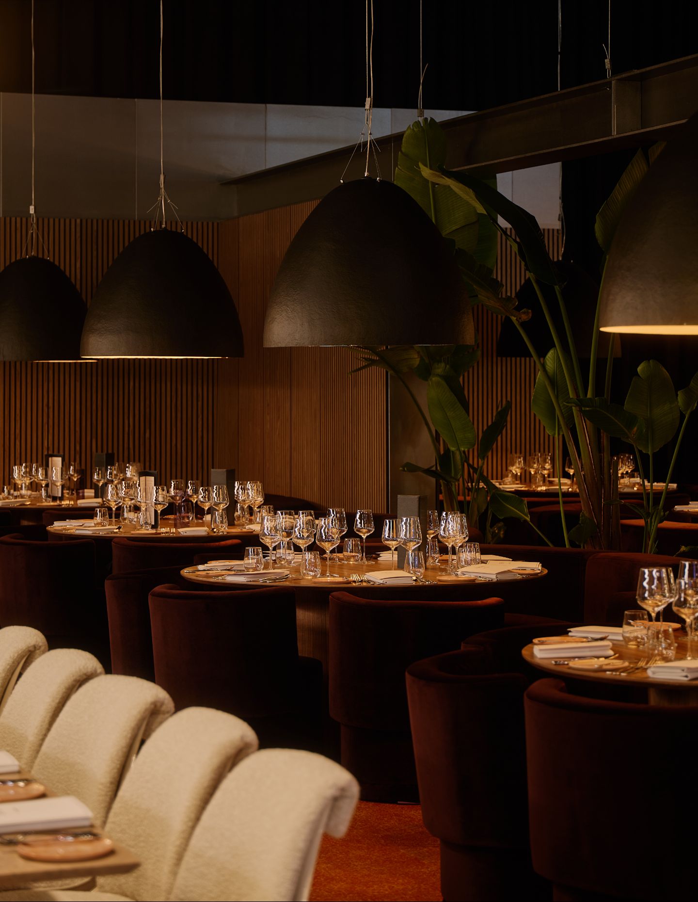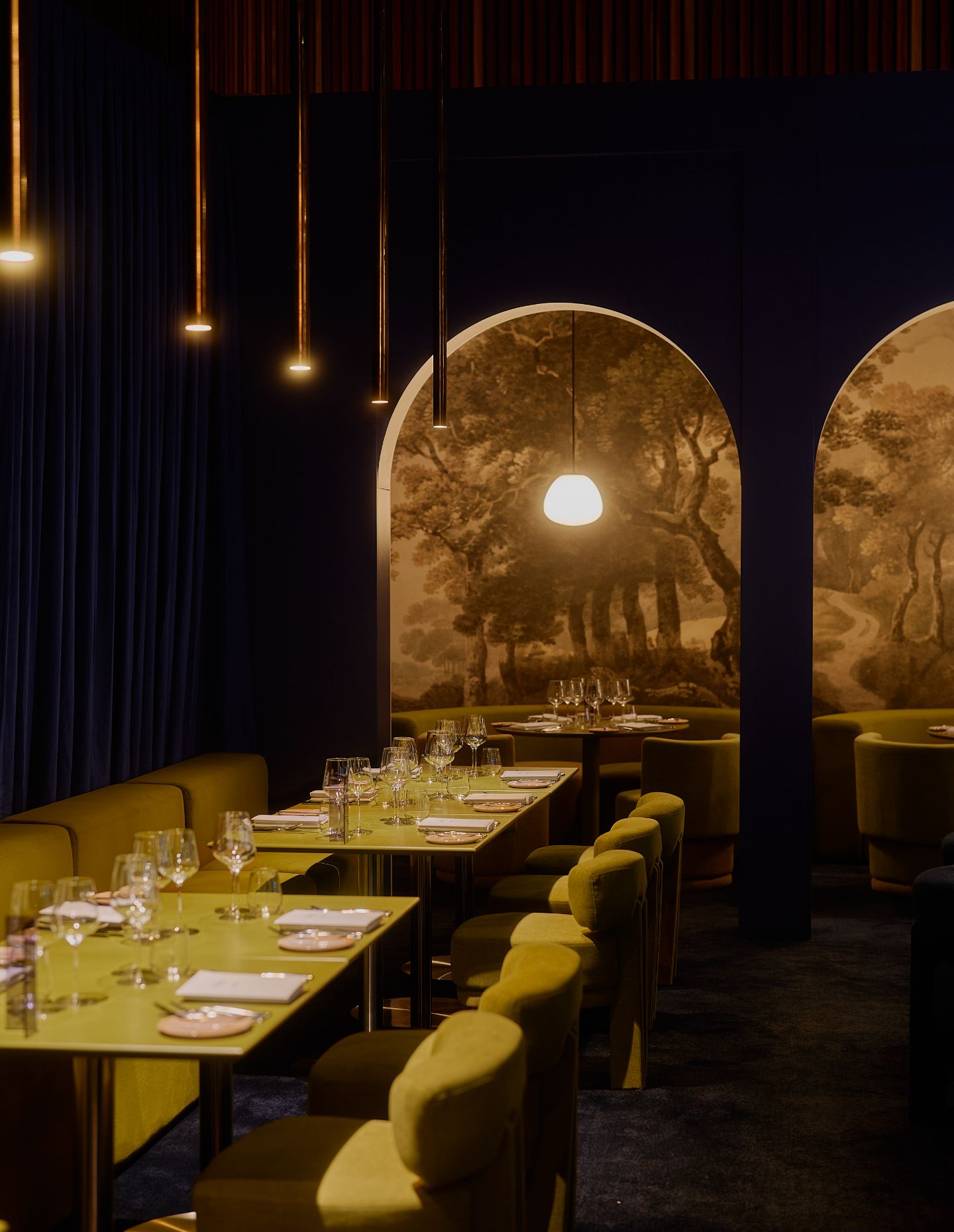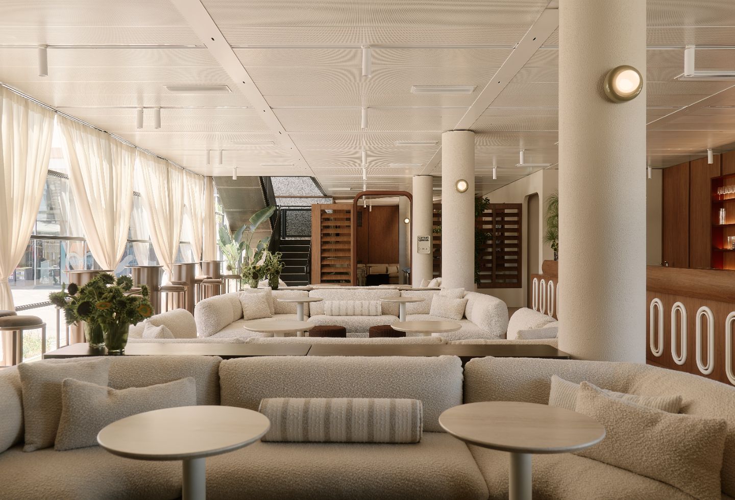 Custom-designed waiter stations, bespoke menus and a signature scent diffused throughout the spaces extend the attention to detail beyond the visual. “We don’t just want screens playing tennis popped up across the space,” Barrett explains. “We recess them into certain cavities and bars so they’re there if you want to engage, but if you don’t, they’re not in your way at all.”