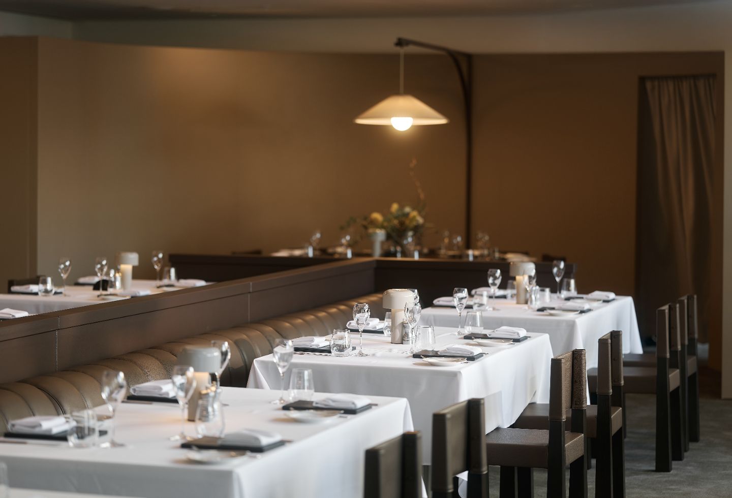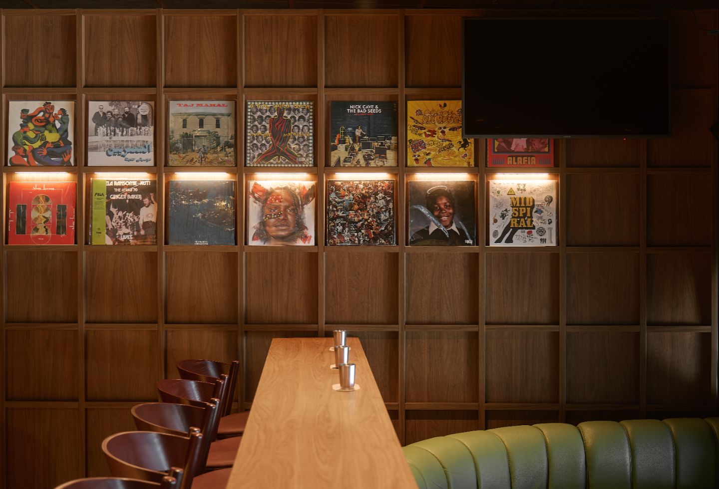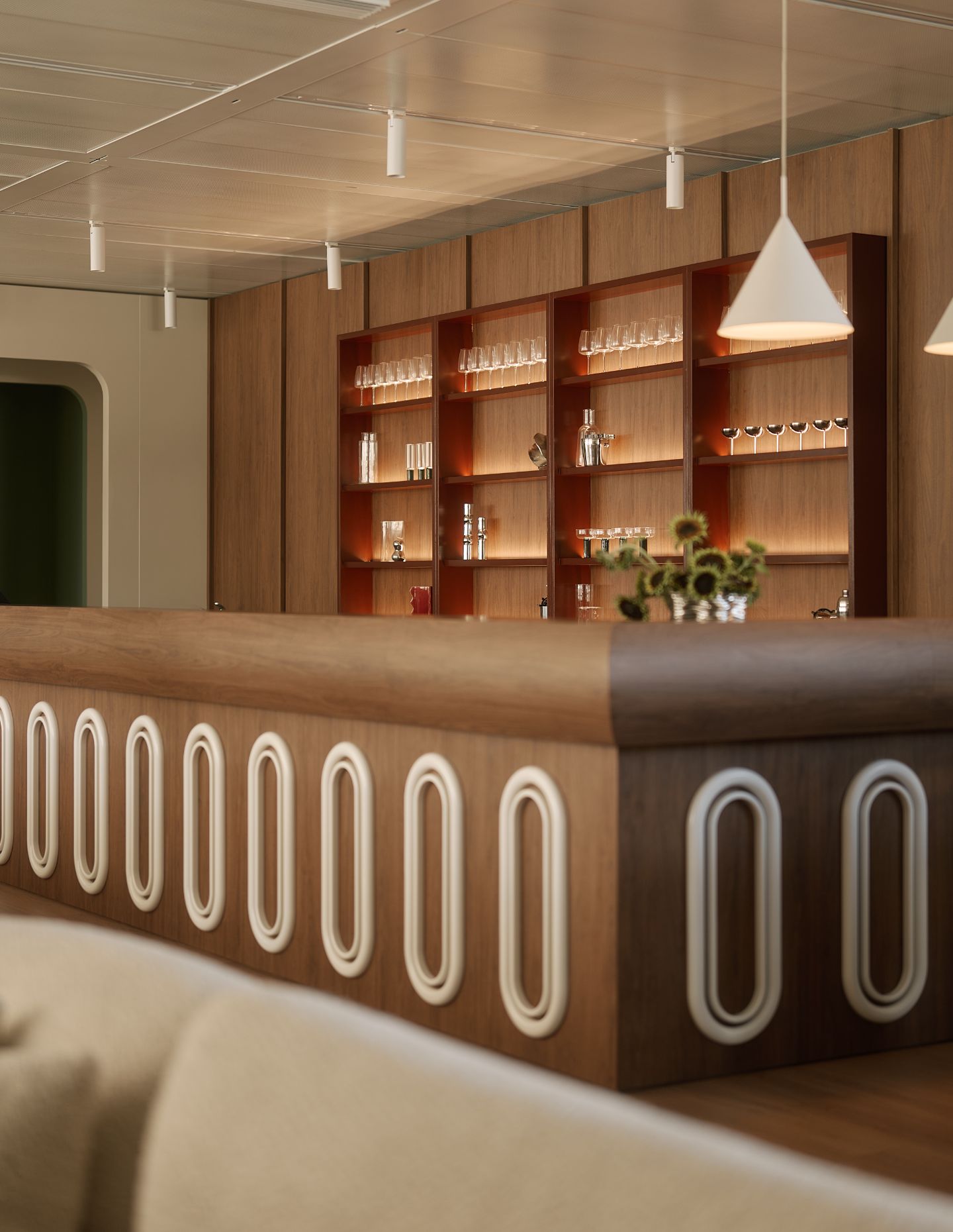 Custom-designed waiter stations, bespoke menus and a signature scent diffused throughout the spaces extend the attention to detail beyond the visual. “We don’t just want screens playing tennis popped up across the space,” Barrett explains. “We recess them into certain cavities and bars so they’re there if you want to engage, but if you don’t, they’re not in your way at all.”
