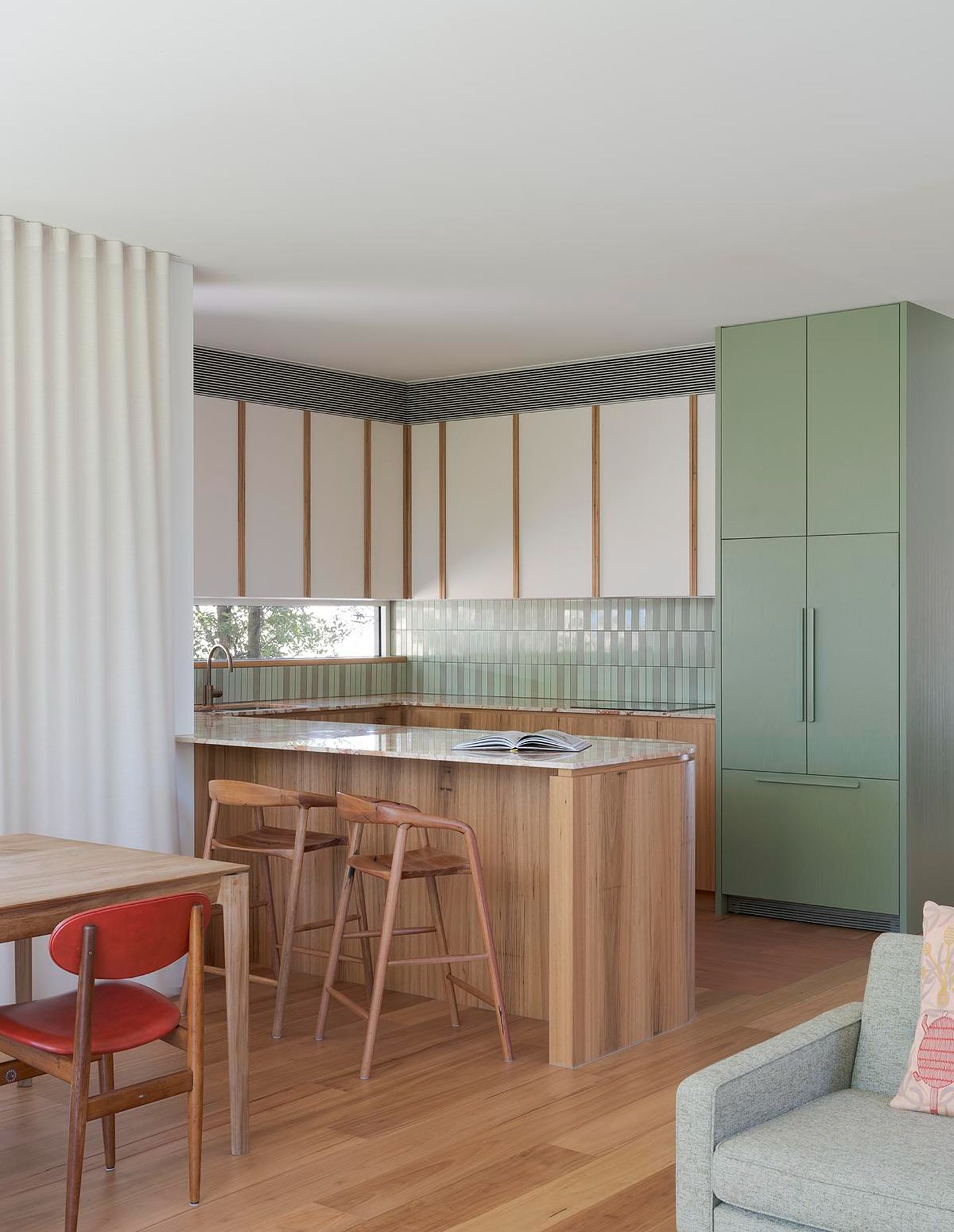 The dining table is by New Trit House, paired with mid-century dining chairs by Elite. An Angelucci sofa and chairs were sourced via Facebook Marketplace and reupholstered by Cover It Up Upholstery. Floor and wall tiles are from Artedomus, and the Brecciata Rosso marble benchtops were supplied by SNB Stone.