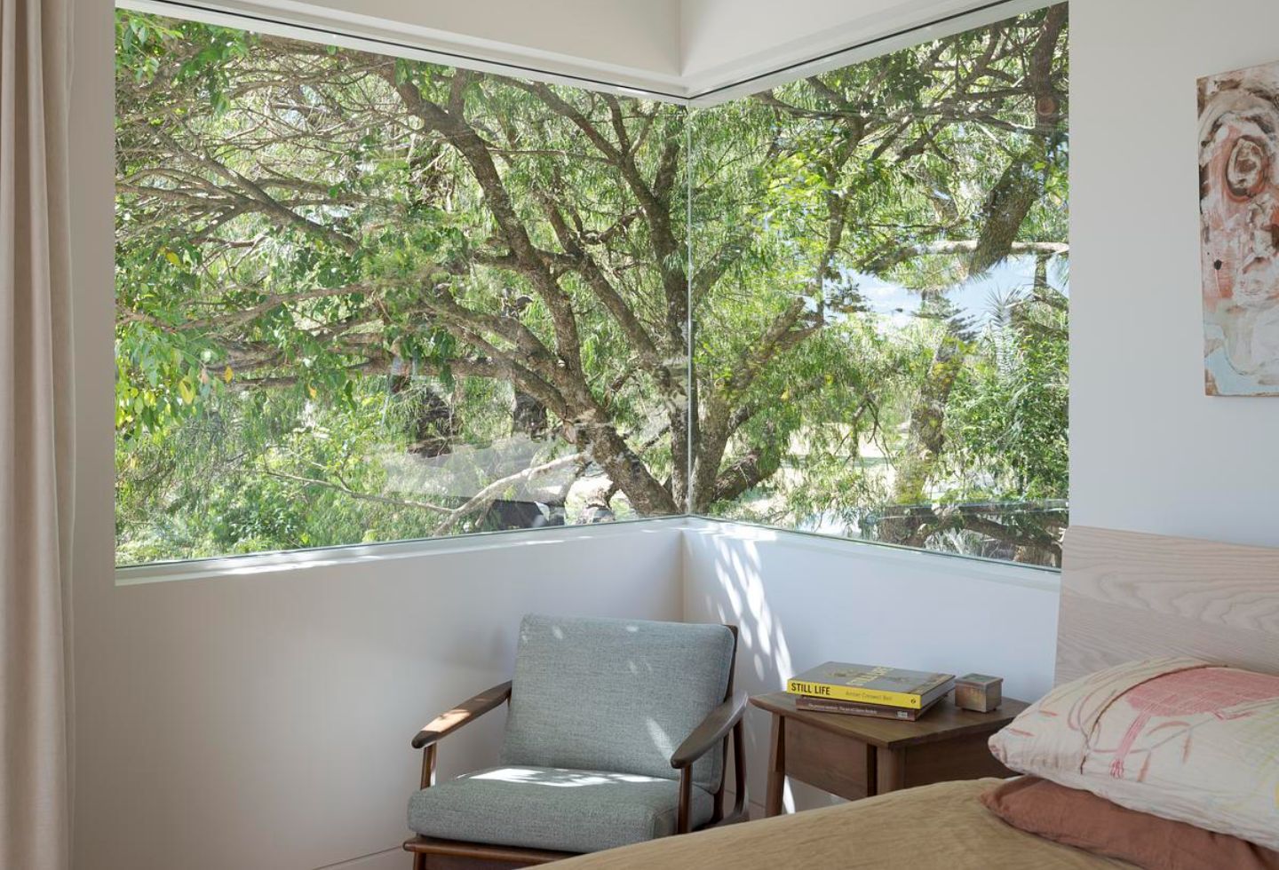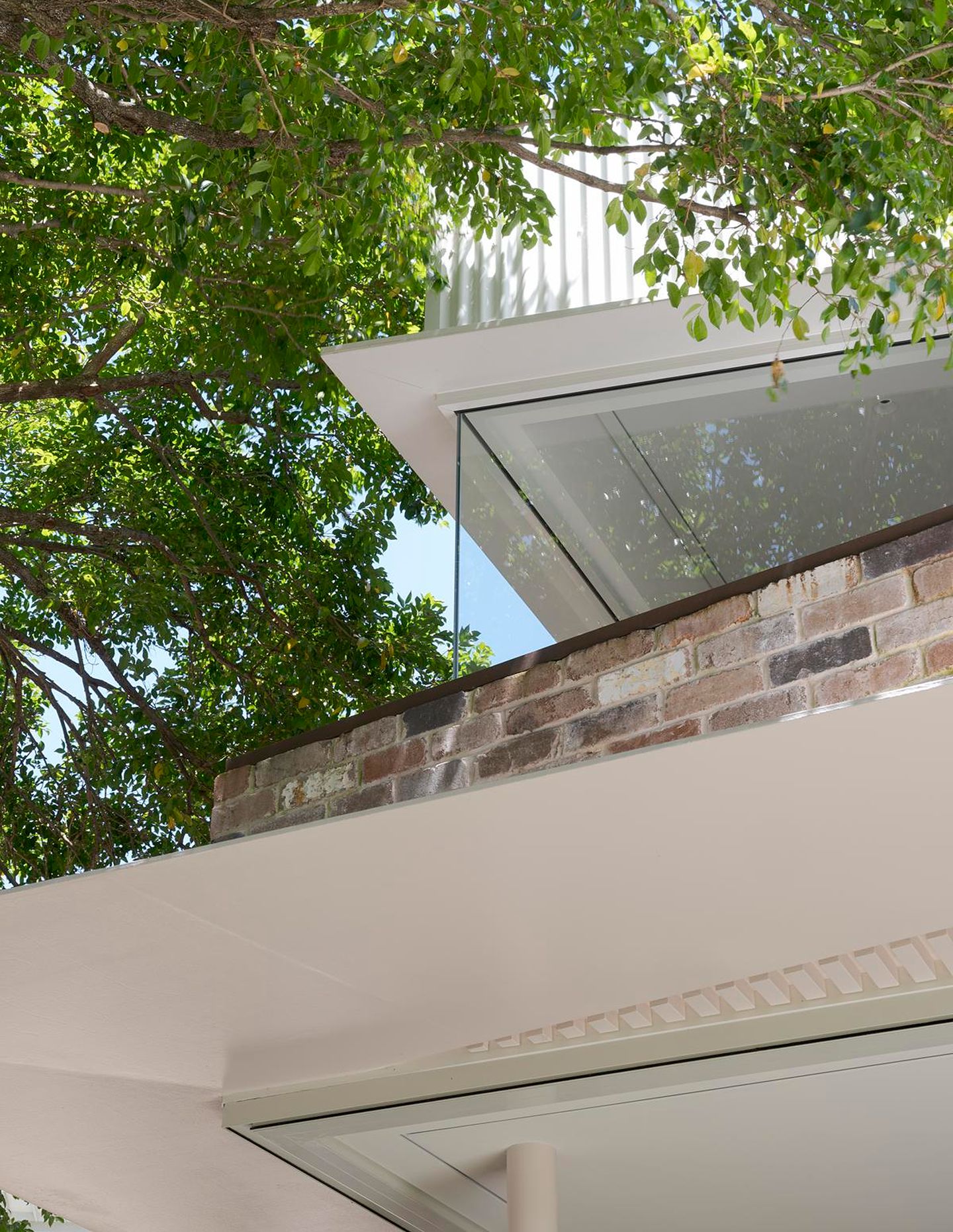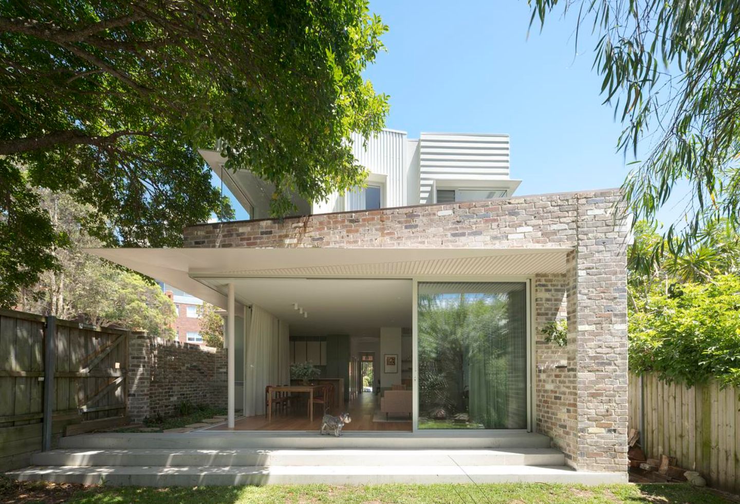 Externally, the envelope is deliberately restrained. Fibre cement cladding and corrugated metal in neutral tones allow the addition to sit comfortably within its leafy context.