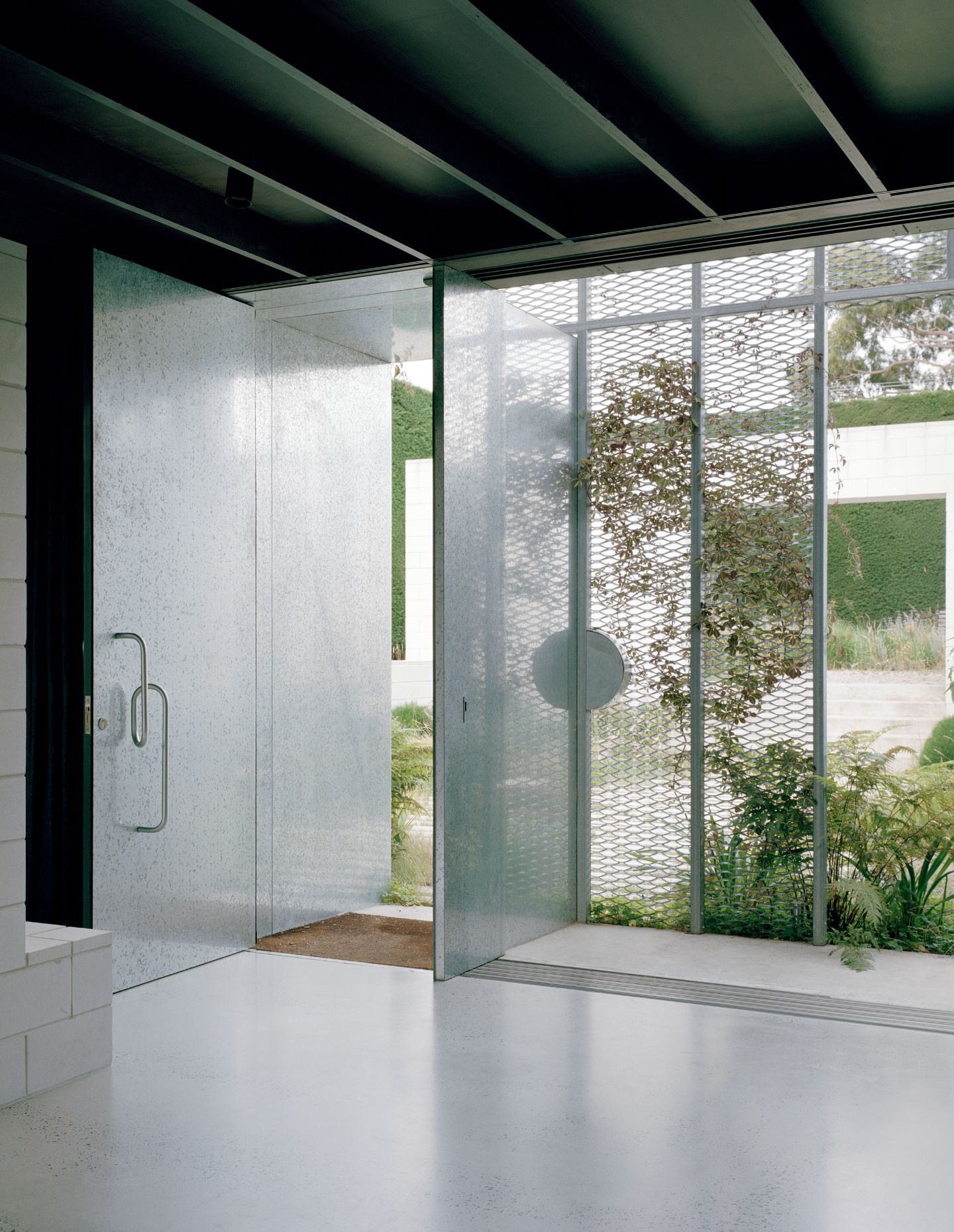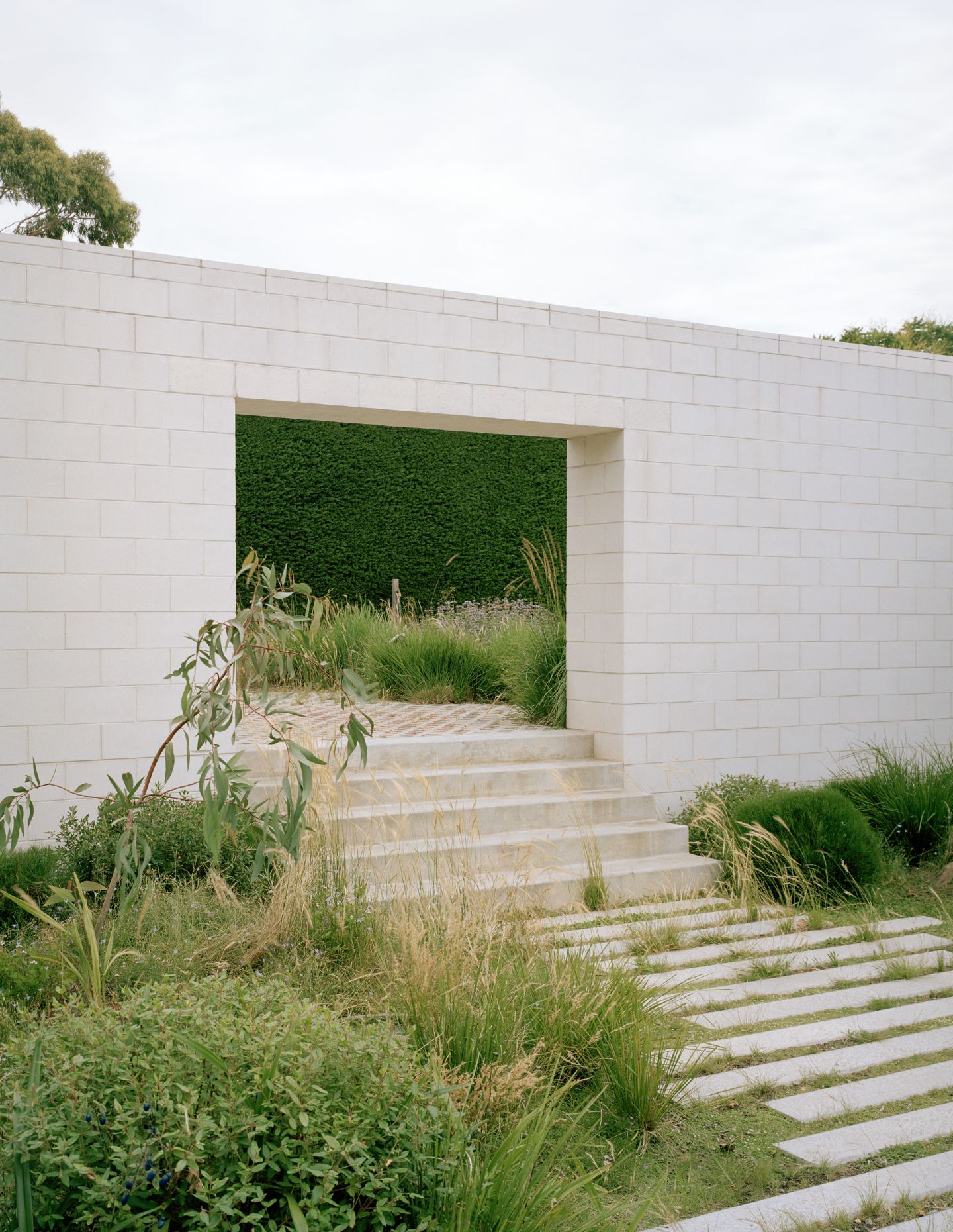 Rather than presenting a conventional façade, the house meets the street with a tall sculptural hedge. It’s an instrument that sets the tone for a sequence of outdoor rooms and establishes the project’s key idea – that landscape leads and built form follows.