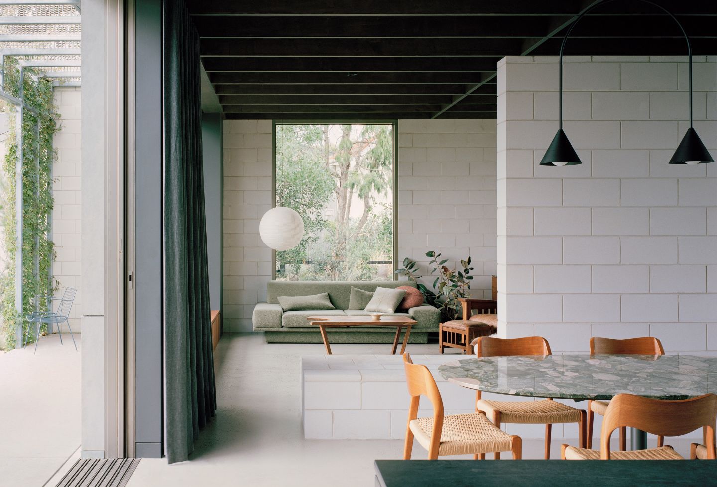 Materially, the house is robust and restrained. Solid blockwork gives weight to the garden walls and the east-west spine, while the arbour’s fine steelwork carries deciduous planting that acts as a living sunshade. The palette is deliberately low-maintenance and economical, channelling budget into the landscape infrastructure that makes the outdoor rooms legible and enduring. Inside, warmth arrives through timber and natural finishes, left in their most honest renditions.