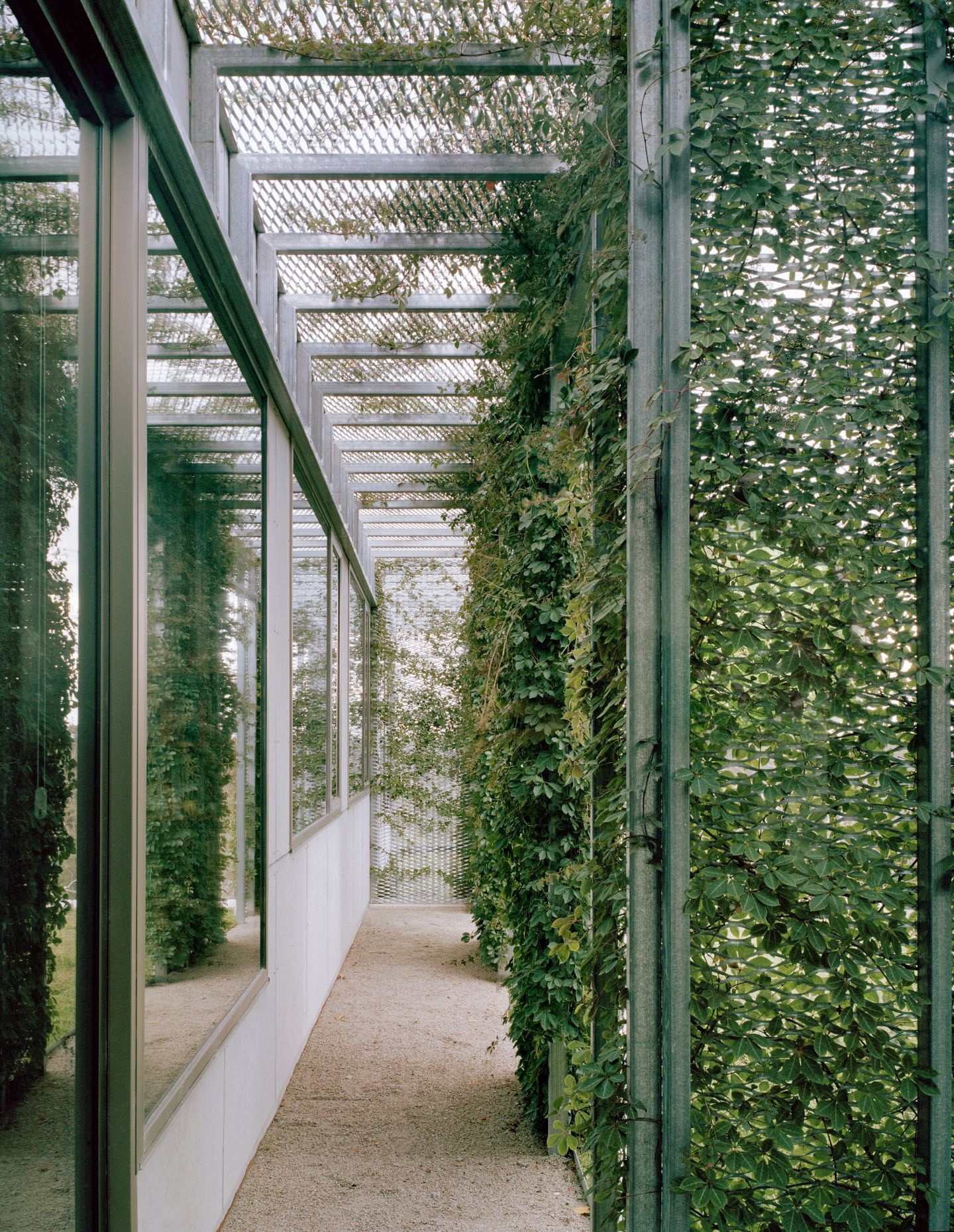 Behind it, masonry garden walls step the terrain and create a family of distinct courts, each buffered, contemplative or open to winter sun. Wrapping the northern perimeter of the dwelling is a delicate series of arbours with vines snaking over them. These arbours temper wind, while casting dappled shade in the summer and thinning back in winter. The whole composition reads as a layered veil that calibrates privacy, light and outlook.