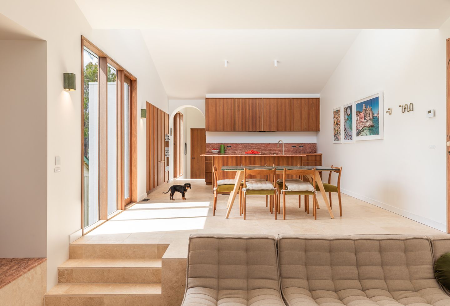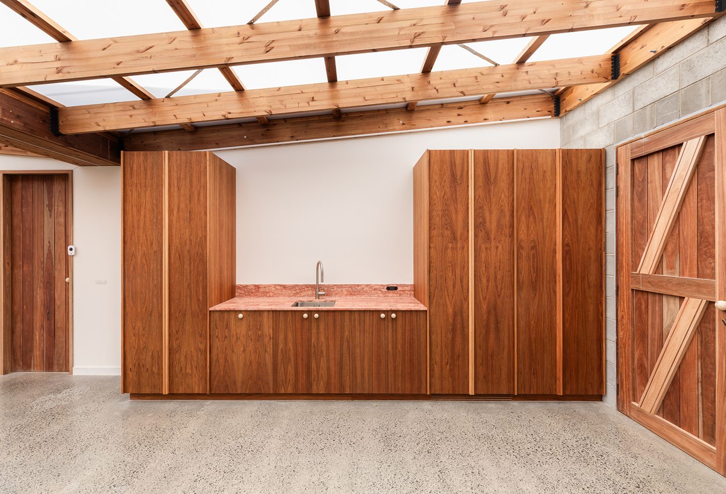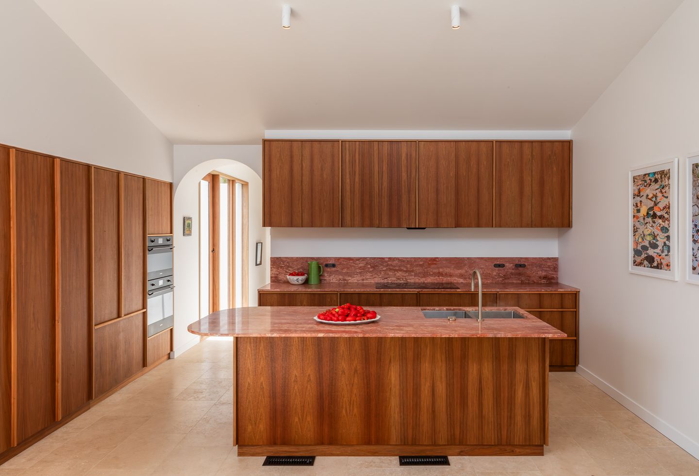 The open-plan kitchen combines Blackwood timber and pink travertine, its tones soft and natural. Above, the polished plaster ceiling follows the rhythm of the sawtooth roof, introducing variation in height and light.