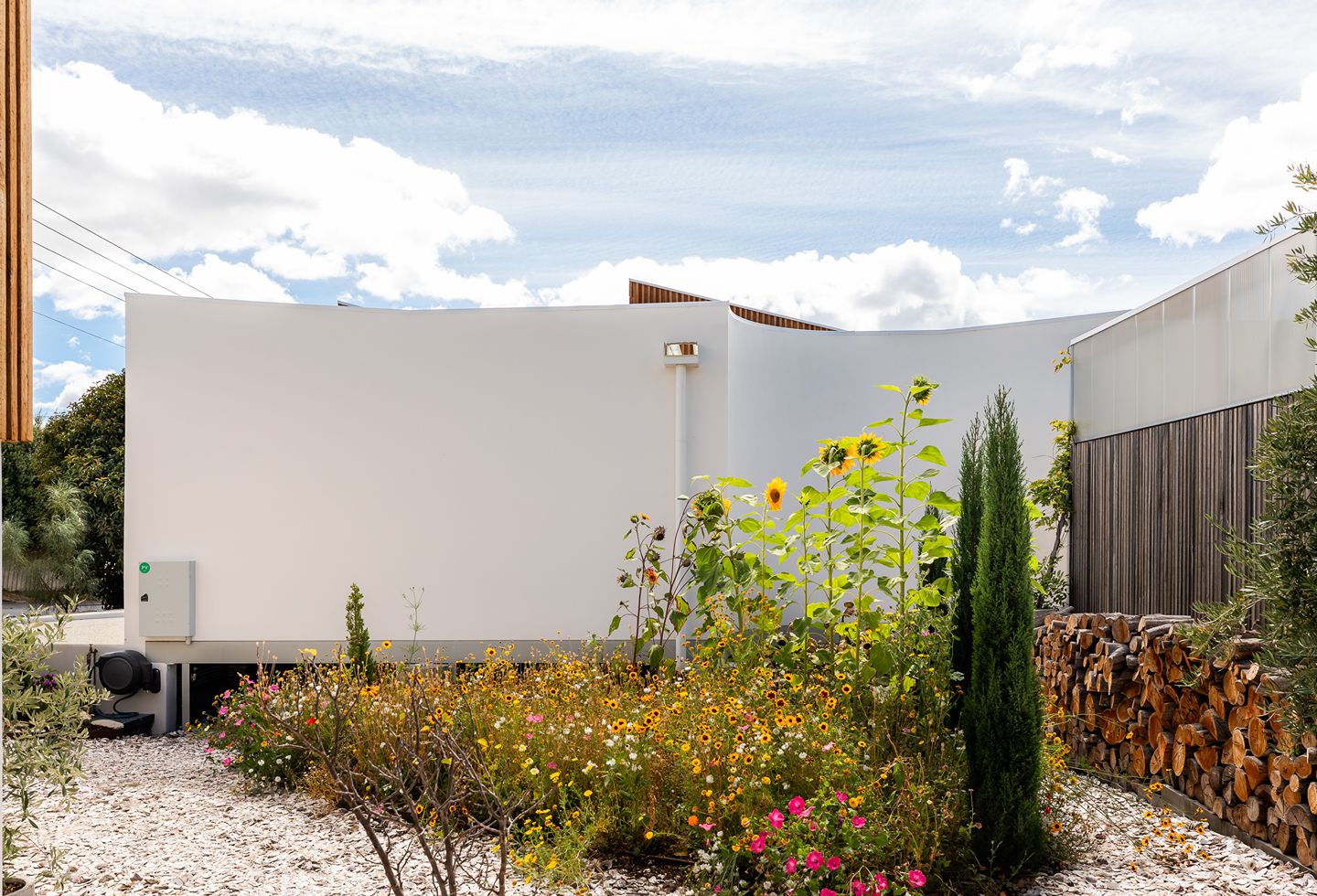 Soft curves and arches punctuate the design, from the rounded island bench and arched hallway openings to a curved exterior wall that gently delineates the boundary with the neighbouring property.