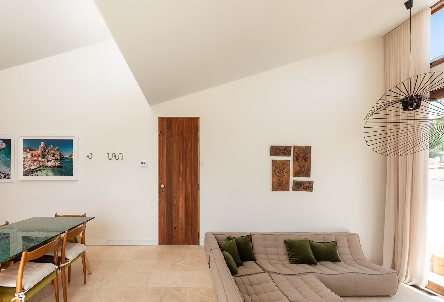 Next to the dining room, the sunken lounge invites family and friends to gather — two steps down into a relaxed space for conversation and quiet moments. This lowered zone extends the visual flow of the house, enhancing its spatial generosity.