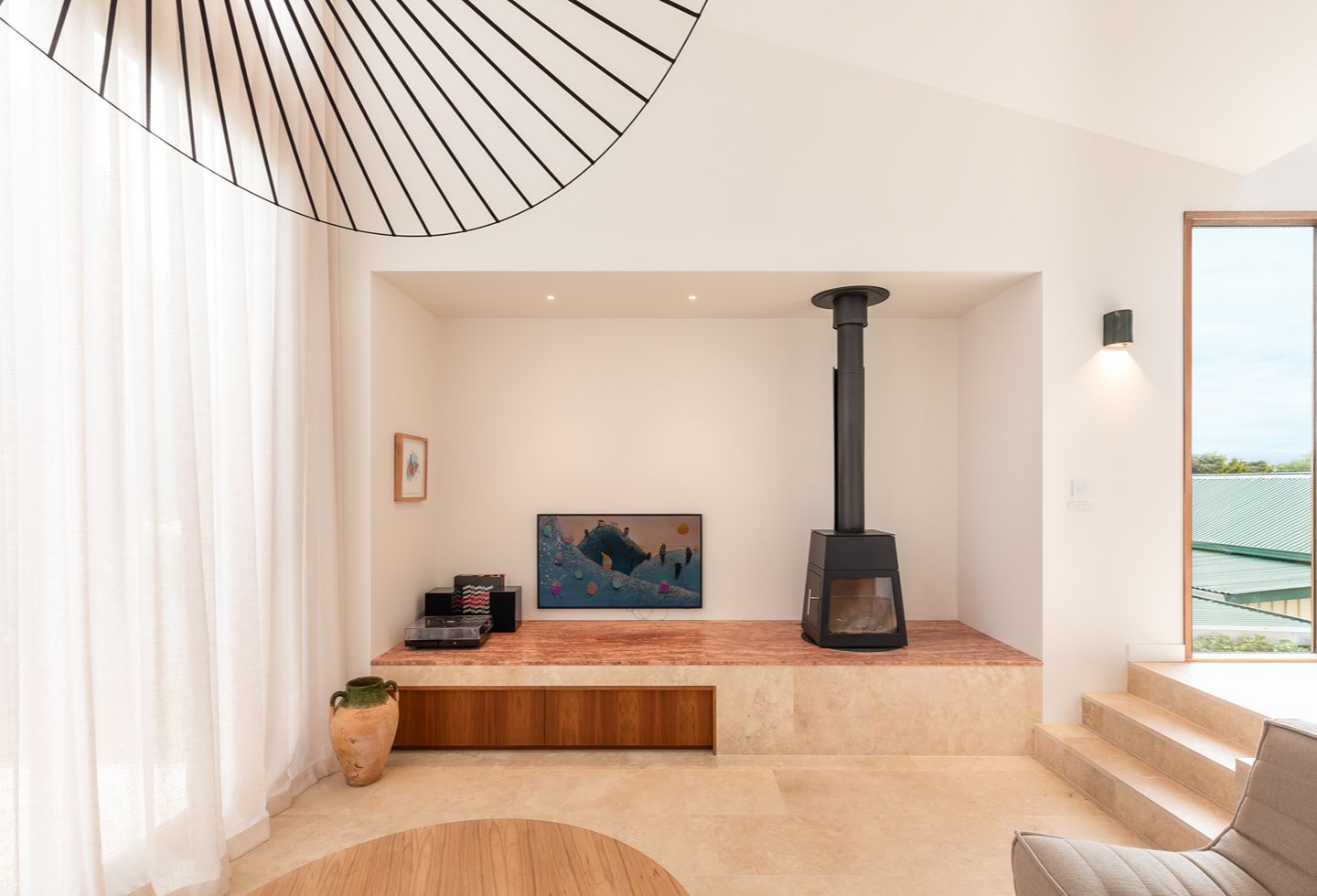Two Vertigo pendant lights hang above the coffee table, drawing the eye and anchoring the living space. A black steel Shaker fireplace, positioned on a low bench, adds warmth and sculptural presence, perfect for Hobart’s cool evenings.