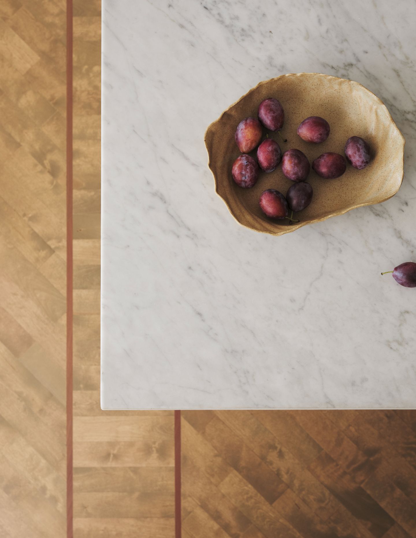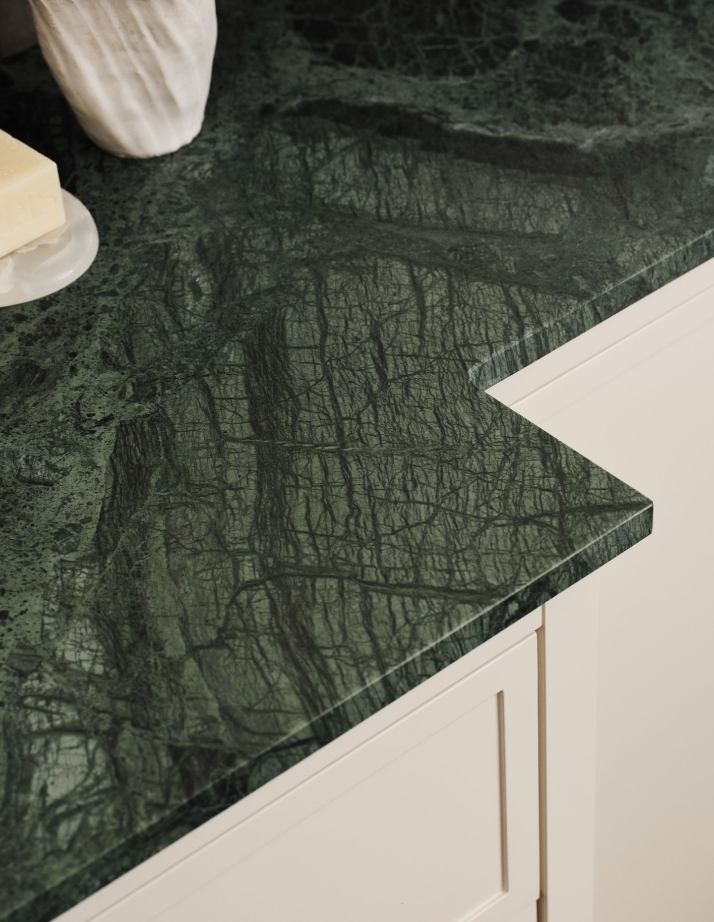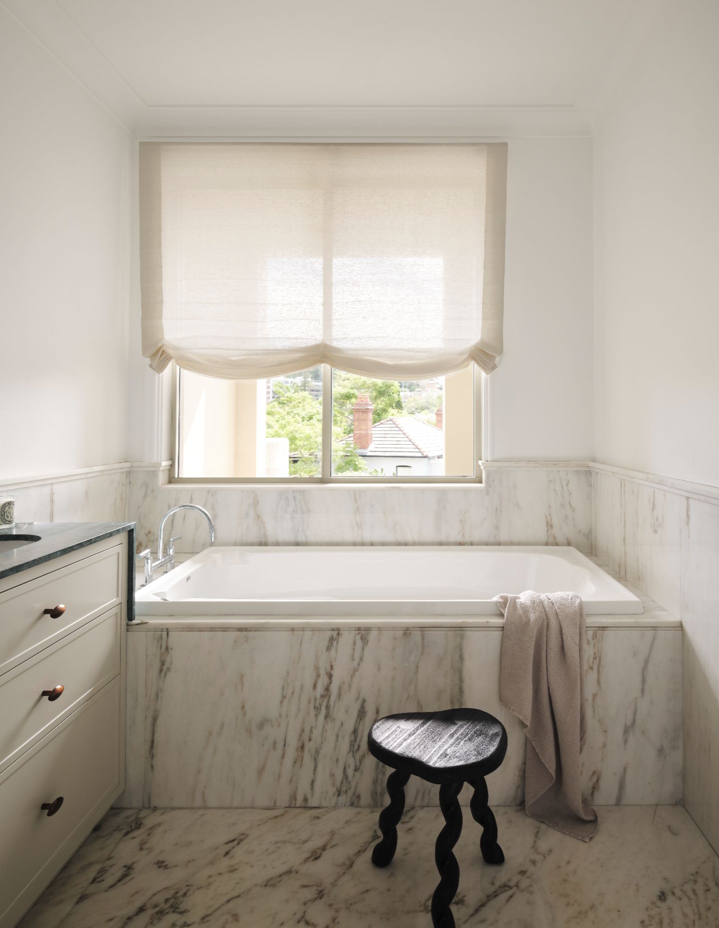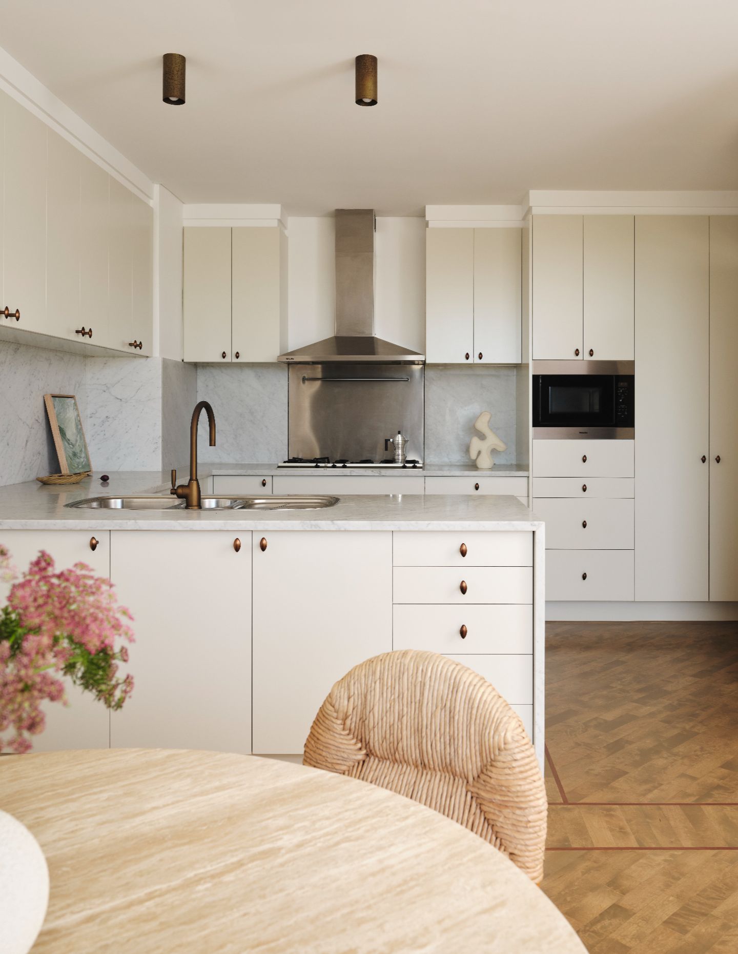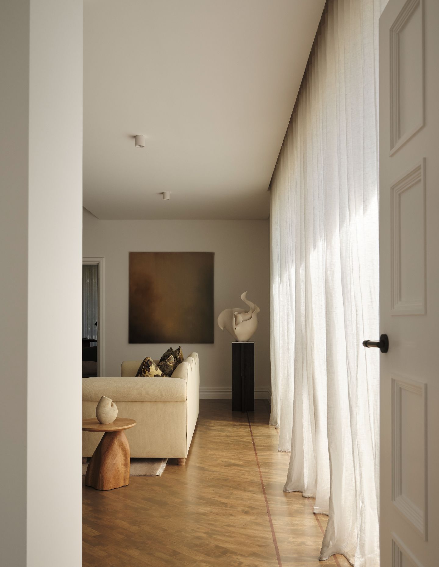 Across the 275-square-metre apartment, the restored parquetry floor becomes the tonal anchor. Painstakingly reconditioned, it reintroduces warmth and continuity throughout the home, setting the pace from the entry onward. In wet areas, slimline Green Guatemala marble vanity tops and Bisazza glass mosaics bring depth and refinement without visual excess, paired with crisp fixtures and custom cabinetry designed for longevity. Sheer linen drapery, new stone surfaces and warm timber detailing temper the bright northern light and reinforce a calm, tactile sequence through the main living zones.