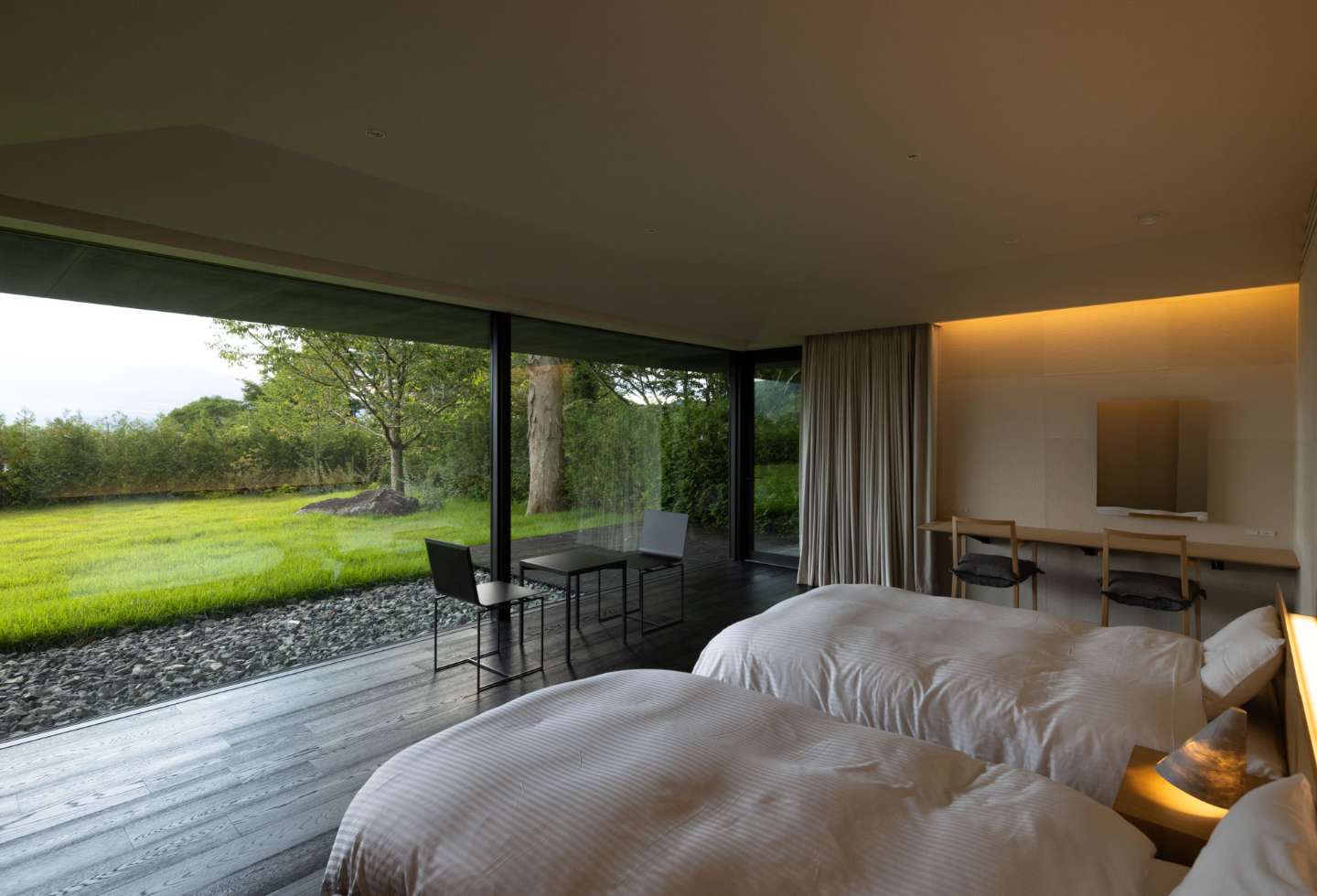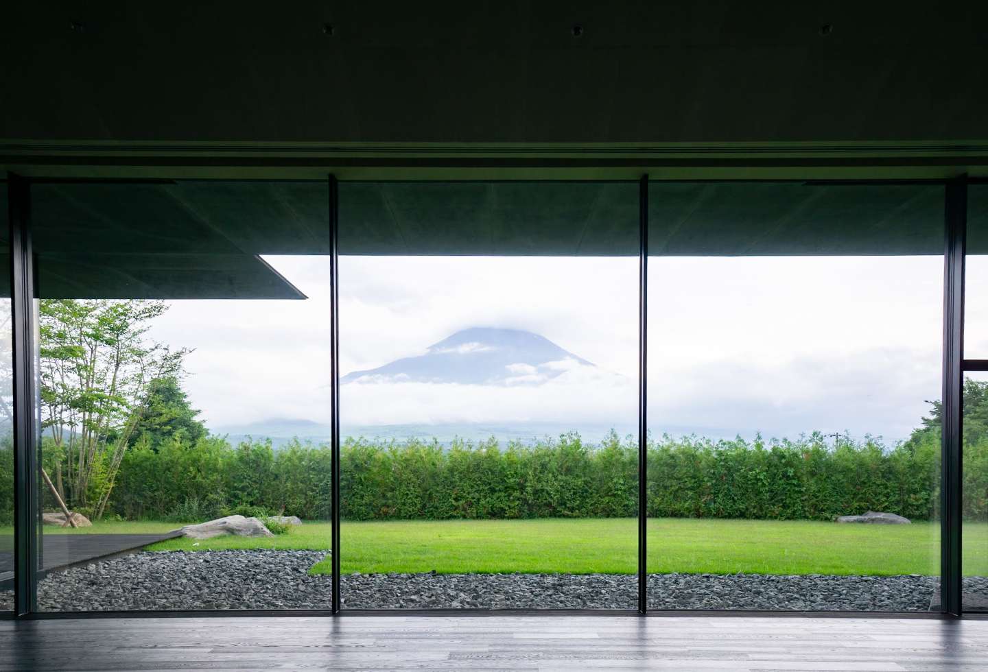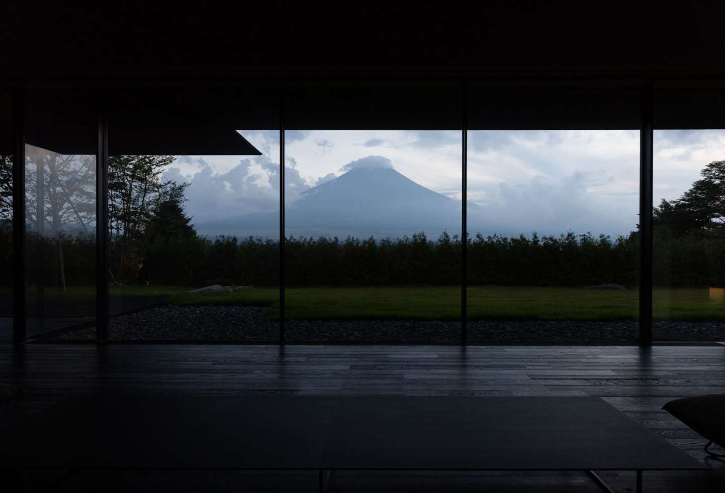 The rectangular format of the house sees all spaces positioned to face Mount Fuji through floor-to-ceiling glass windows that evoke shakkei, a Japanese traditional architectural term meaning ‘borrowed scenery’ (to visually incorporate an adjacent or distant exterior view into the interior).