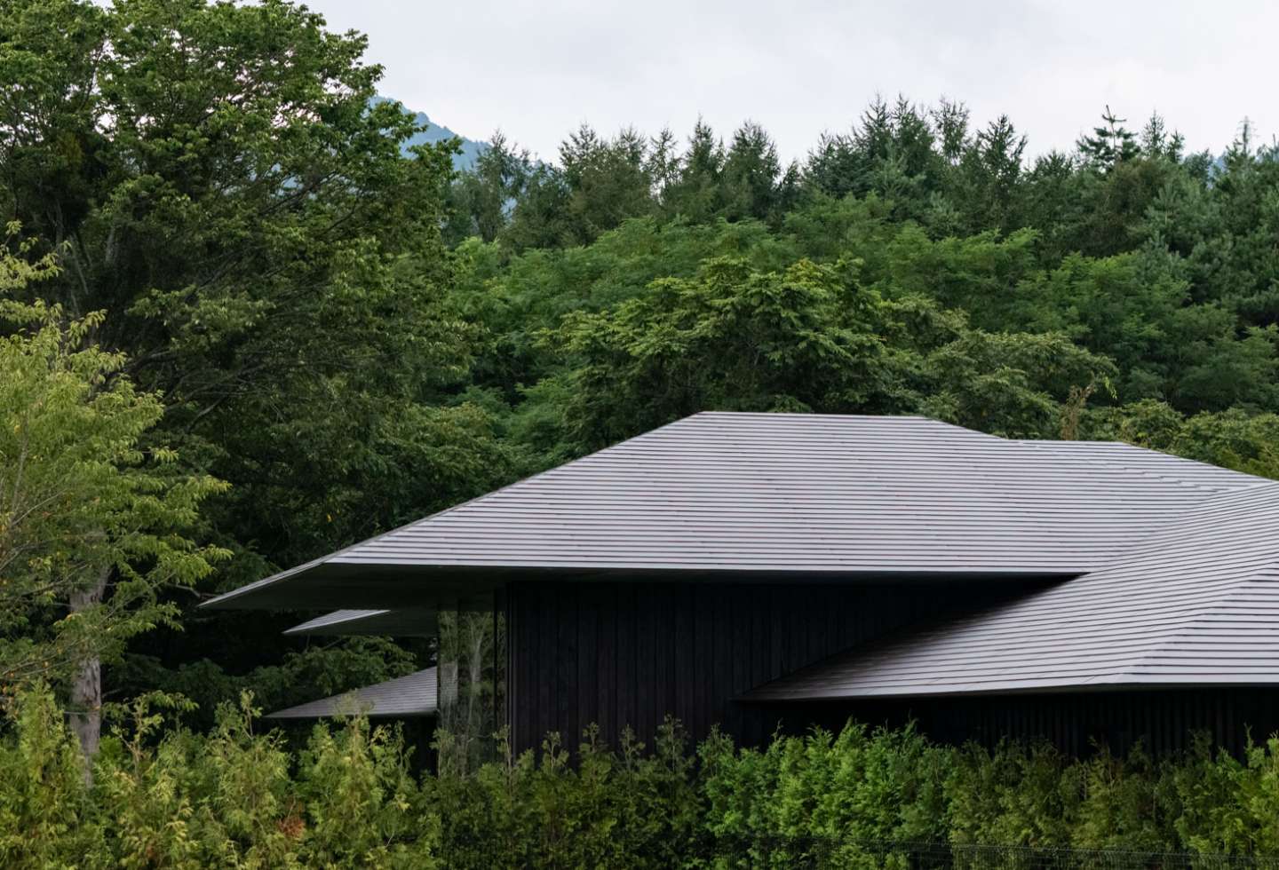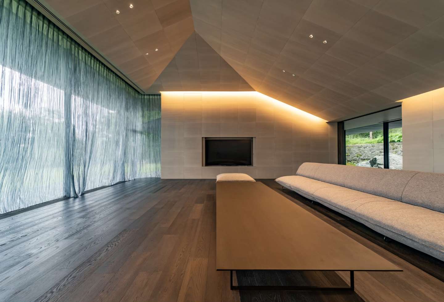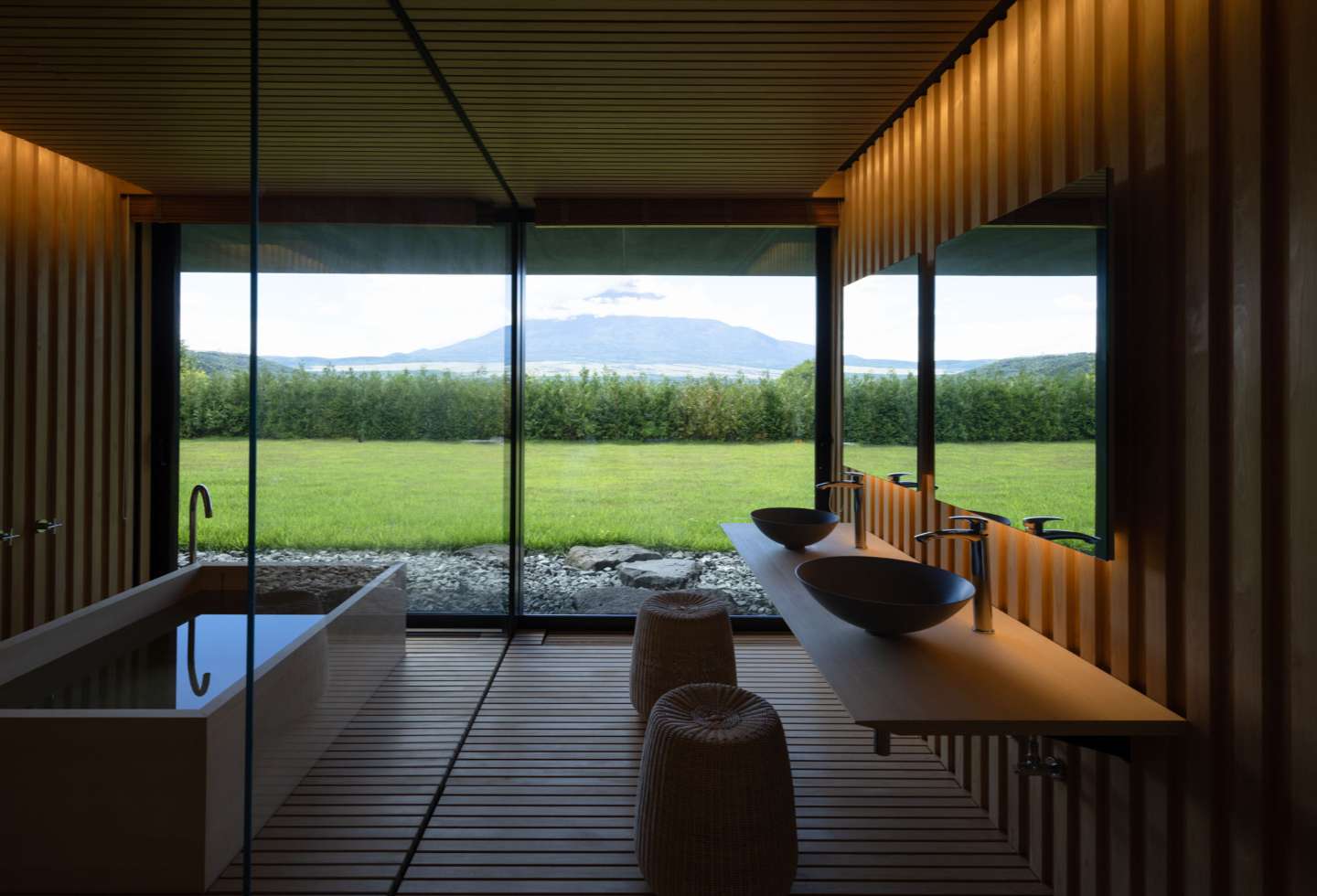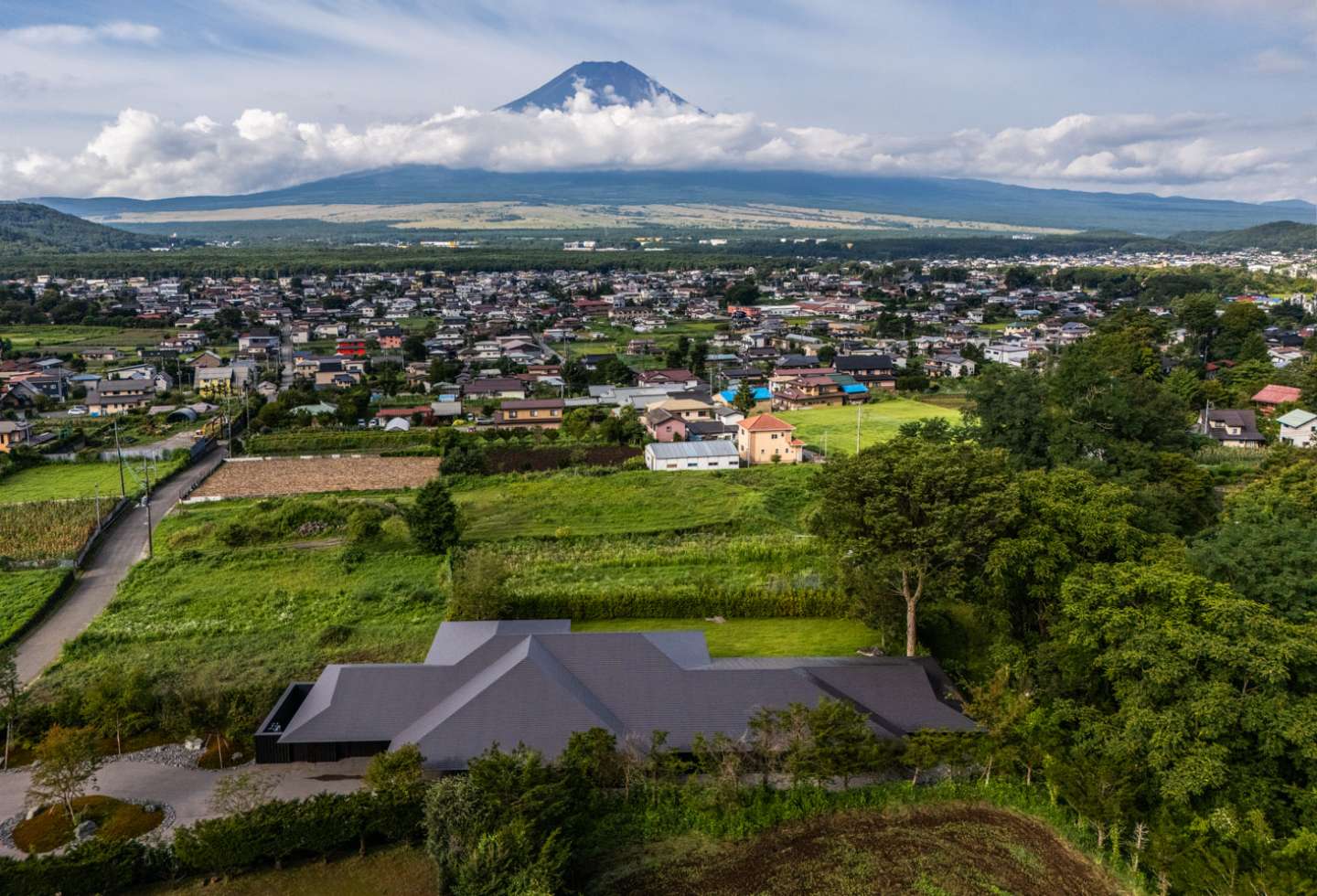 The design prioritised capturing the full form of the iconic mountain. “The villa was designed to overlook Mount Fuji,” notes architect Kengo Kuma. “This was the client’s one and only request – to set a place where his wife can view Mount Fuji, which holds a fond memory from her childhood.”