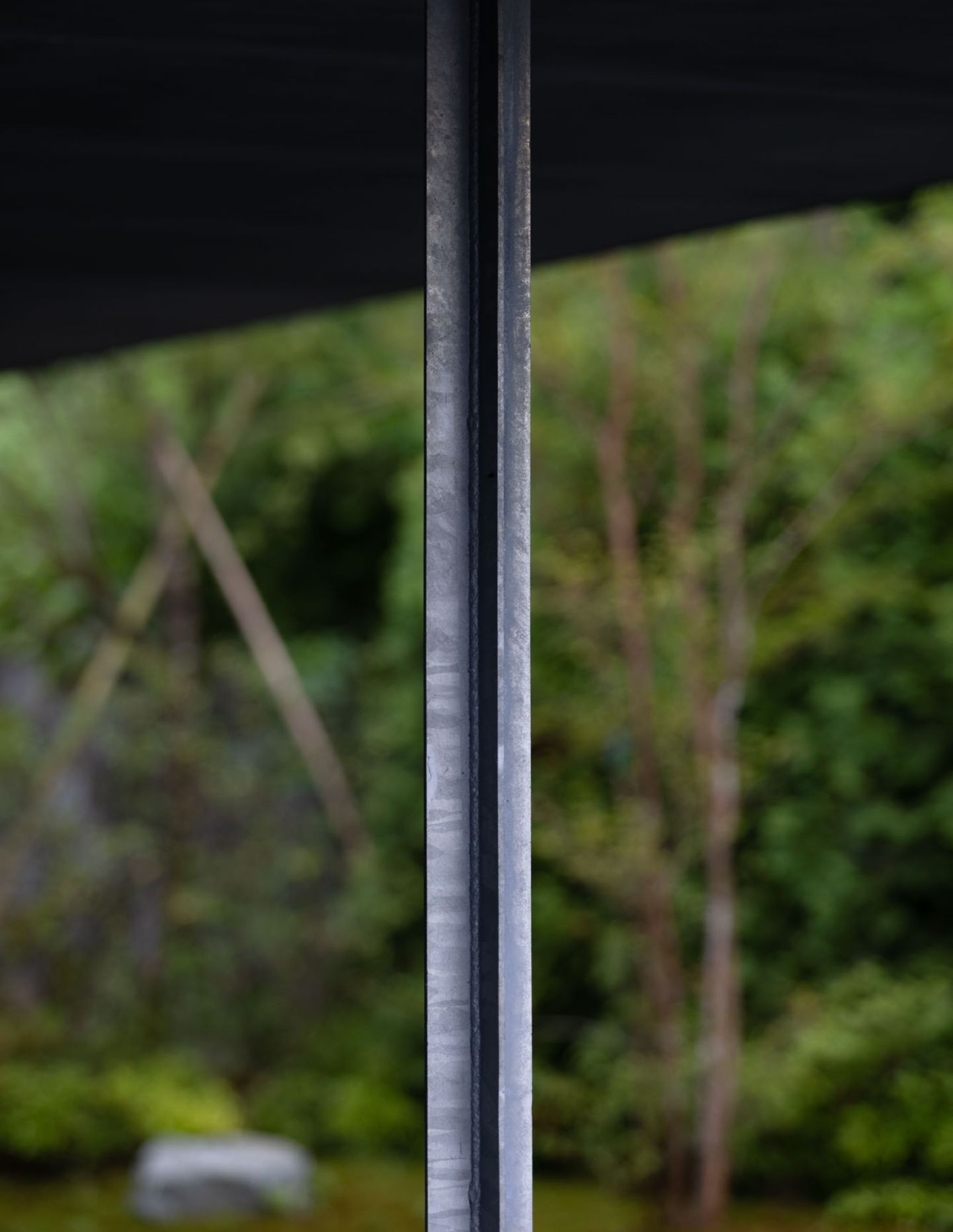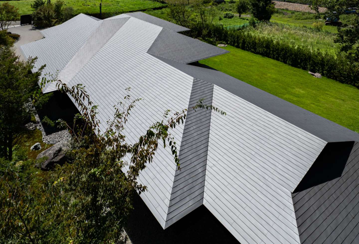 The low-slung minimalist building features a series of extended roofing and ceiling planes creating an elongated and refined silhouette, aimed to create a continuity between house and garden. The distinctive metal roofing is comprised of folded aluminium panels, a specialist technique interconnecting individual 0.5mm-thick pre-painted galvalume steel sheets secured through being folded onto the other. These interconnected panels allow for a roofing line that can be aligned on any slope, in addition to water resistance and high winds.