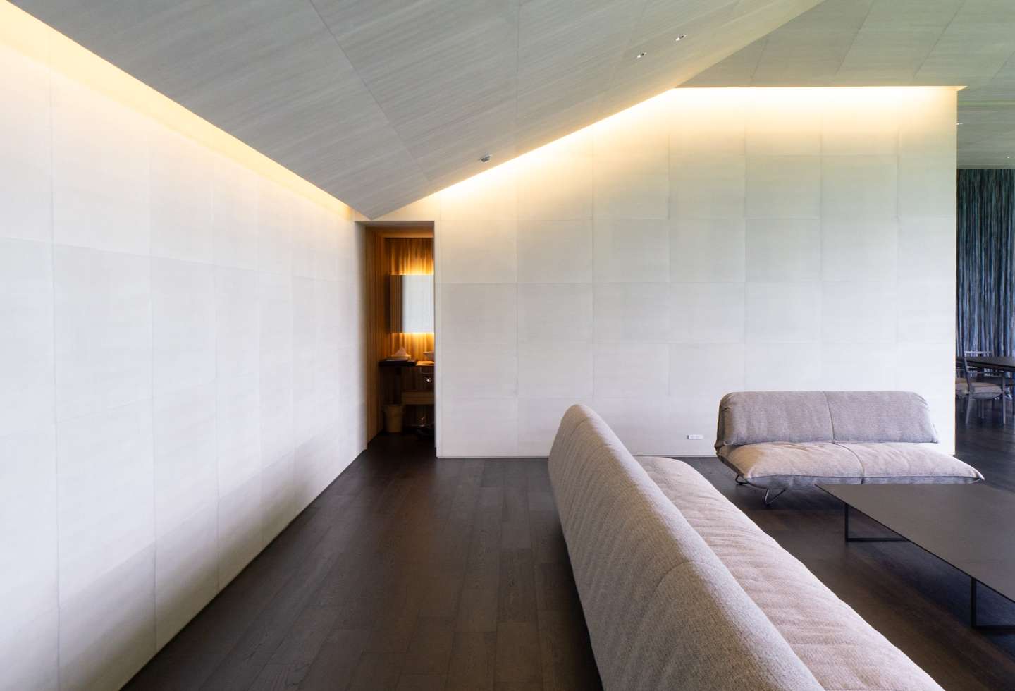 KKAA oversaw a neutral interior with textural details. Room walls were finished with washi handmade paper embedded with charcoal crafted by Japanese artisans. Other rooms feature Japanese sugi cedar wood. The central multipurpose room’s soft grey lounges were designed by Kengo Kuma in the ‘MA’ series from the Kengo Kuma Collection by Time & Style. To match the dark brown flooring, the chair legs were customised in a black finish.
