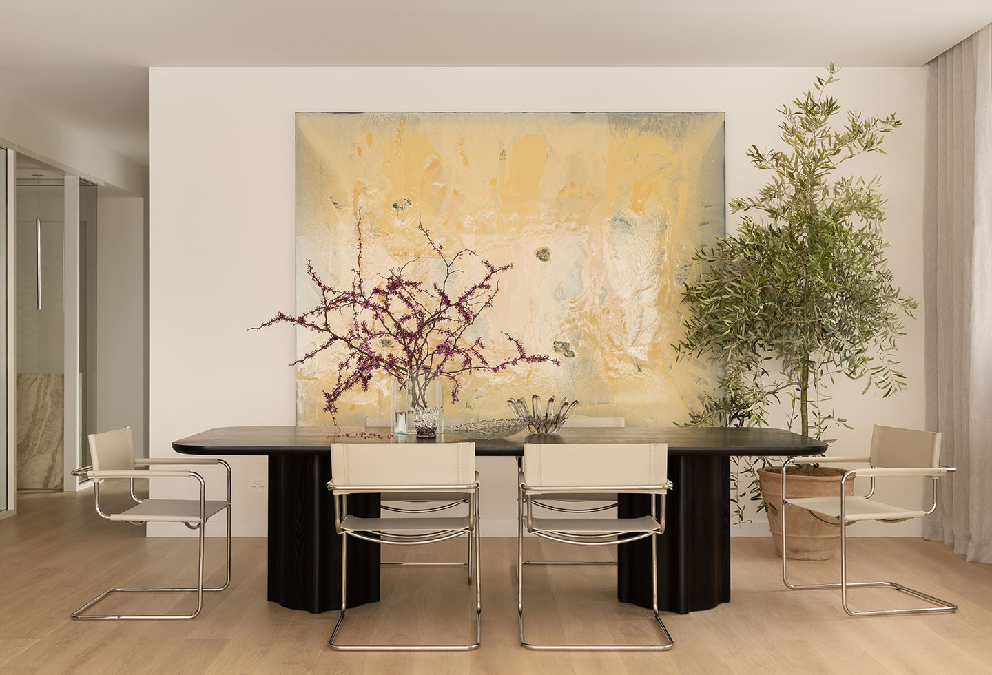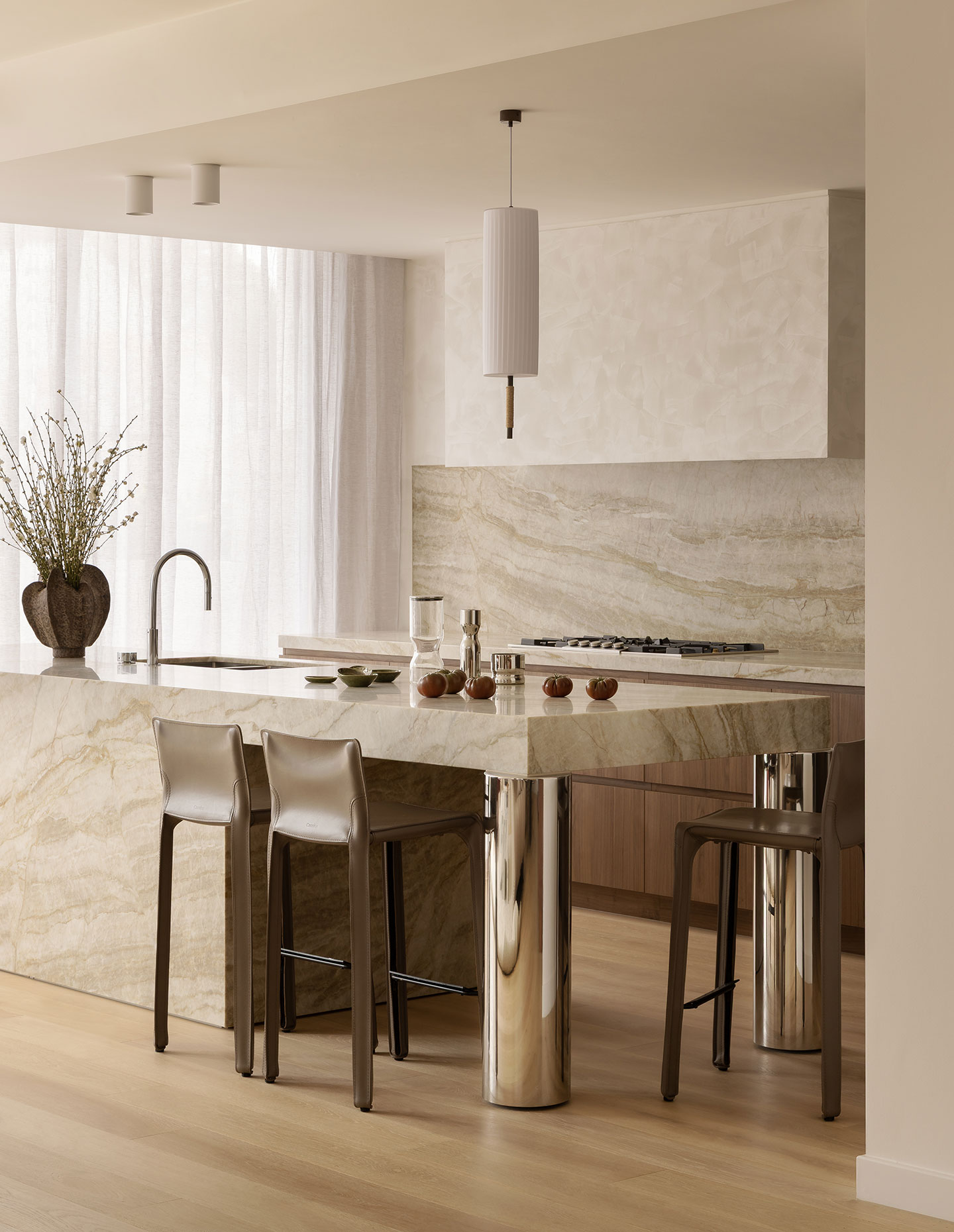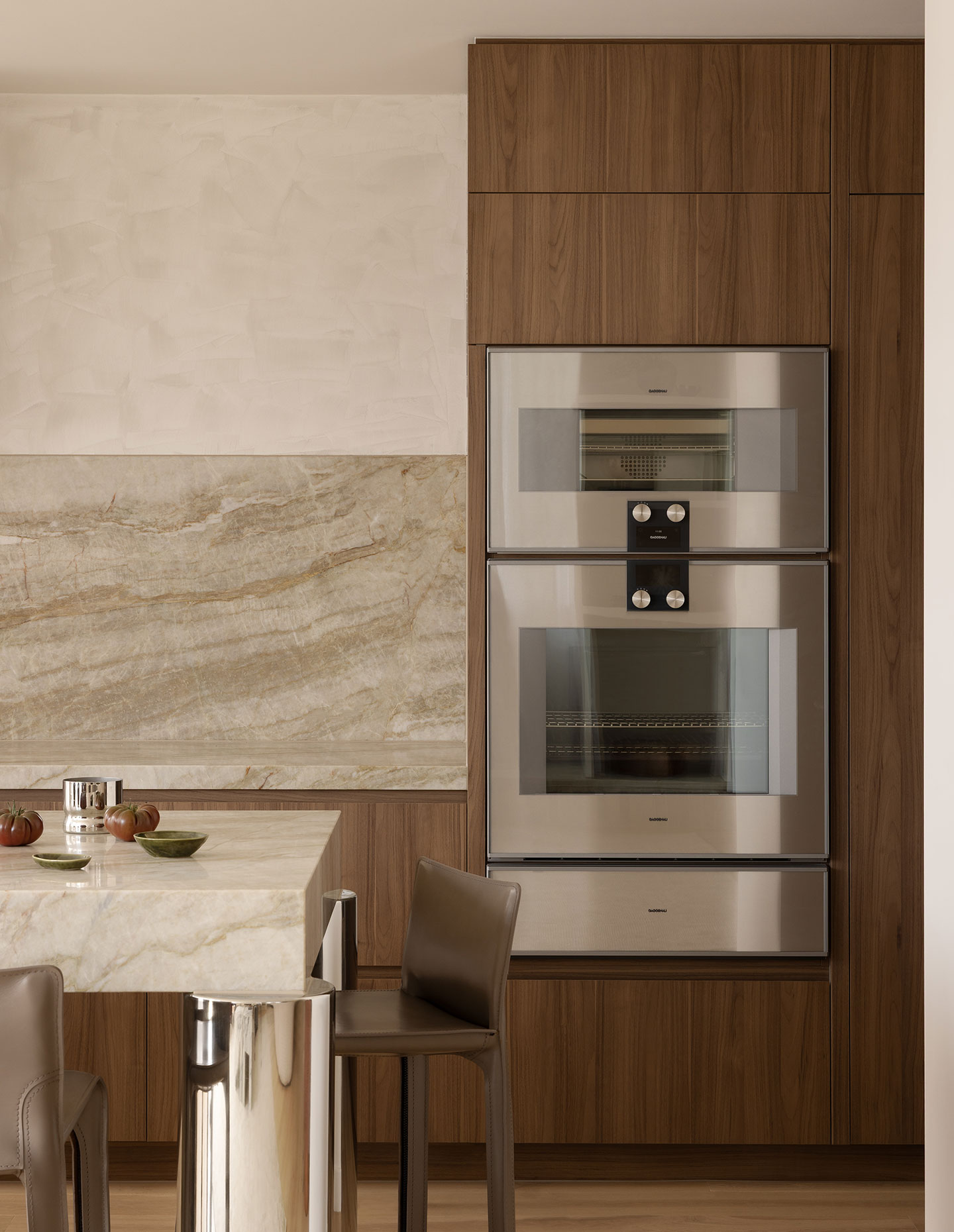 Material choices are a particularly important factor. They include striking usage of natural stone in the kitchen setting, where monolithic Taj Mahal stone kitchen island slabs rest on single chrome columns in something of an homage to past modernist masters. Then there are the exaggerated splashbacks, timber cabinetry and hanging pendants as well as integrated Gaggenau fixtures. Elsewhere, wool and French oak feature, while refined detailing in general is ever-present.
