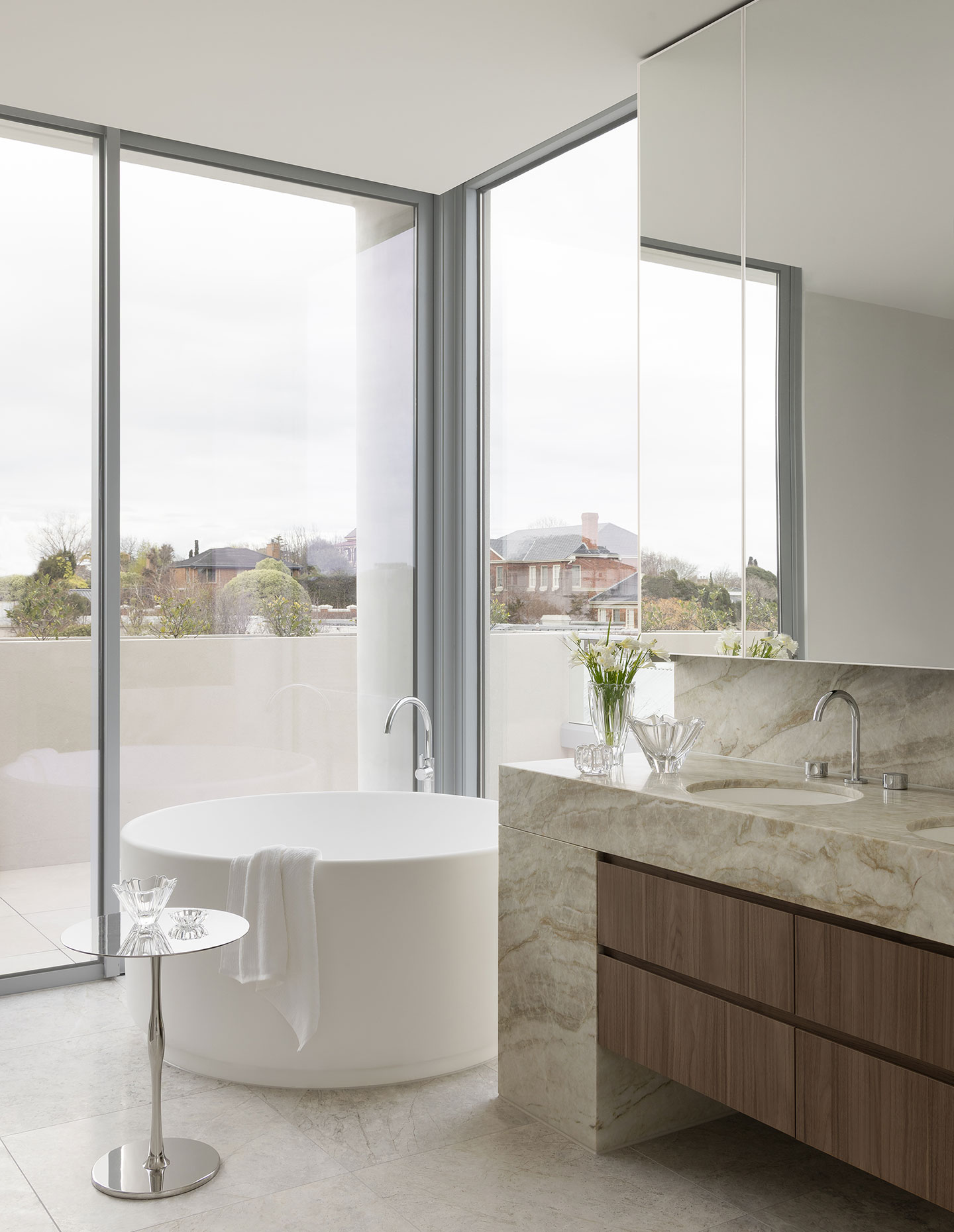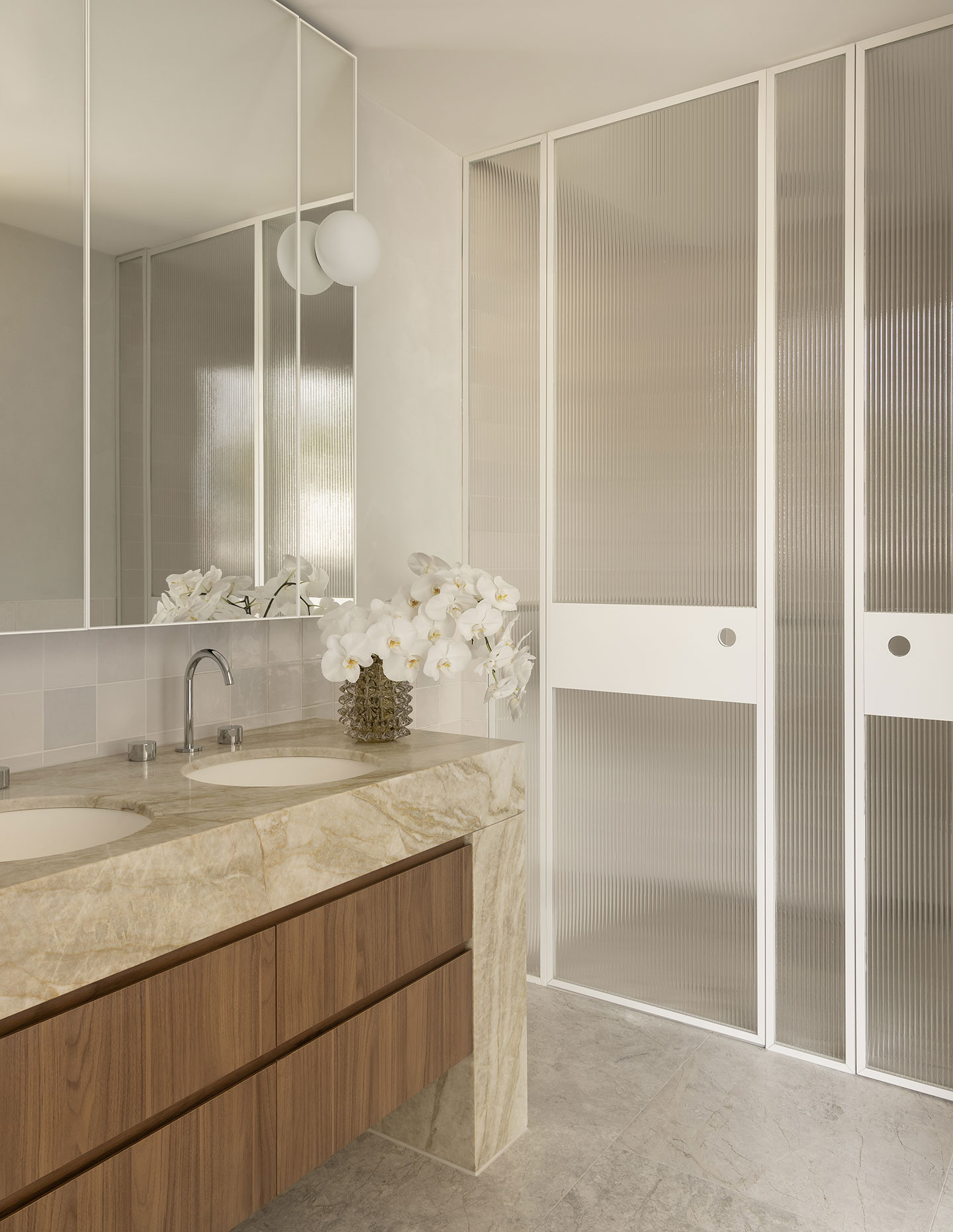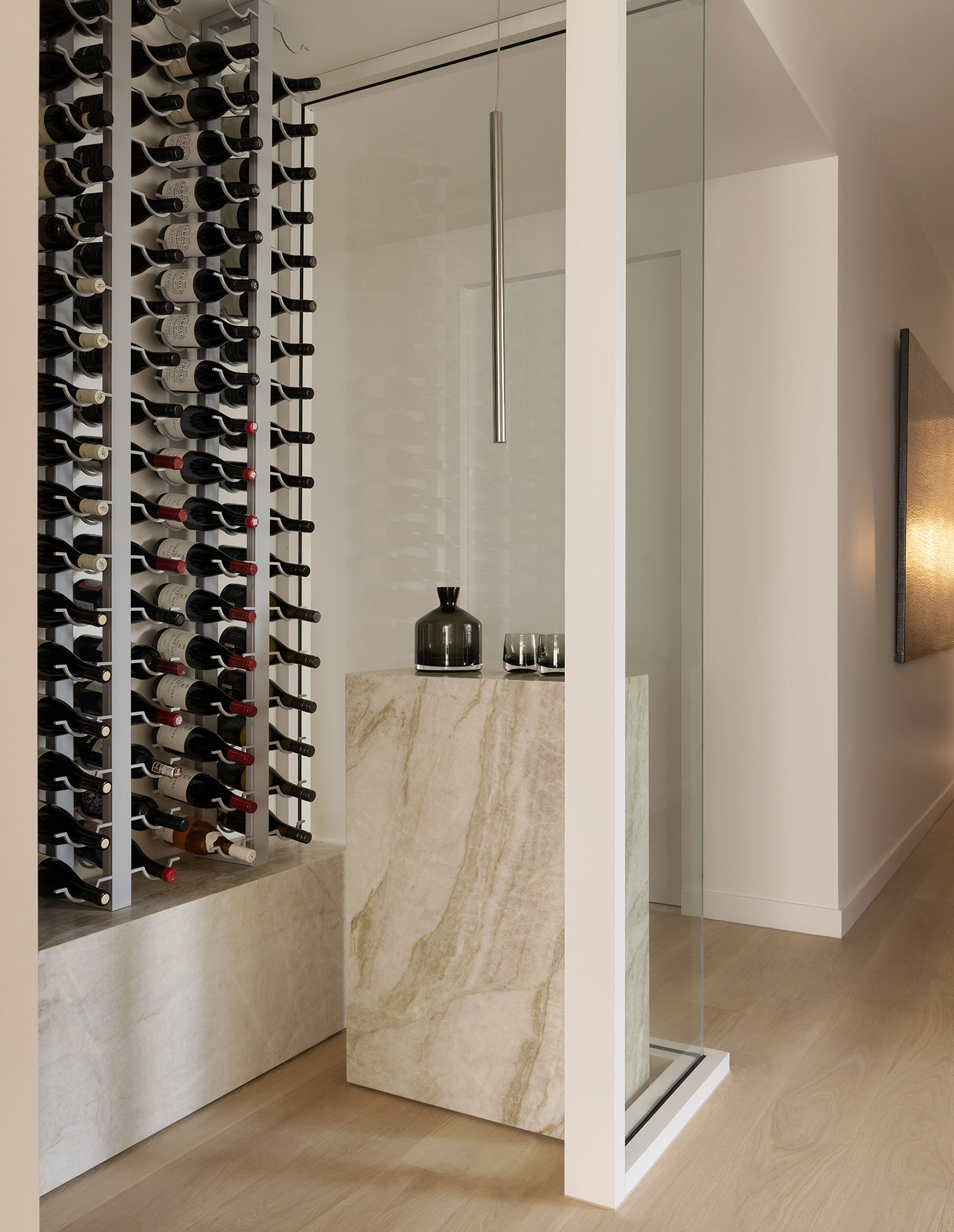 Bespoke wine cellars make use of glass and stone to add further touches of luxury. Balconies, however, provide an outdoor focal point, generously sized and designed to bring light and garden views indoors. They also balance privacy, while the bedrooms feature soft drapes, wool carpeting, upholstered bedheads and warm timber cabinetry with sculptural door handles. Finally, the bathrooms round off the sensitive use of materials and textures throughout with their handmade ceramic tiles and natural stone flooring.