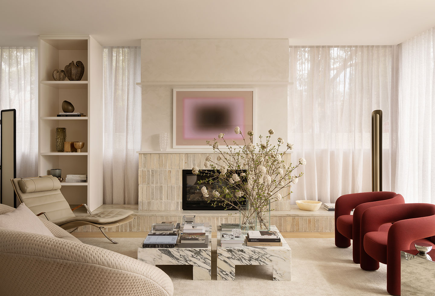 “The large living and dining areas have custom designed stone-tiled fireplaces sit on matching stone plinths, framed by minimalist display shelving,” says Mim.