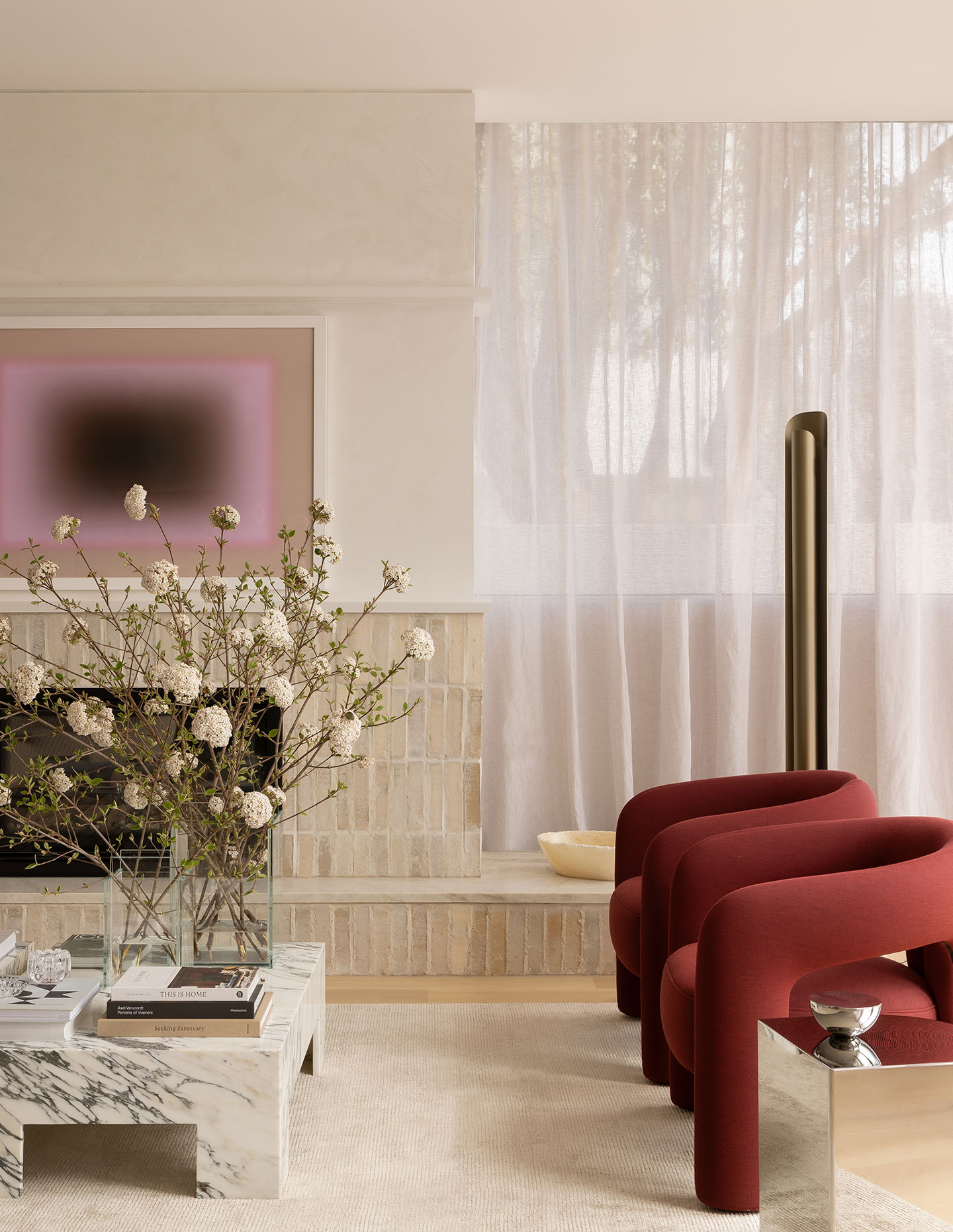 “Sheer floor-to-ceiling curtains soften the hard surfaces and complete this luxurious space. Subtly textured, earthy plastered feature walls – also in the kitchen – enhance the tonal material palette and keep the interiors light.”