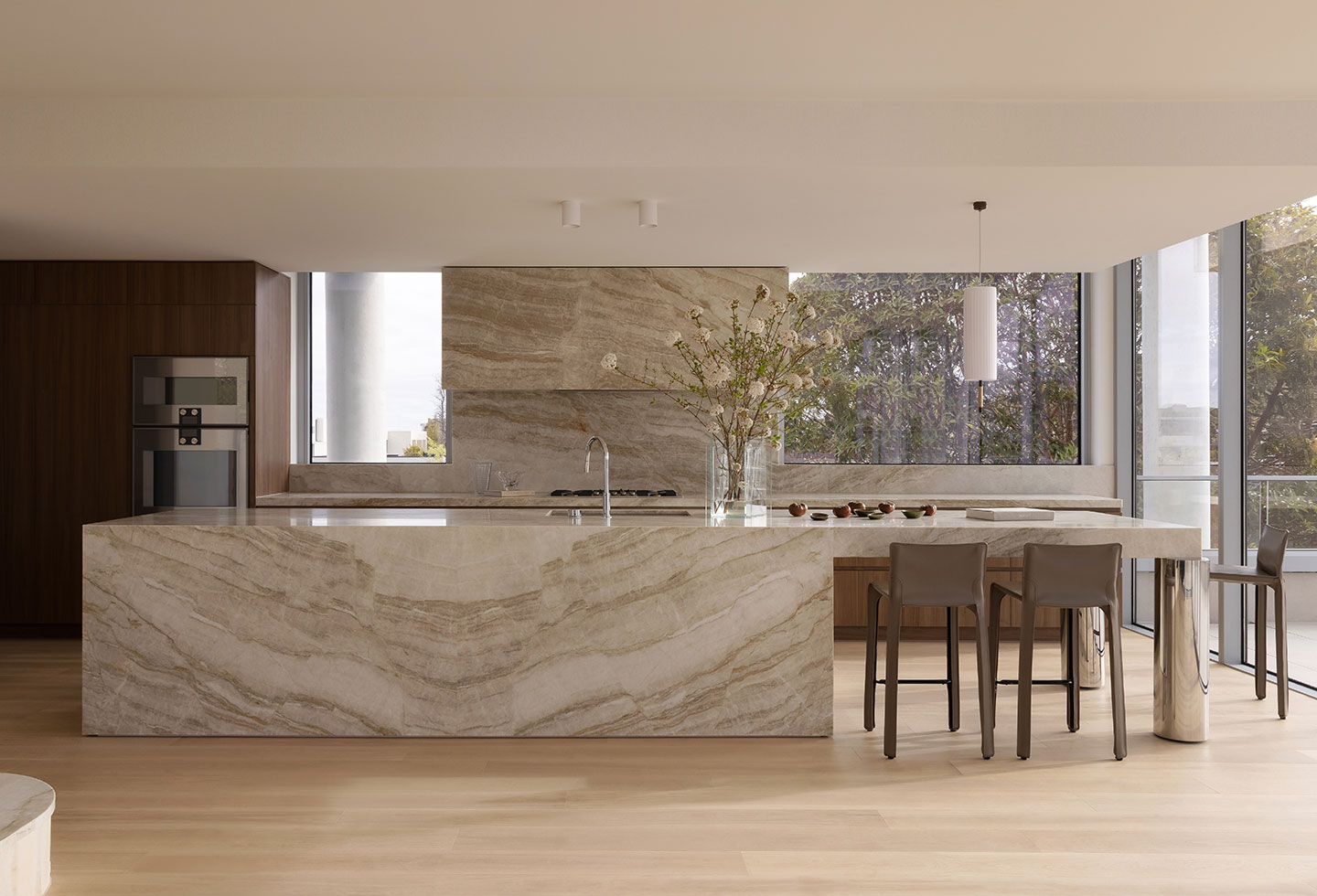 Senior Interior Designer, Gemma Dare, adds that “each generously proportioned apartment has been individually designed to honour internal aspect, flow, ventilation, natural light and views. From the entry corridors, the interconnected living, kitchen and dining spaces create a gallery-like thoroughfare that extends outwards through full-height corner glazing. Spaces exude calm through coastal-inspired materials, a maximisation of light, views and sea breeze through wrap-around windows and landscaped balconies.”