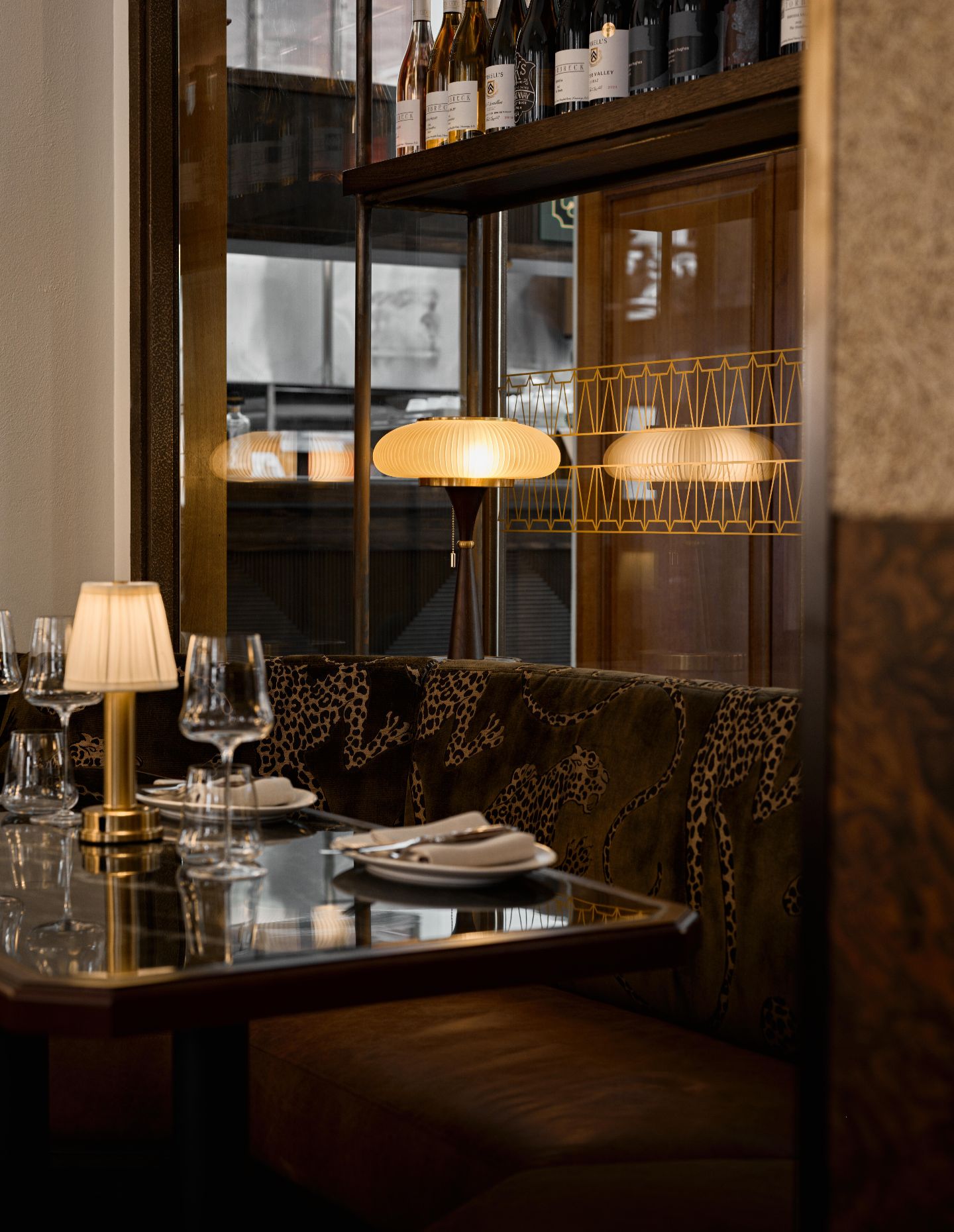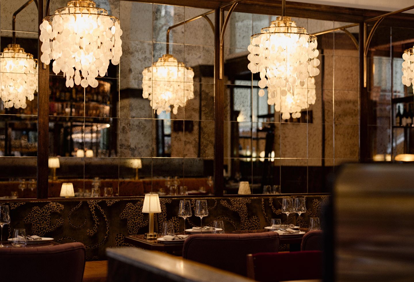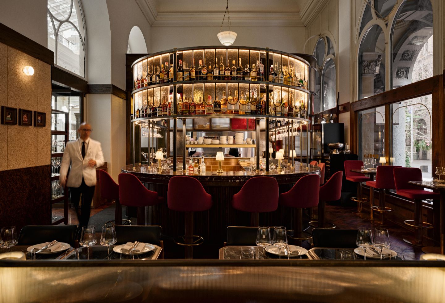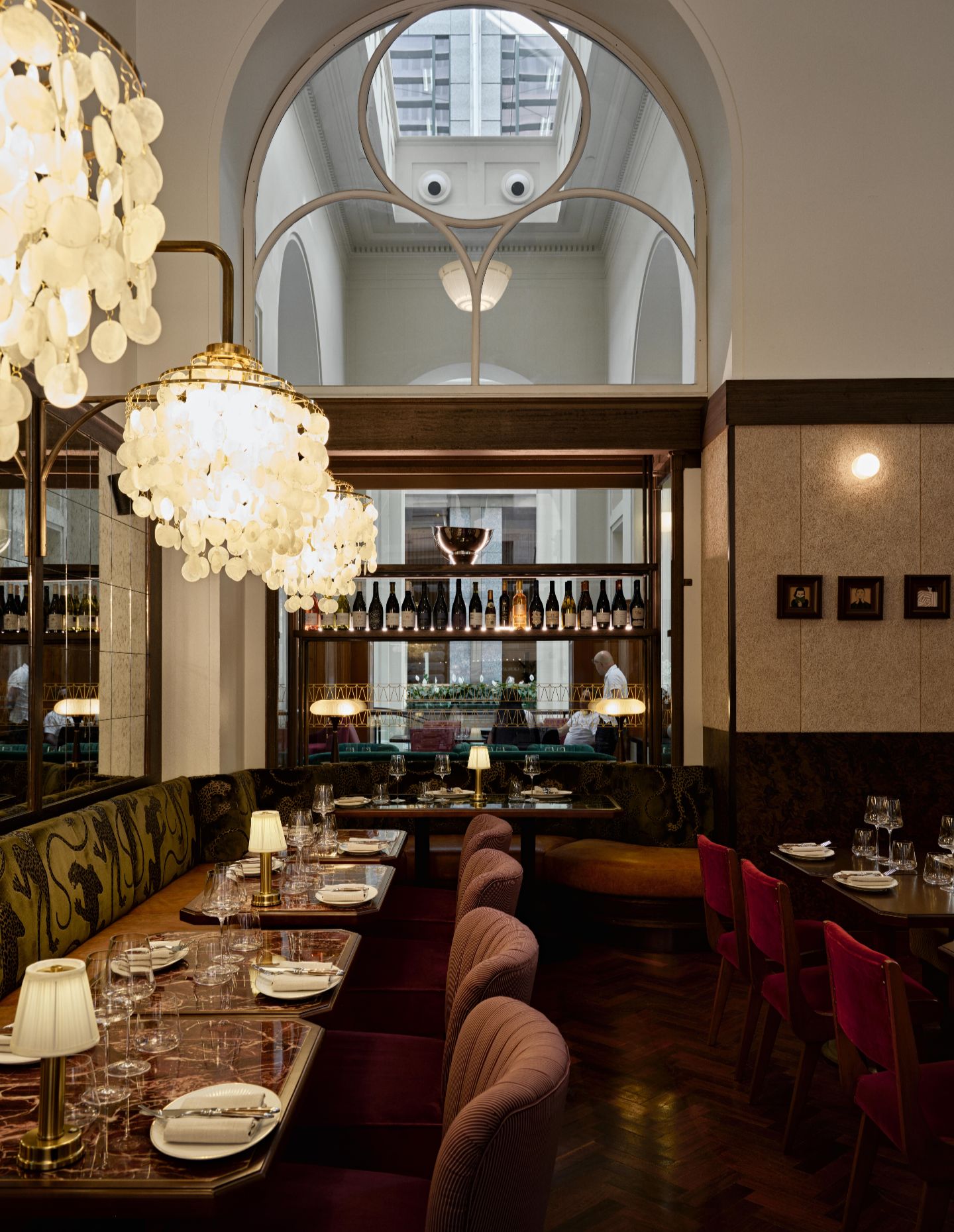 Lighting further enhances this sense of considered luxury. Natural light floods through the floor-to-ceiling windows from Martin Place, while the internal hotel lobby provides illumination from the opposite side. “The building provided the perfect lighting environment,” Krelle notes. Warm light from elegant chandeliers reflects beautifully in the gridded antique mirror lining the back wall, while small table lamps provide perfect reading light for menus.