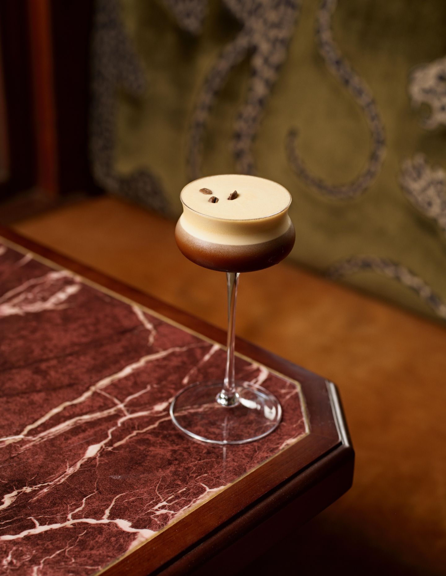 The bar became the design’s anchor point. Circular in shape and crafted from solid Blackbutt timber, it not only caters to the back-of-house areas but, through its sculptural presence, grounds the soaring space. An abundance of spirits and liquors line deco-inspired frosted-glass shelves. Behind, dazzling panels of dark amber, copper red and champagne tones conceal the kitchen and add visual intrigue. Krelle describes the overhead display effect as having “an almost European-luxe train-travel quality with the scalloped glass.” The Rosso Levanto marble bar counter is paired with highchairs upholstered in plush, deep maroon velvet, establishing an elegant material palette that resonates throughout.