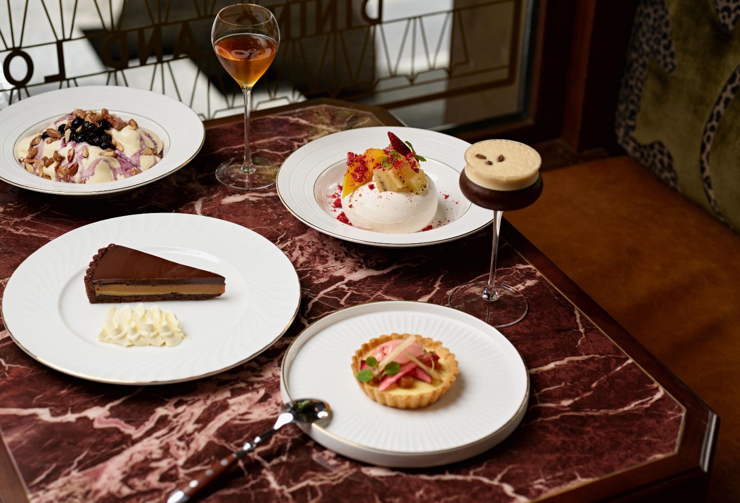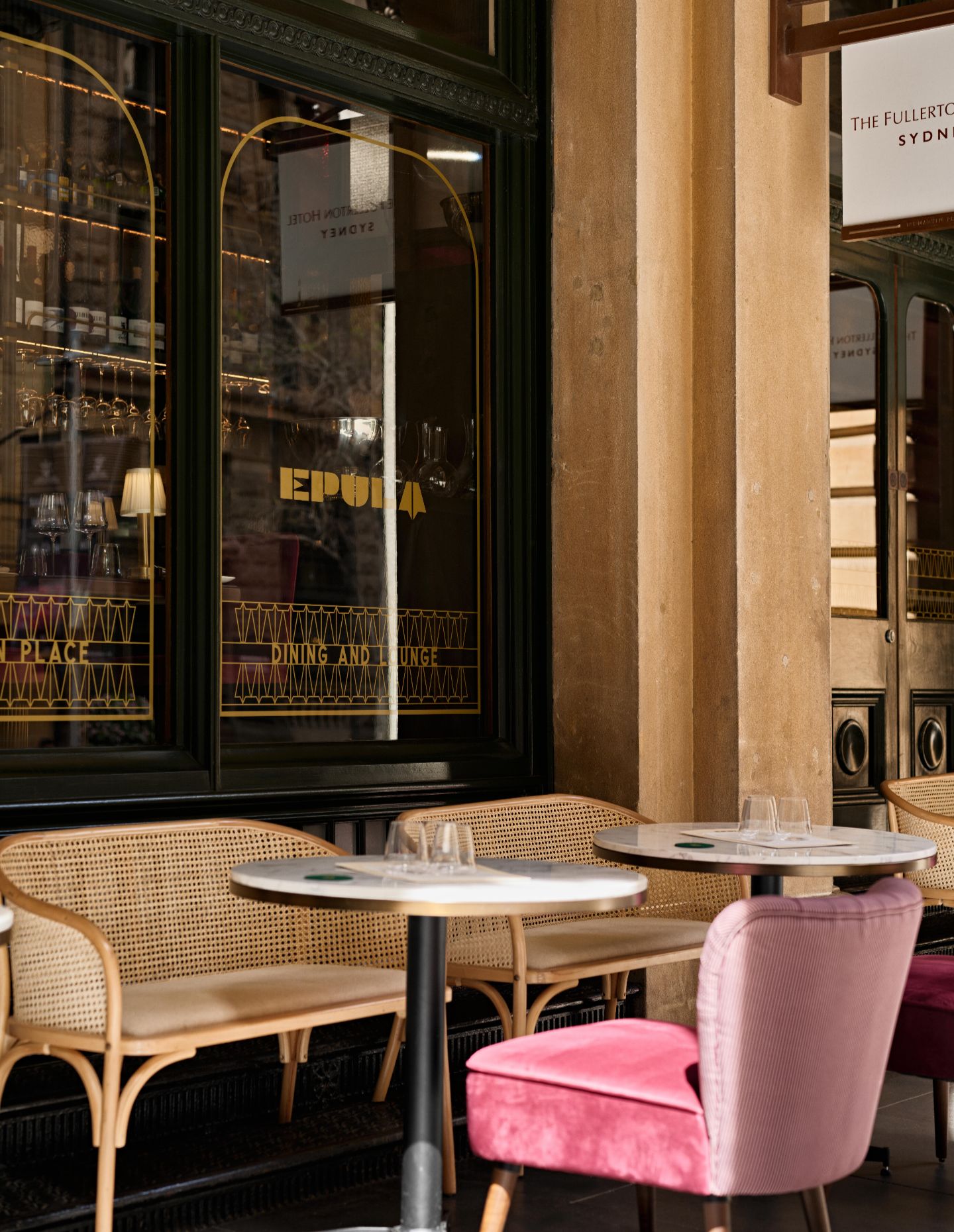 The restaurant unfolds across three distinct zones: outdoor dining along Martin Place’s historic colonnade, the main interior dining room and a spacious area that extends into the GPO itself, which can be accessed by the Fullerton Hotel lobby and serves guests with coffee and pastry at breakfast. Featuring deep green velvet banquette seating and bentwood chairs, the effect is intimate and elegant amidst the grand internal volume.