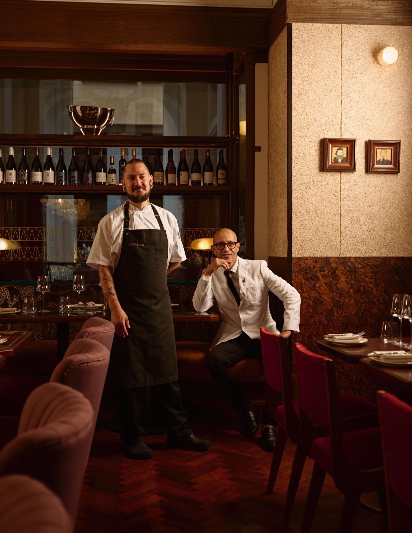 Seating and table arrangements demonstrate thoughtful flexibility. Built-in banquettes upholstered in Mokum’s Panthera Olive fabric and caramel-hued Kvadrat Maharam fabric (Phox by Raf Simons) add warmth and maximise floorspace efficiency. Tables topped with green granite can be easily separated for intimate twos or fours, or grouped for larger parties, while high tables provide additional options for patrons. Recessed vitrines – original wall indentations thoughtfully retained in the design – house wine storage above banquettes, while intricate paintings from Dilernia’s private collection add charm.