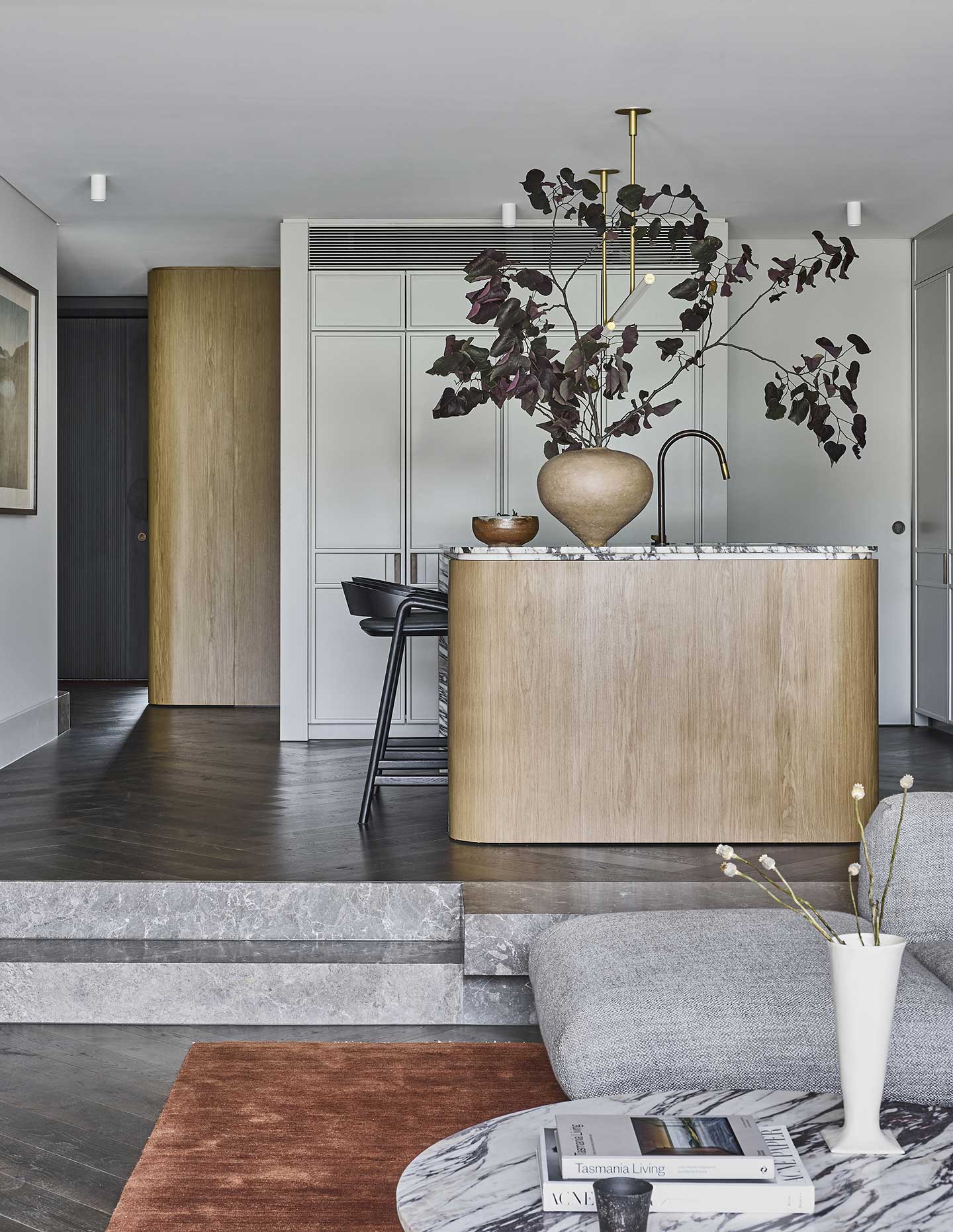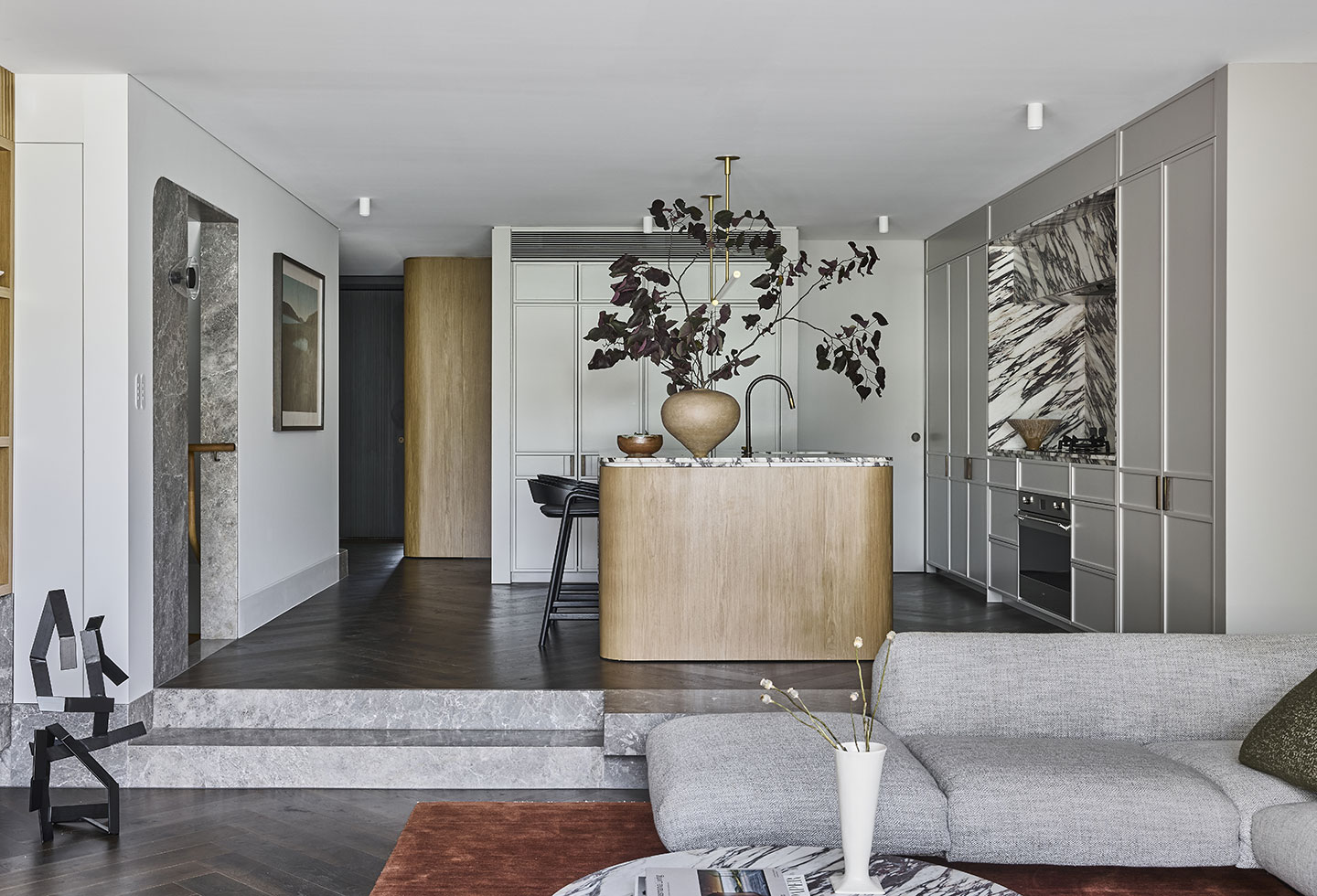 Materials matter here. The client sought ‘sophistication, timelessness and warmth.’ The dark oak parquet flooring pairs beautifully with the almond-toned cabinetry created by Summit Joinery. The crafted rhythm of the herringbone pattern “strikes a balance between classic and contemporary… grounding the interiors with a sense of warmth and permanence,” explains George.