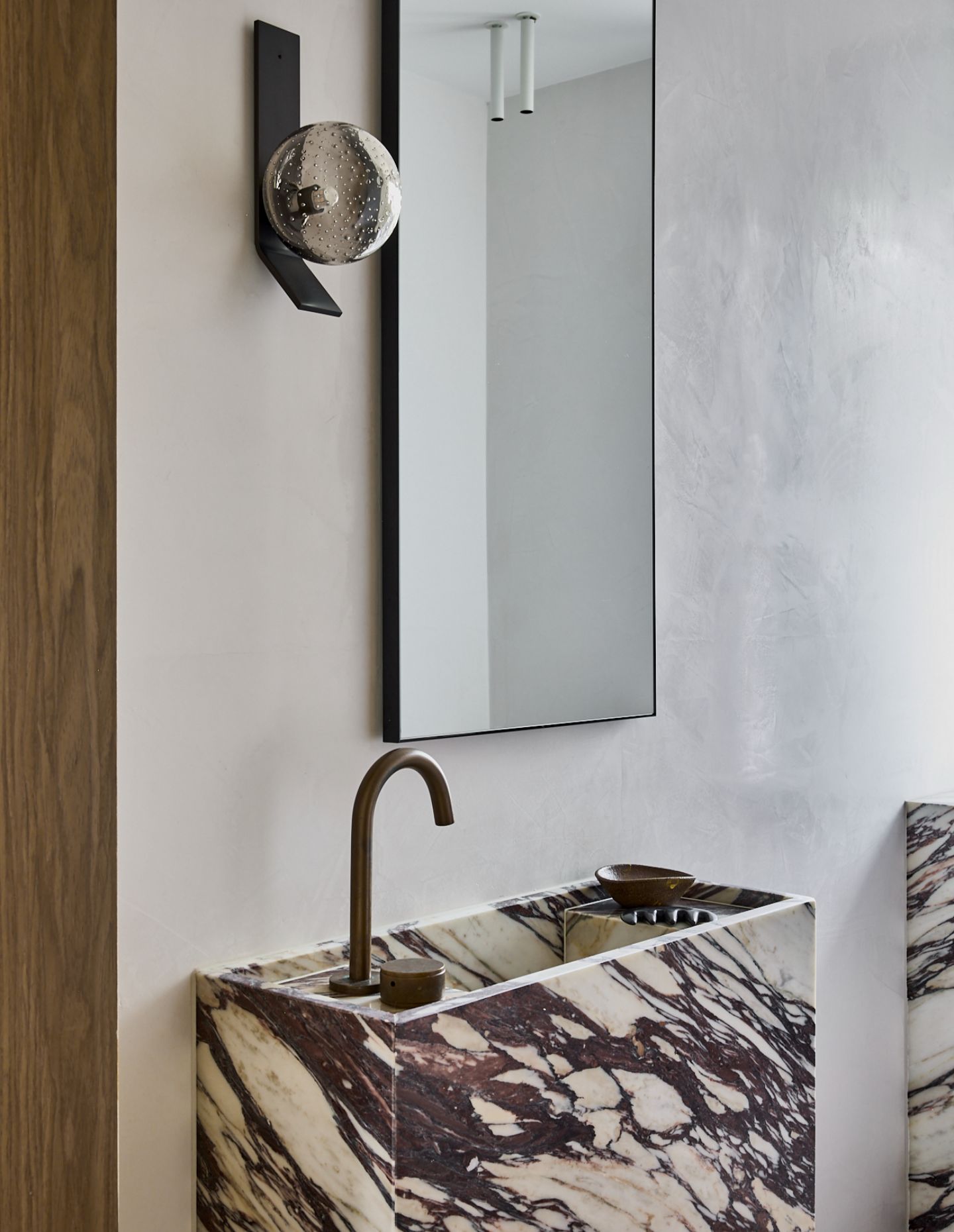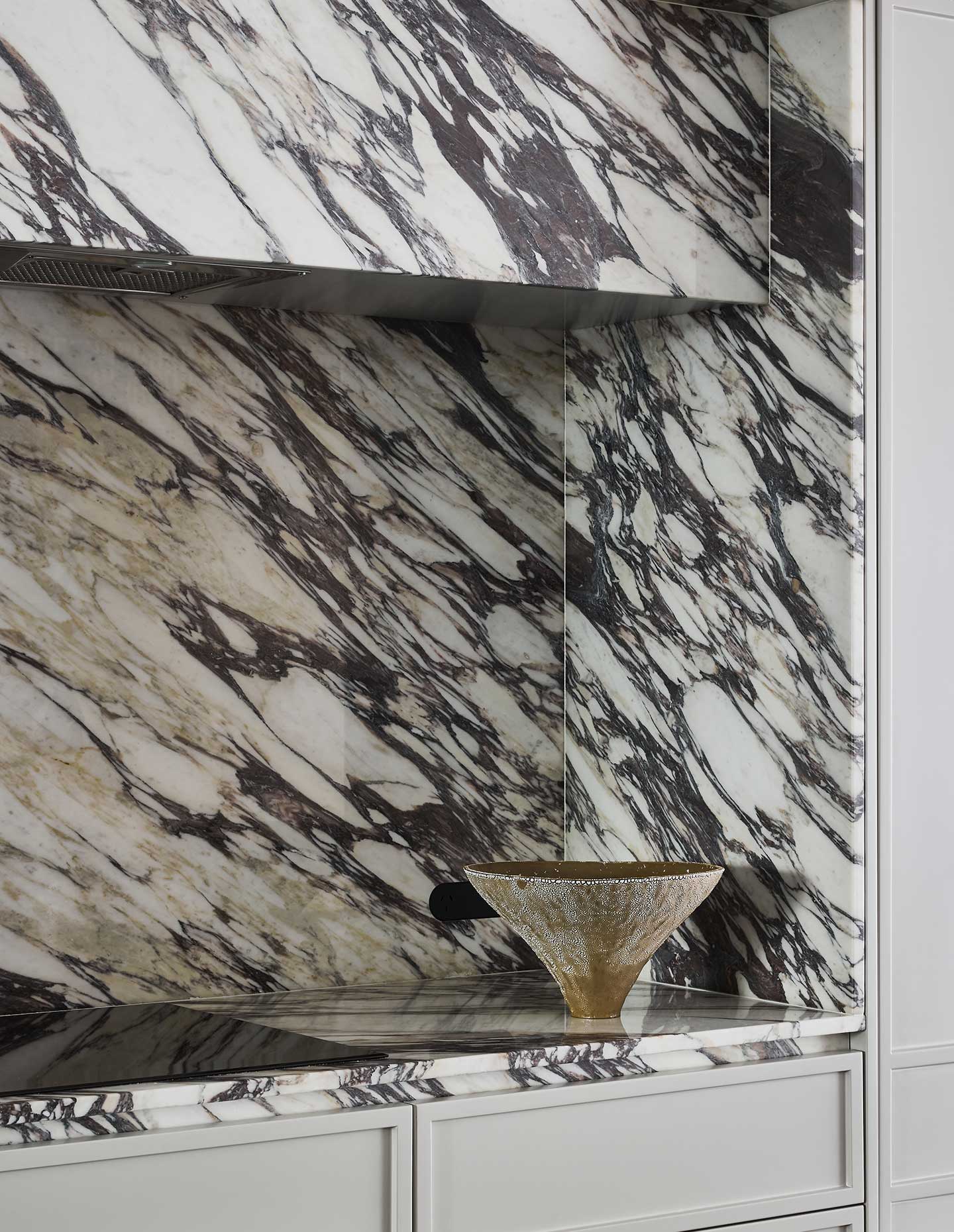For the kitchen, Calacatta Viola makes a ‘stronger statement.’ Kudos to the slab-selection, as the deeper red and purple veining accentuates and complements both the warmer and cooler tones of the adjacent Grigio and timber. There is cohesion across the different stones. Precise detailing at key junctions celebrates the stones’ versatility.