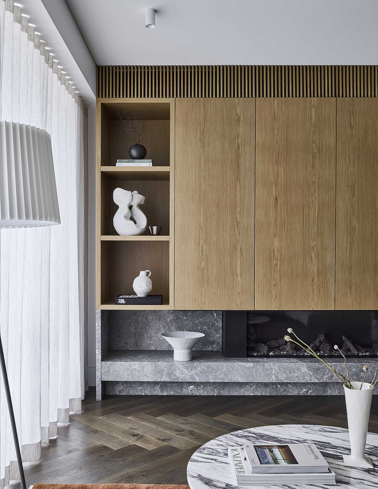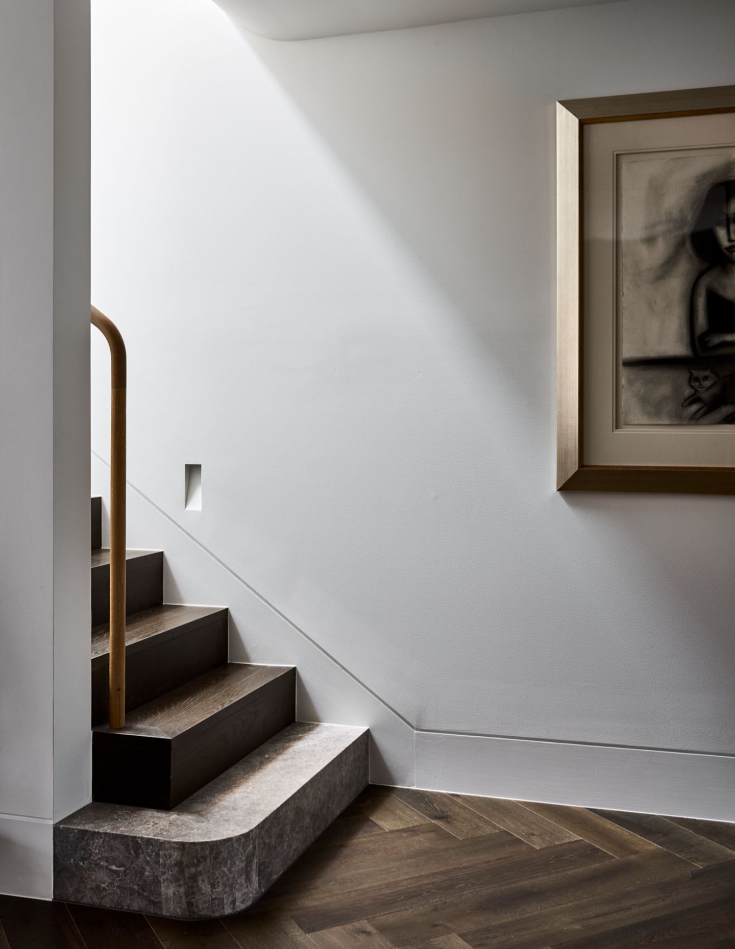 Then there is the stone. Grigio, a dark grey marble, defines the thresholds, steps, fireplace and bathrooms. It sits comfortably yet robustly alongside the timbers, demarcating zones without walls – a sophisticated solution for an open plan.