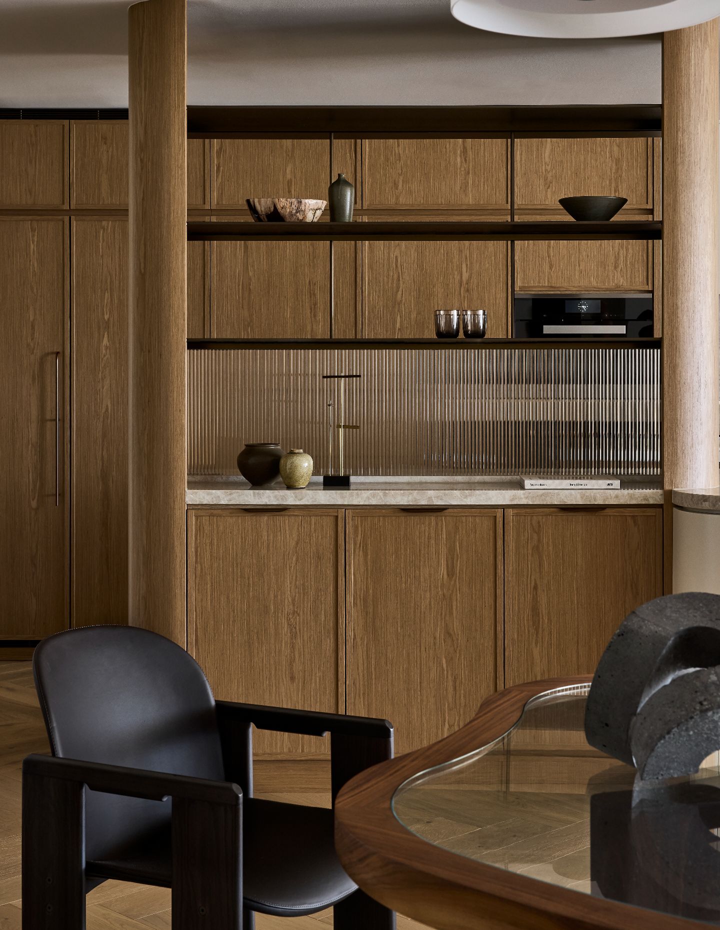 The interior is anchored by a palette of smoky oak, softly veined quartzite and muted bronze tones. Material continuity was used as a primary spatial device, allowing the apartment to read as a cohesive whole rather than a series of individual rooms.