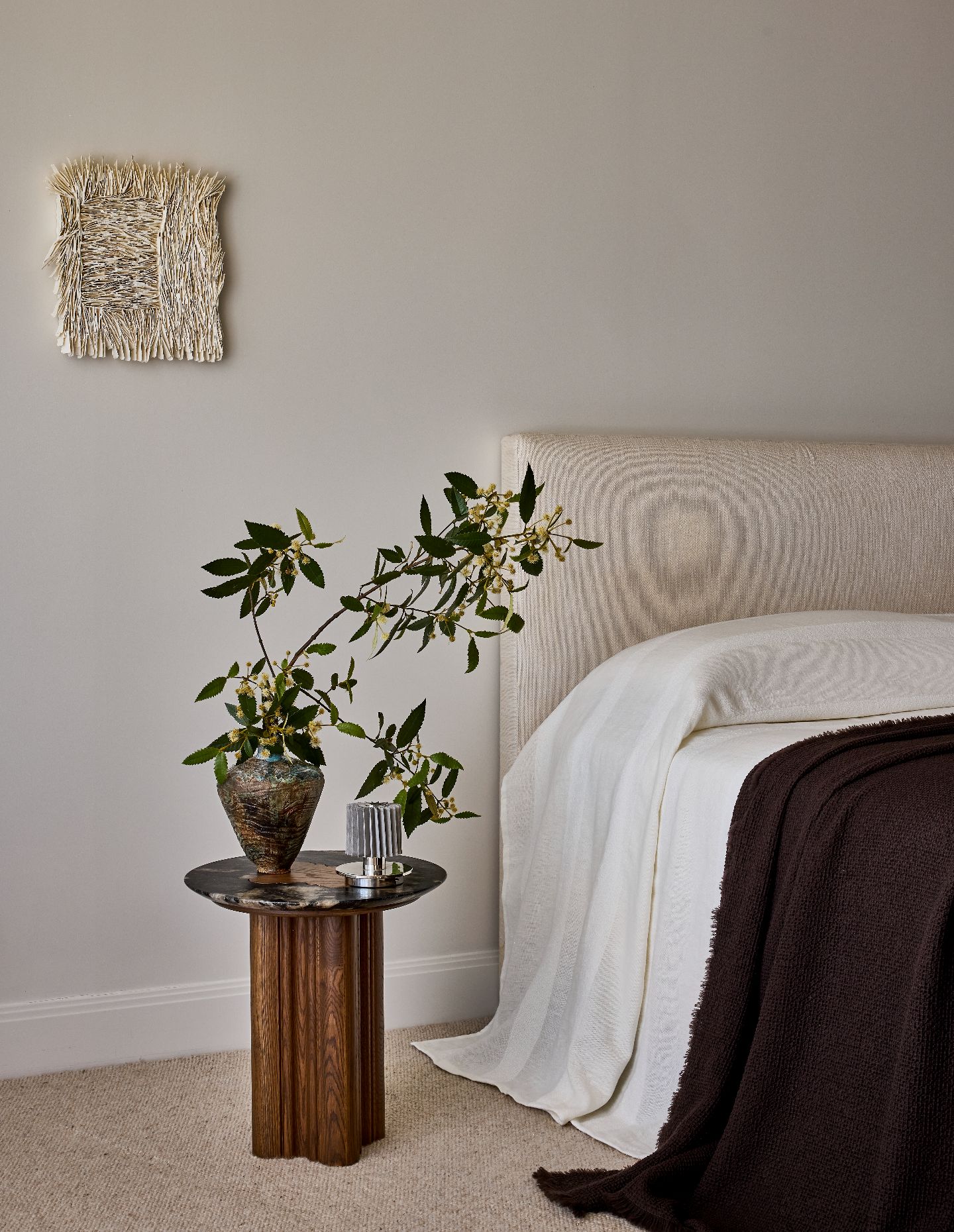 Furniture, fittings and finishes were selected to complement the restrained interior palette while introducing texture and warmth. Lighting includes pendants and wall sconces from Articolo and Est Lighting, while plumbing fittings were sourced from Faucet Strommen through Bathroom Collective. Appliances by Miele were supplied by Winnings.