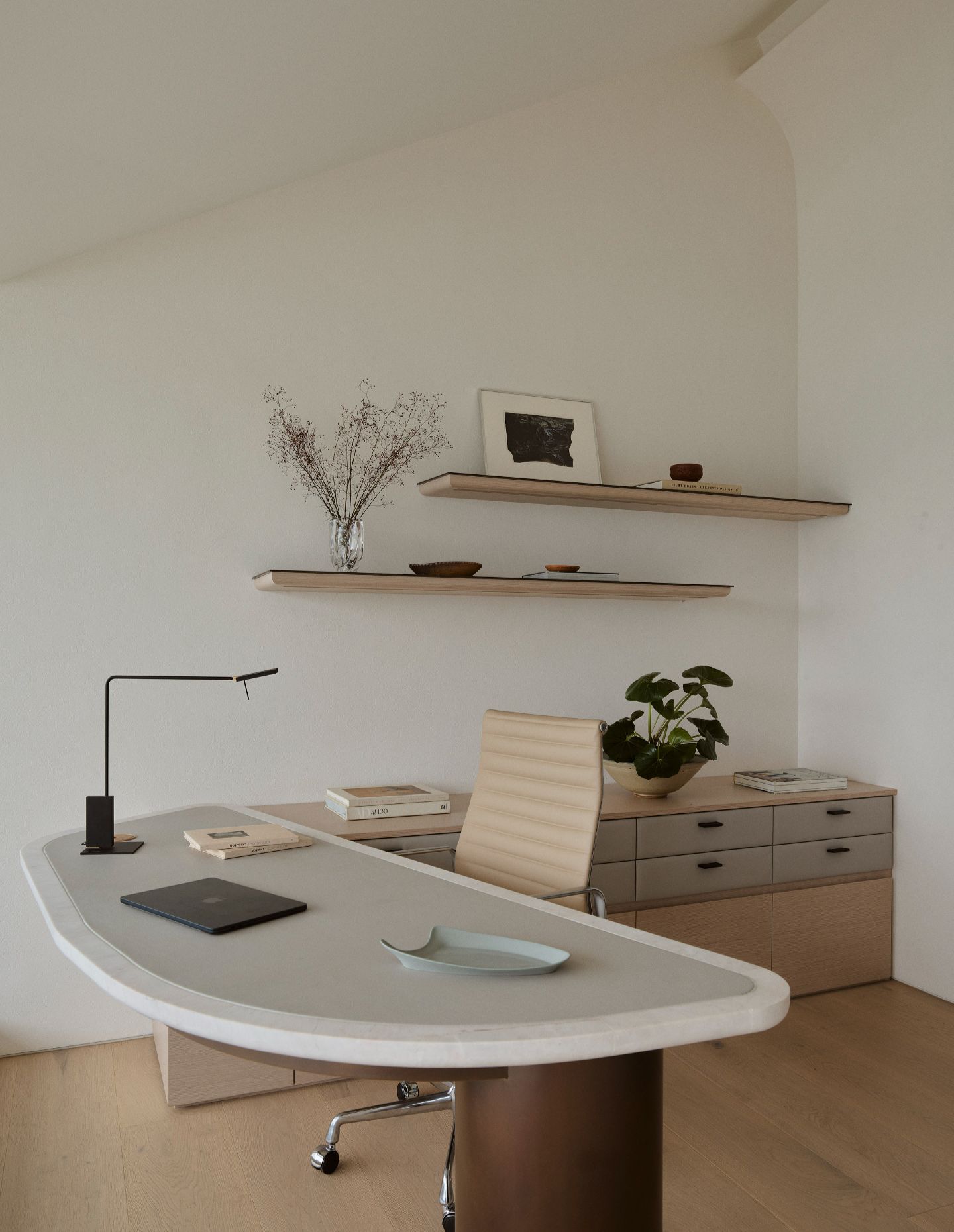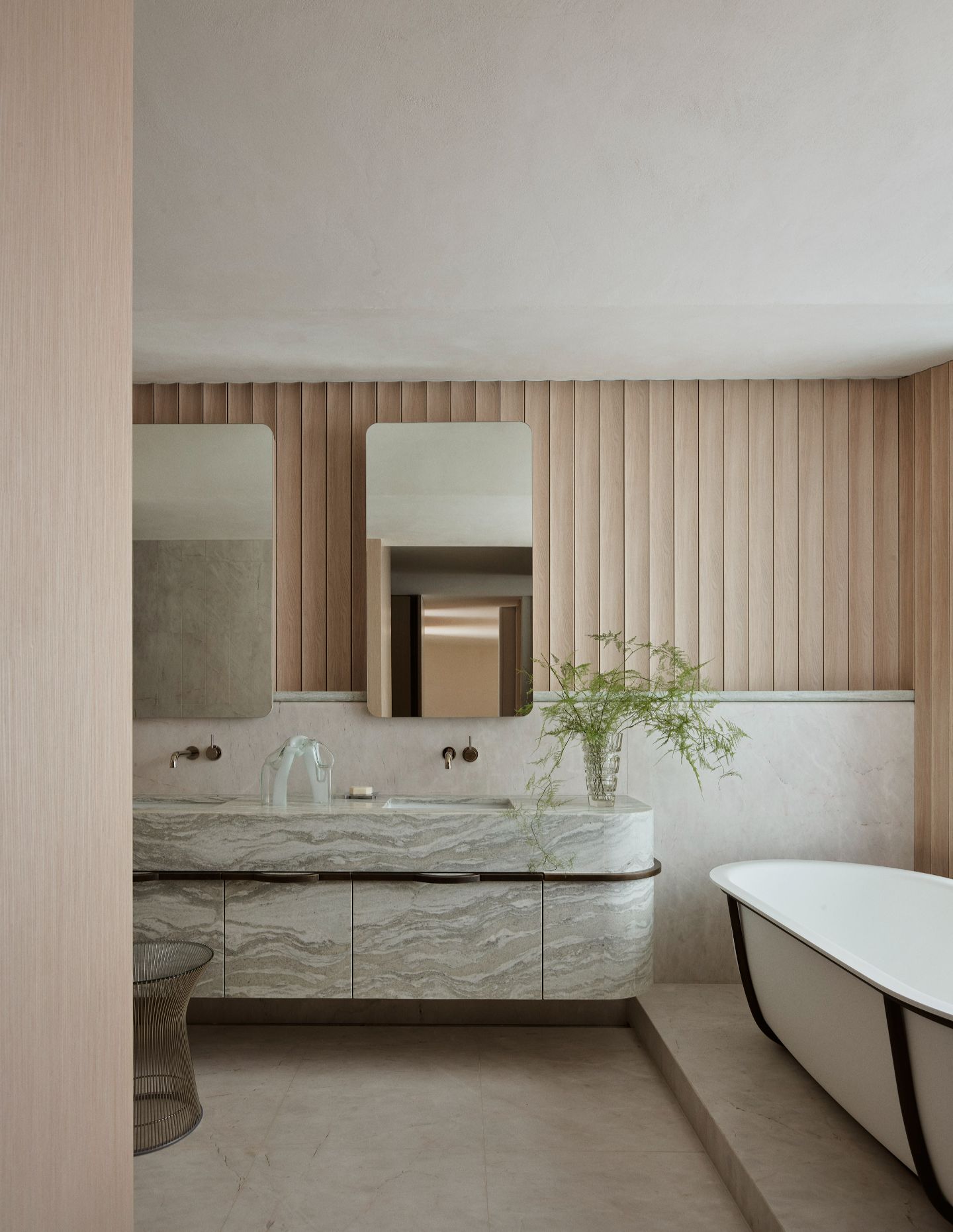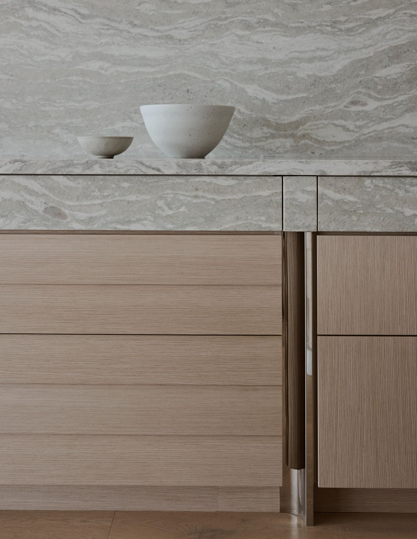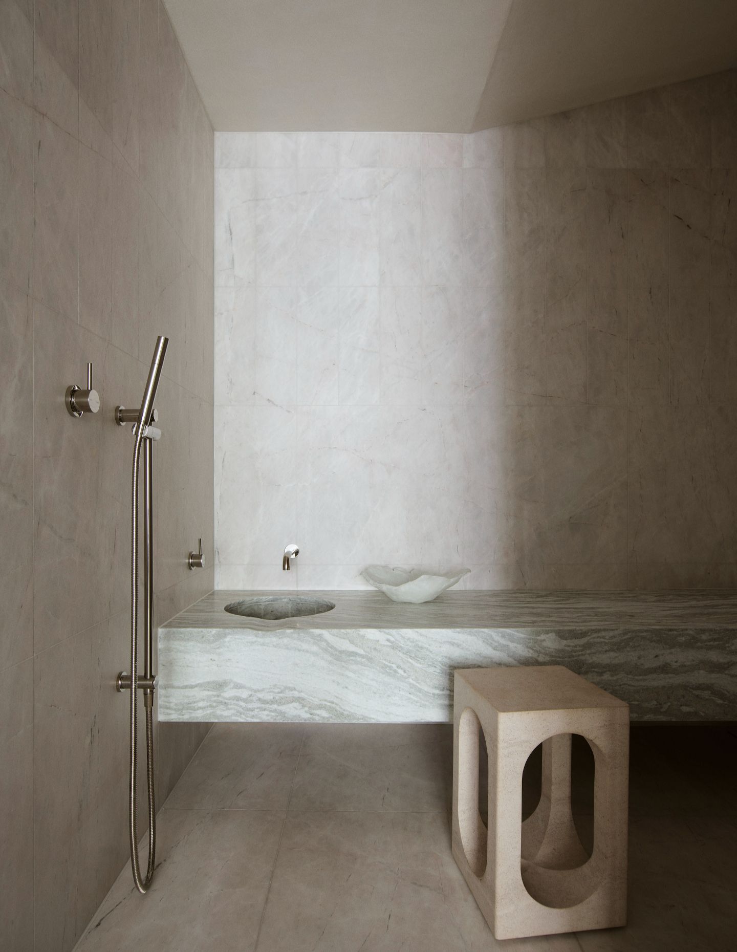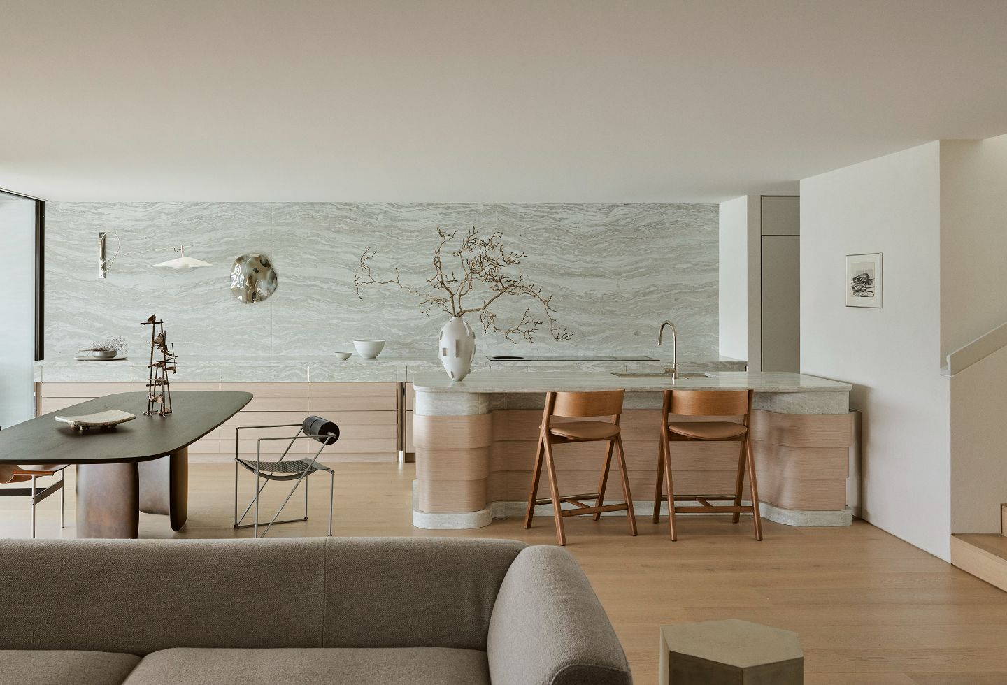 The interior palette is a masterclass in restraint. “We didn’t want it to be a competition,” Fanning notes regarding the interplay between the interior and the harbour view. The stone selection, a quartzite with pale green hues and chalky whites, was chosen not for its veins, but for its resemblance to the “soft edge of the ocean” and the waves reflected from the water. It’s as though this delicate ‘Selva Nera’ marble from CDK is the embodiment of the traditional marbling art techniques of suminagashi or ebru, rather than a metamorphic limestone rock.