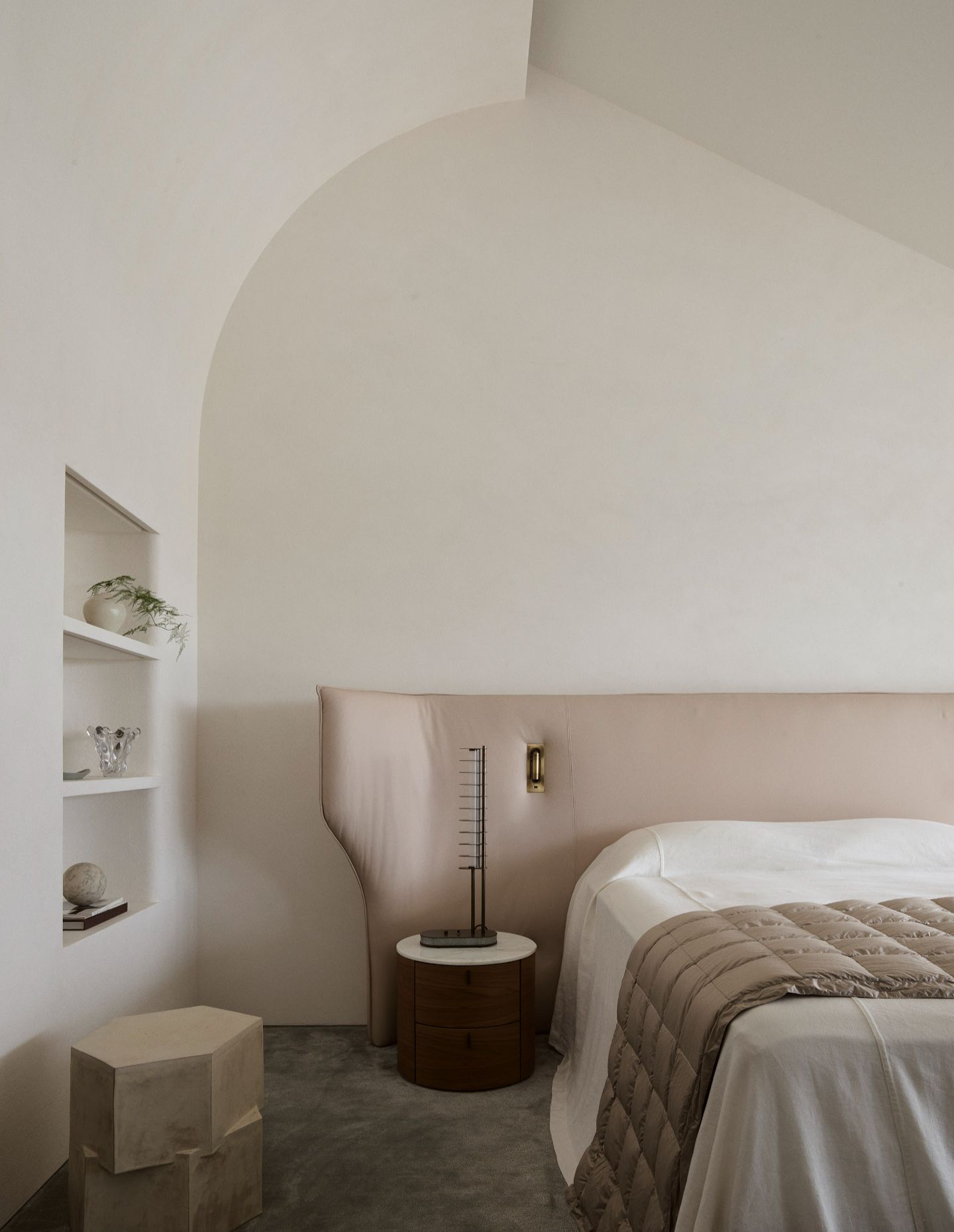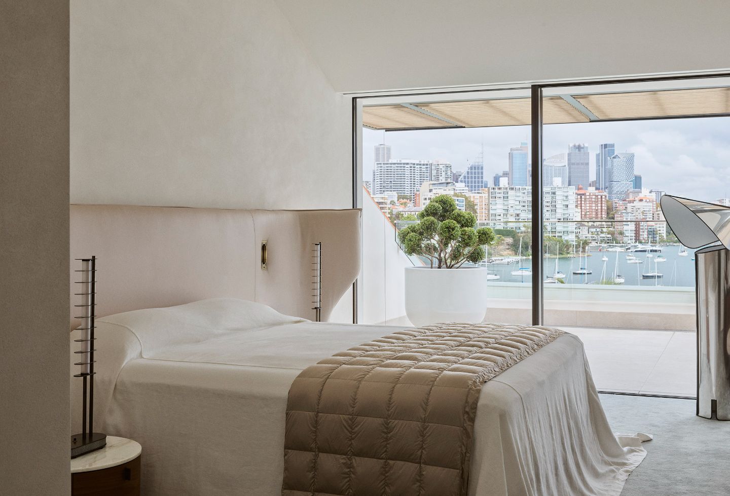 Perhaps the most poetic gesture is found in the master bedroom. Here, the ceiling architecture was redesigned to mimic a “large billowing spinnaker” taking a breeze from the harbour. Comprising of two planes—one curved and one straight—the ceiling creates a sense of volume that juxtaposes the framework of the glass doors. It’s an outcome that “works beautifully,” Mim explains.