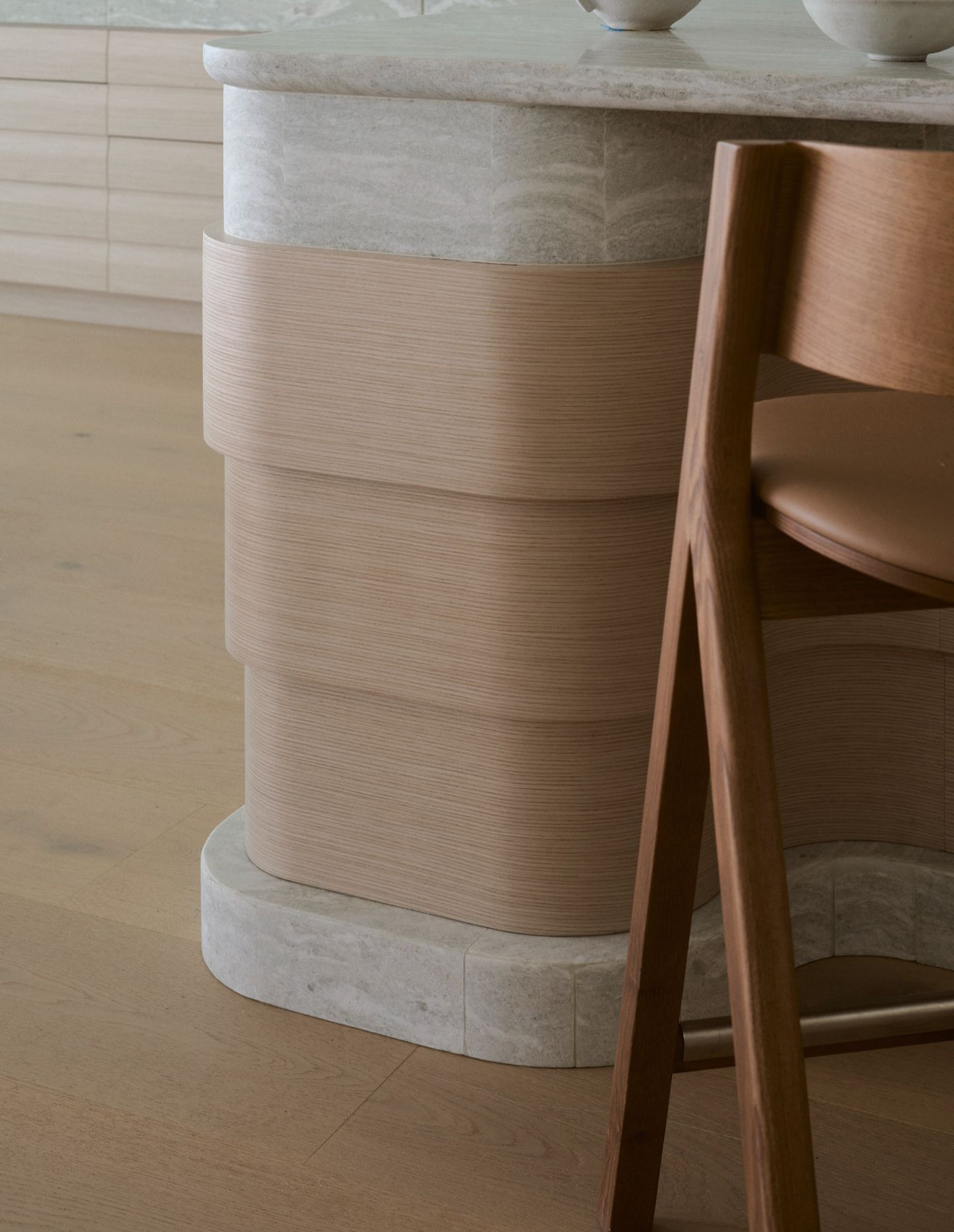 It is in the joinery that the yachting concept truly takes the helm. The kitchen is sculptural, utilising shiplap details and refined boat building techniques where equipment is hidden, and space is optimised with the efficiency and intricacy of a hull. A transition in the timber grain—from horizontal to vertical—cleverly demarcates the shift from workable drawers to larger utility storage, a detail that feels less like carpentry and more like naval engineering.