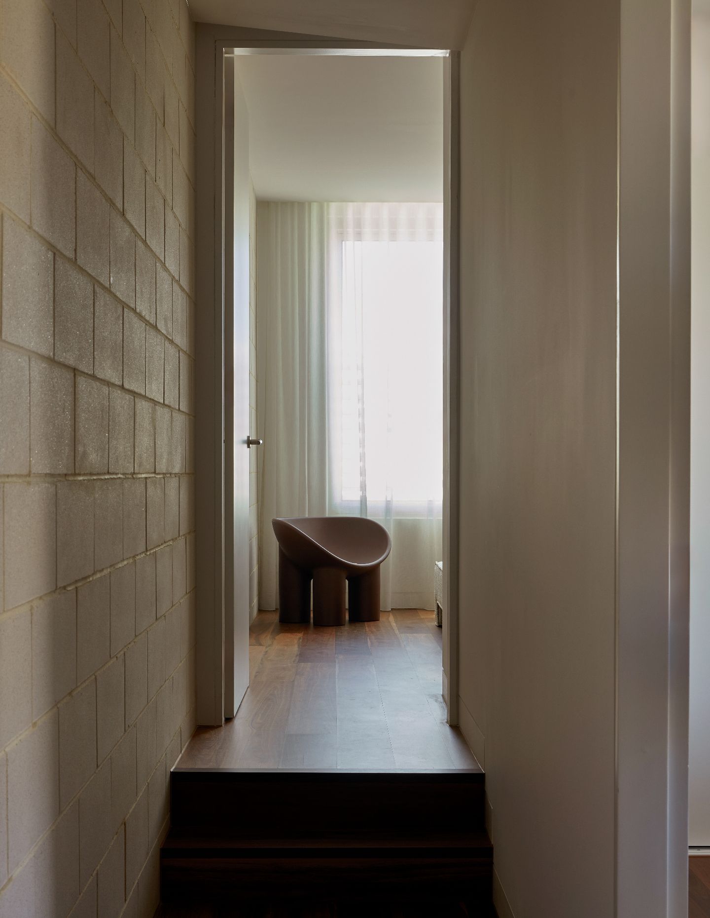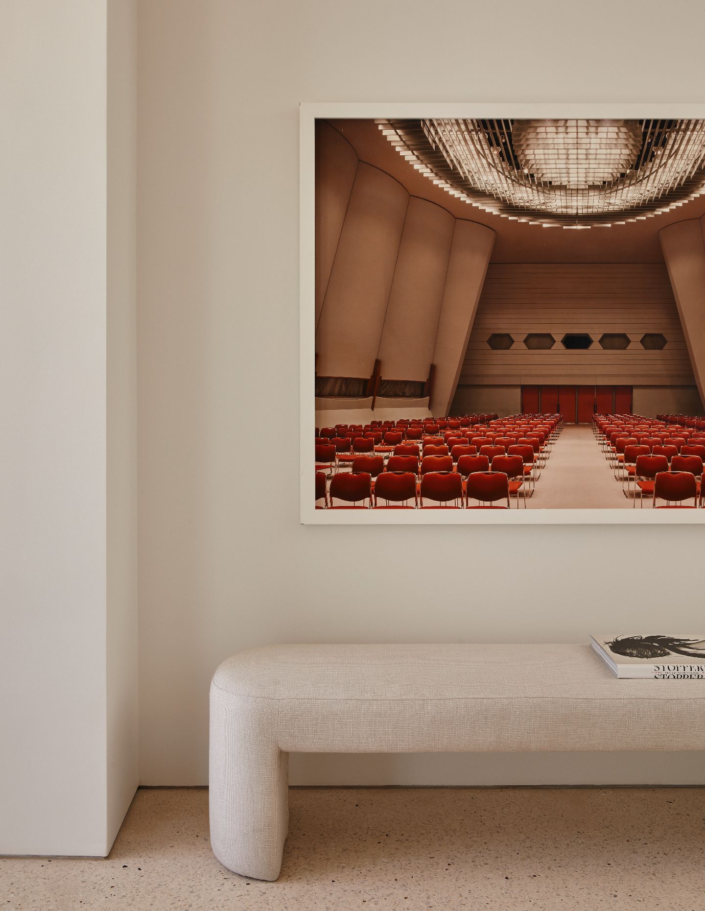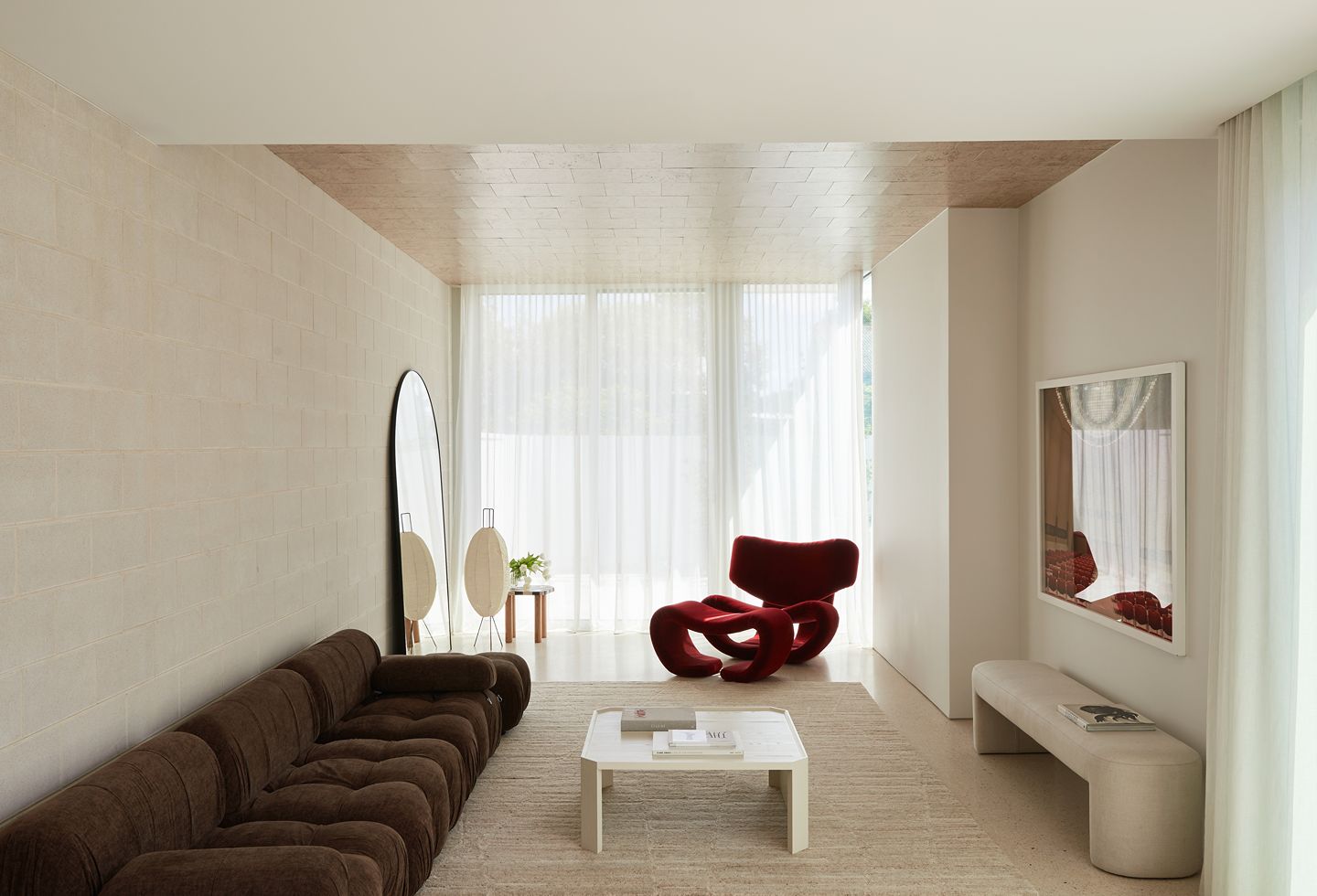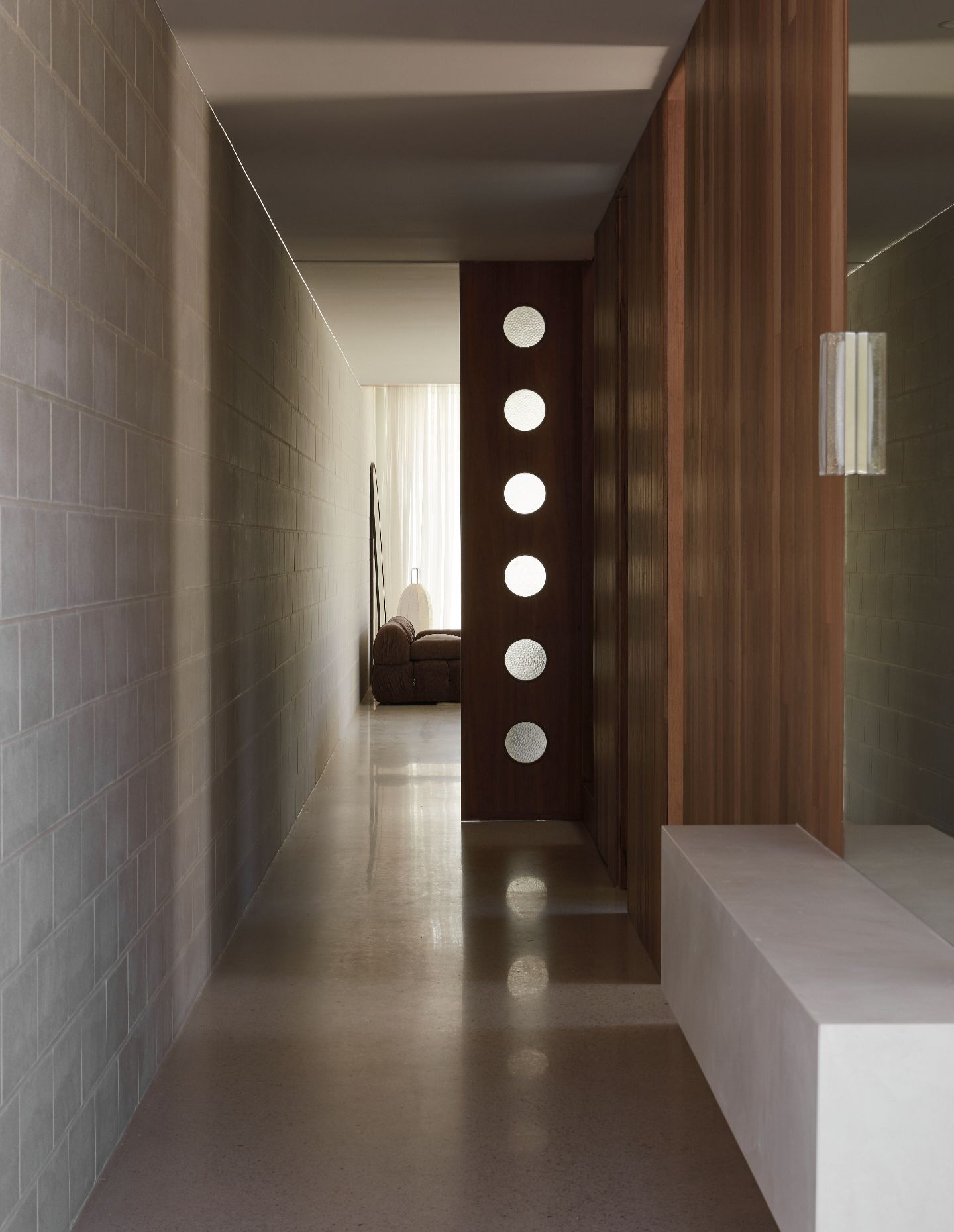 Inspired by a 1960s modern aesthetic, a soft, natural colour palette of white and timber complements the tactile materiality. The architects left the raw structural materials to final finishes for a more sustainable and durable approach, utilising low-carbon lightweight timber construction and recyclable stainless steel. However, as a counterpoint, warm and inviting hues balance for a harmonious aesthetic, continued with low-VOC paints, Holcim polished concrete floors, cork, timber, travertine stone and exposed blockwork walls.