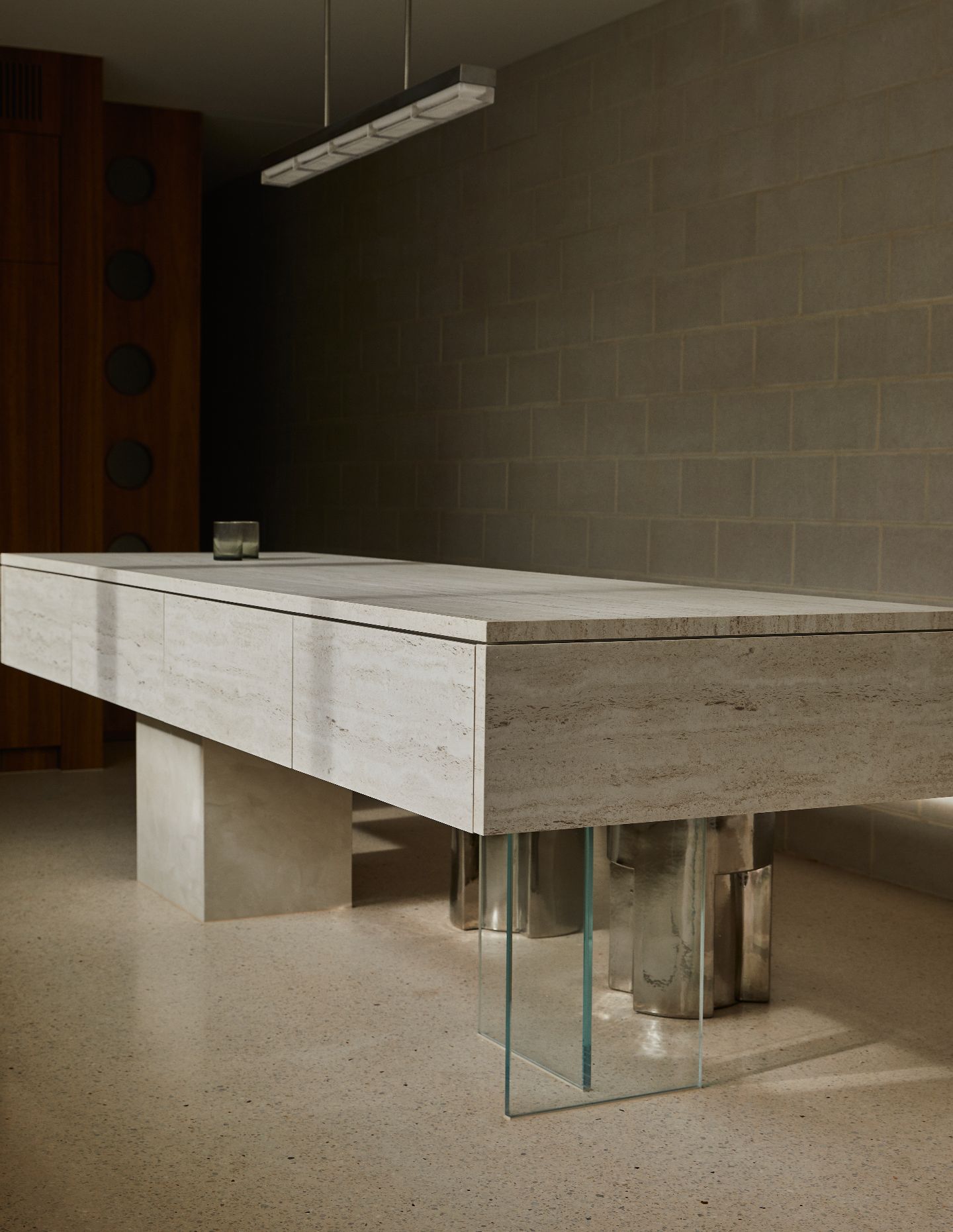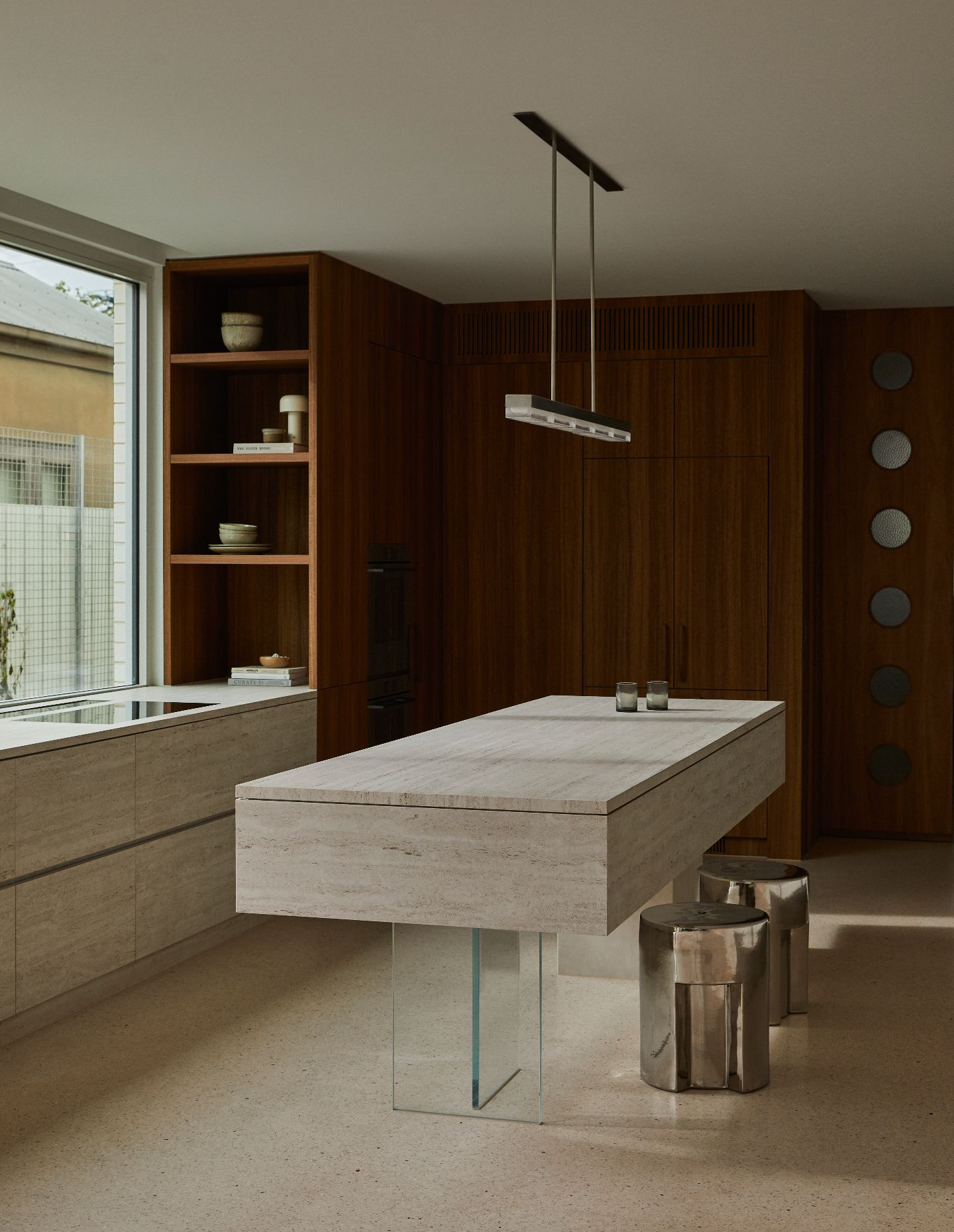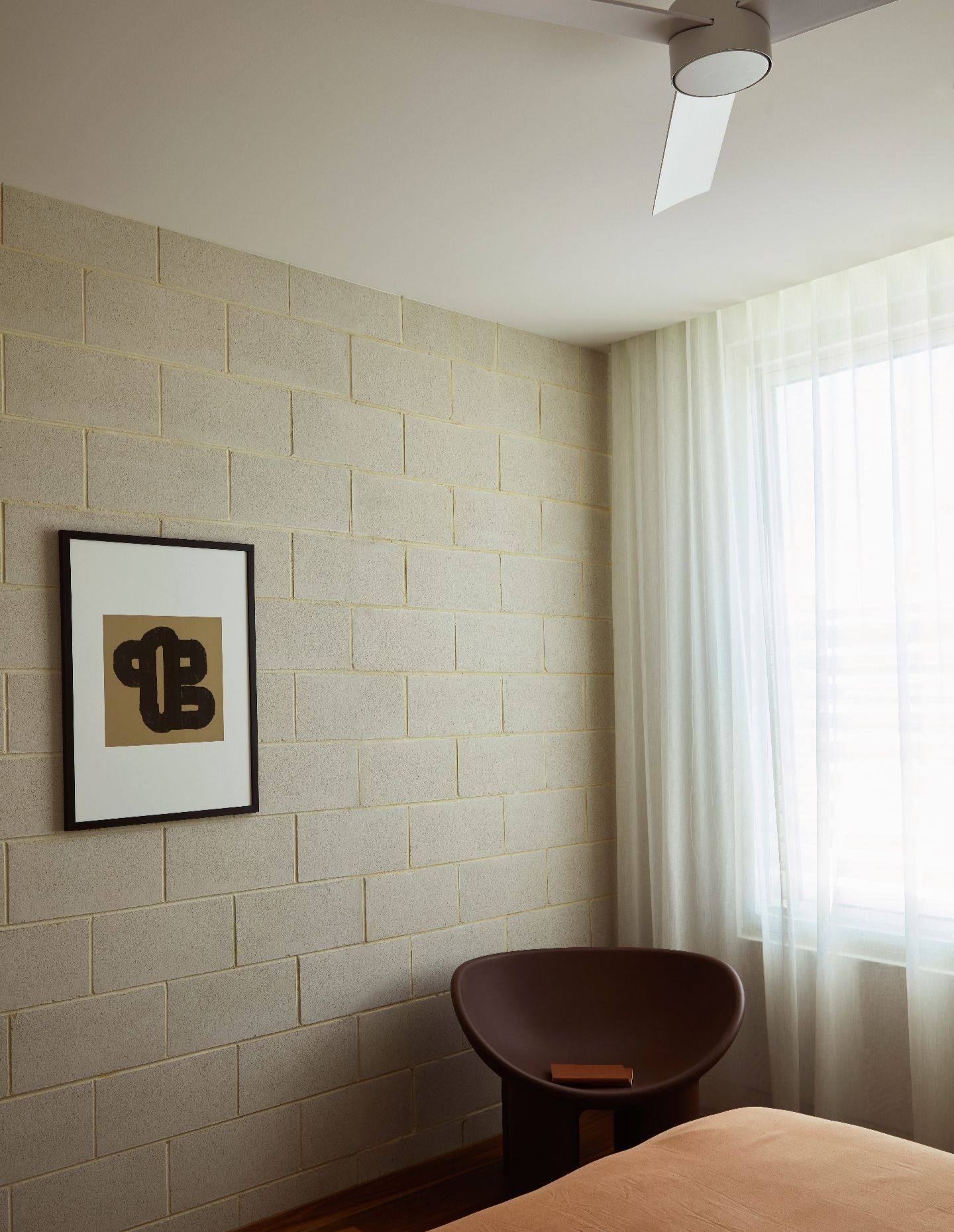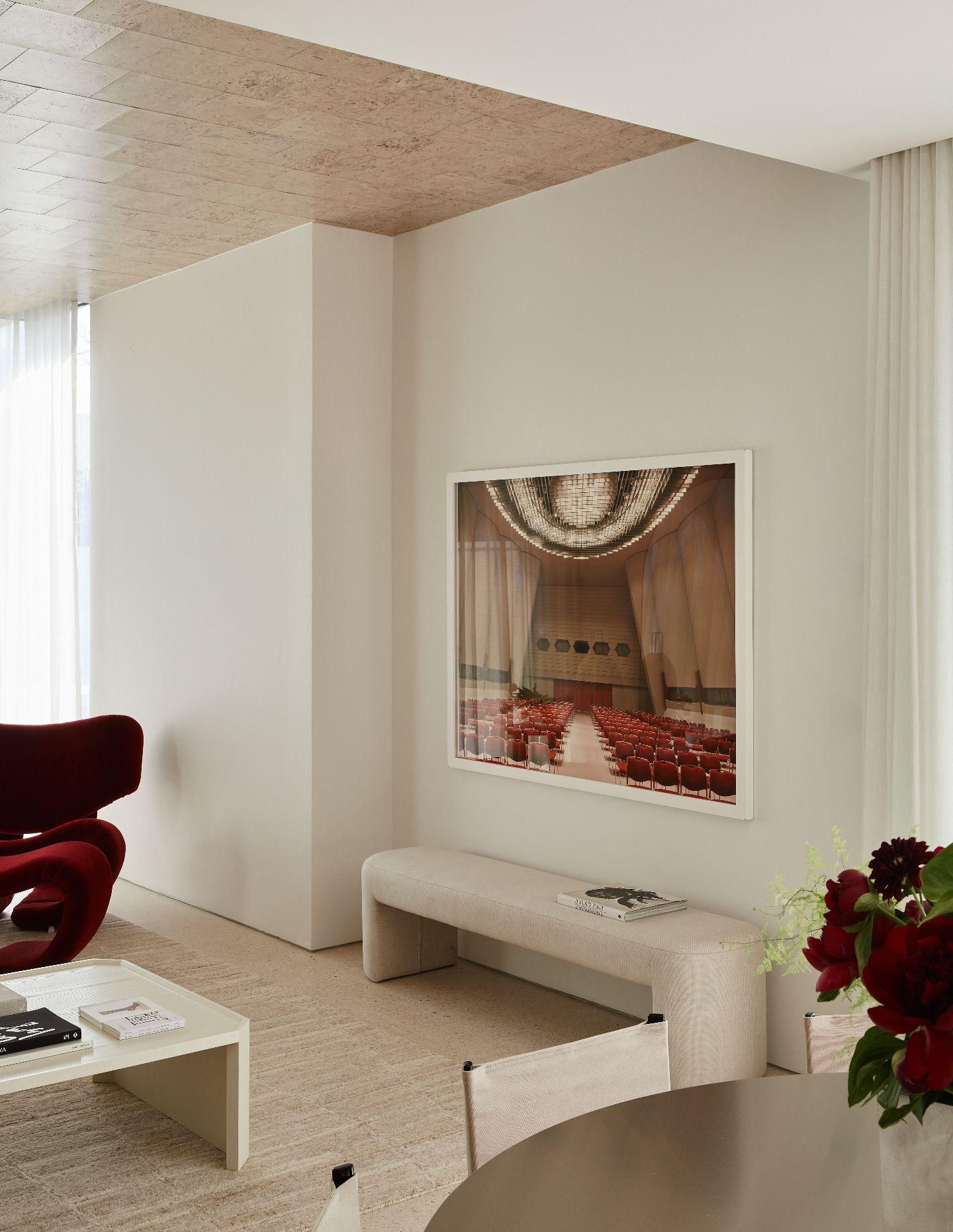 Inspired by a 1960s modern aesthetic, a soft, natural colour palette of white and timber complements the tactile materiality. The architects left the raw structural materials to final finishes for a more sustainable and durable approach, utilising low-carbon lightweight timber construction and recyclable stainless steel. However, as a counterpoint, warm and inviting hues balance for a harmonious aesthetic, continued with low-VOC paints, Holcim polished concrete floors, cork, timber, travertine stone and exposed blockwork walls.