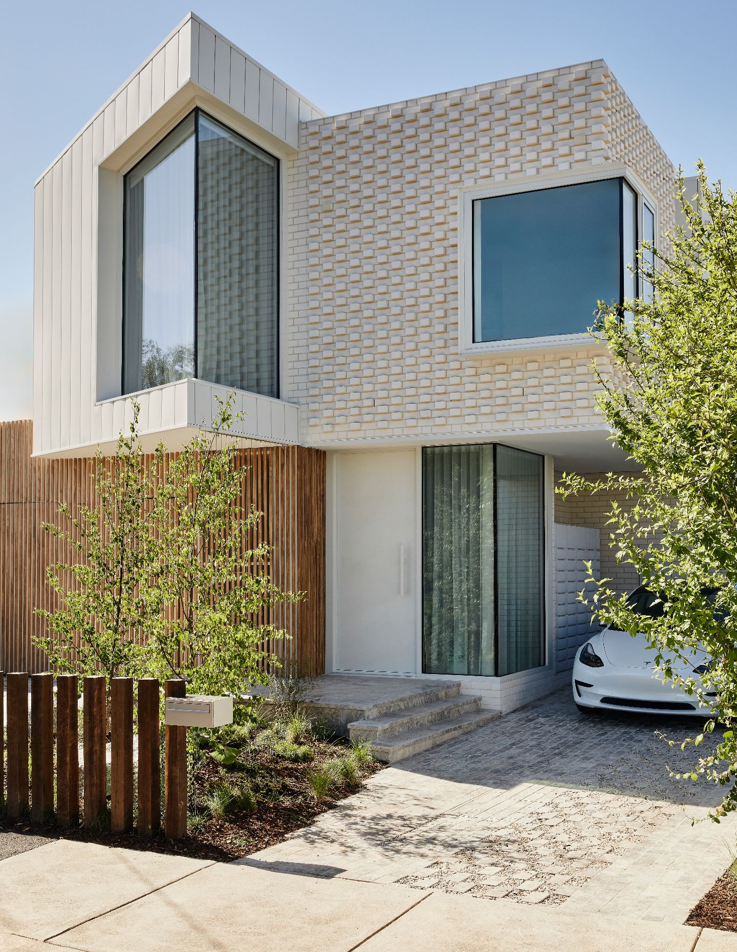 Throughout, the design focuses on achieving a completely gas-free, Net Zero operational energy model. The 6kW solar photovoltaic system powers induction cooktops, hot water heat pumps and dryers, while 2000L Rain gardens and rainwater collection systems are installed at each property. Additionally, window shrouds, louvred screens and an operable window shade awning on the northern side contribute to the passive design qualities. In turn, the cantilevered upper floors add depth to the front façade, providing shading and privacy at the entryway.