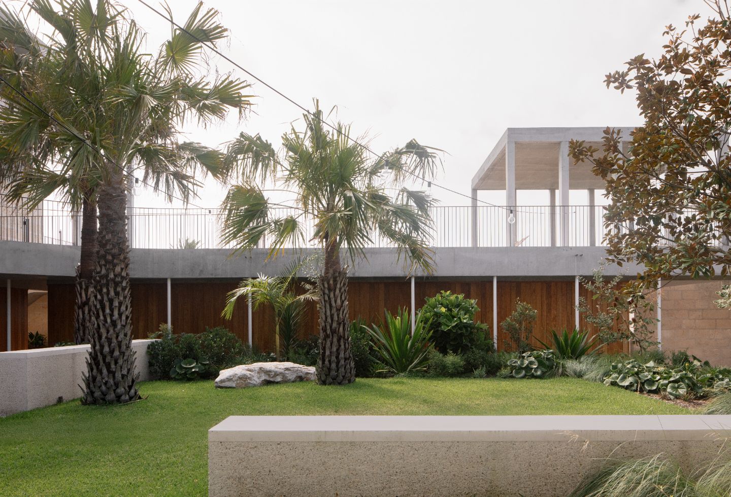 The thick limestone wall running from one corner to the opposite changes in height from hip level to almost two storeys. Interspersed along the way are deliberately positioned apertures designed to provide glimpses of the inside, such as a cluster of Cabbage tree palms and a mature evergreen Magnolia Grandiflora.