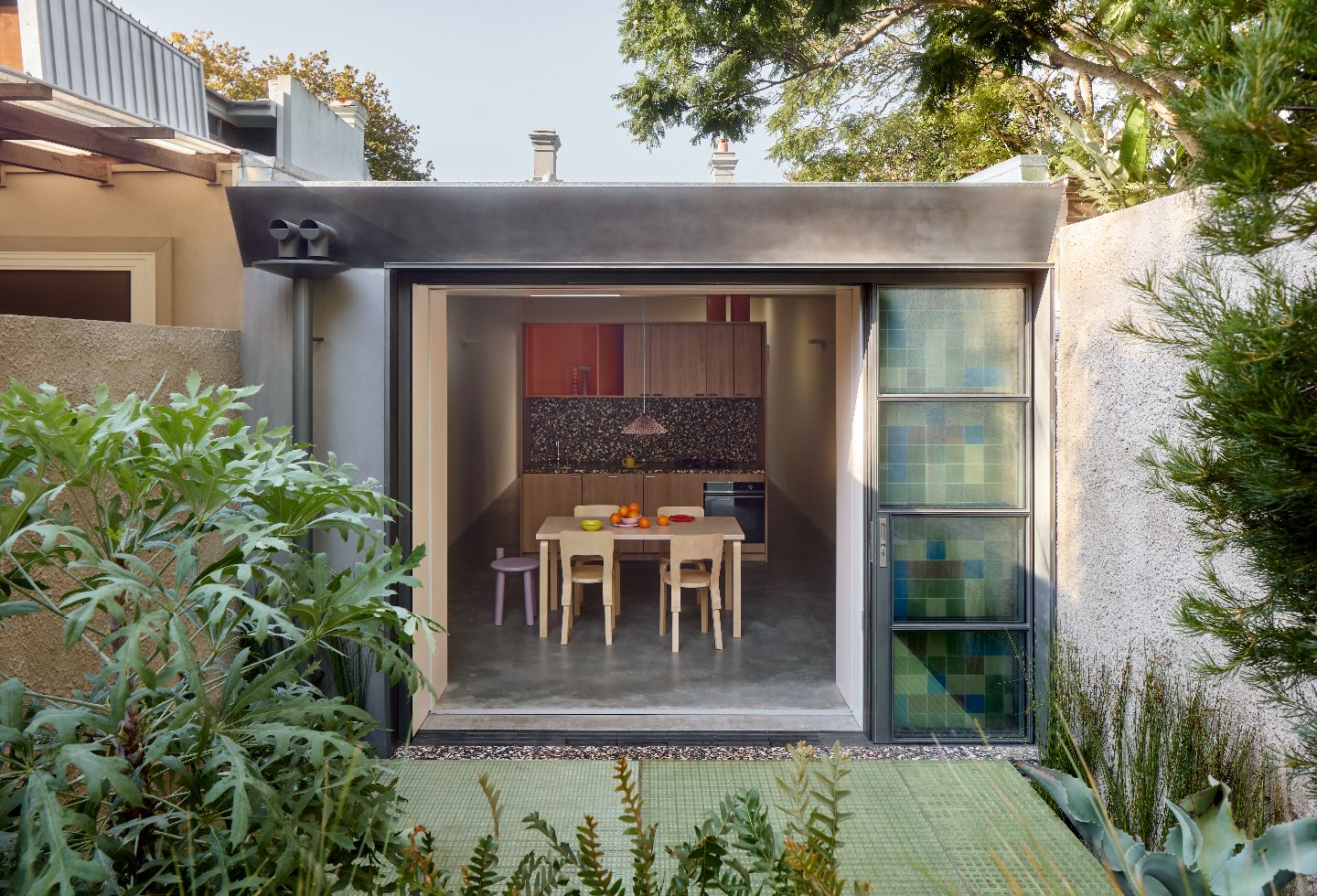 While Miranda retained and restored the original heritage facade, making minor modifications to the two bedrooms at the front of the house, he cleared away a series of dilapidated rear extensions that had been added over time. This allowed for a newly landscaped stepped backyard and new outdoor dining area that brings the outdoors in and, along with the new internal courtyard adjacent the second bedroom, perfectly bookends the home’s living spaces. Indeed it’s here – in the skylit kitchen, lounge and dining areas – that Miranda’s playful design finds its greatest expression.