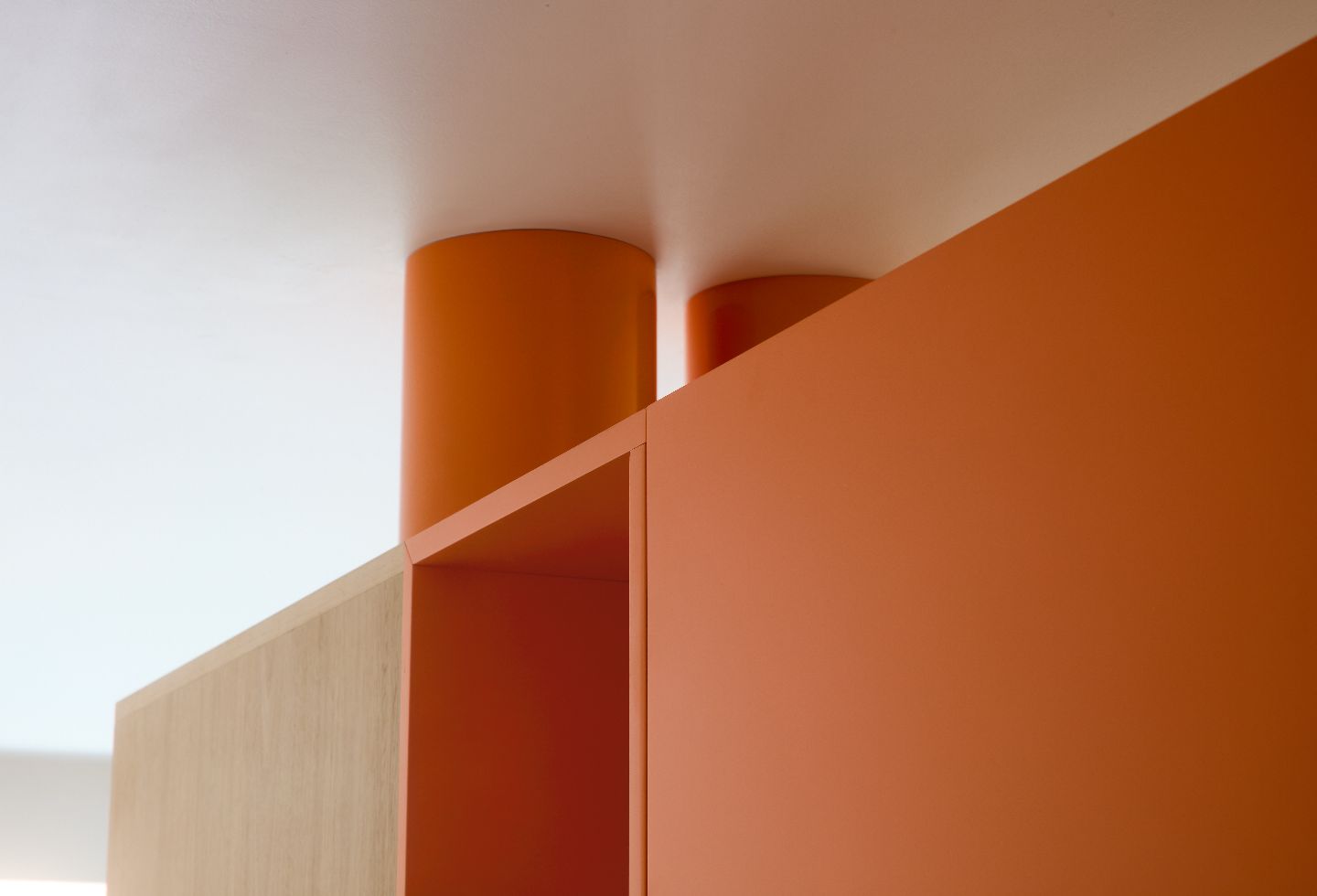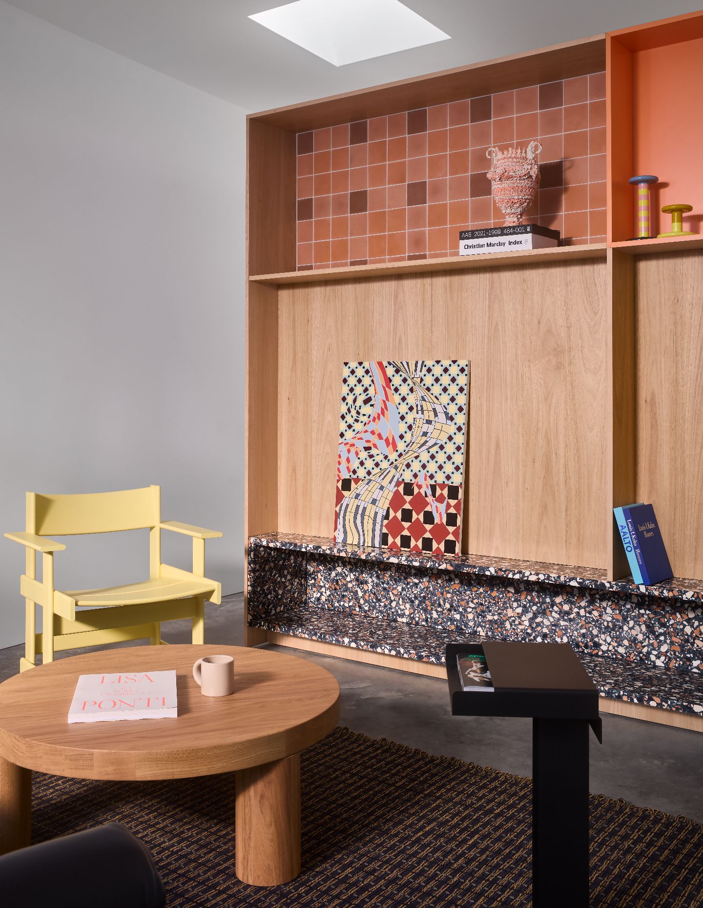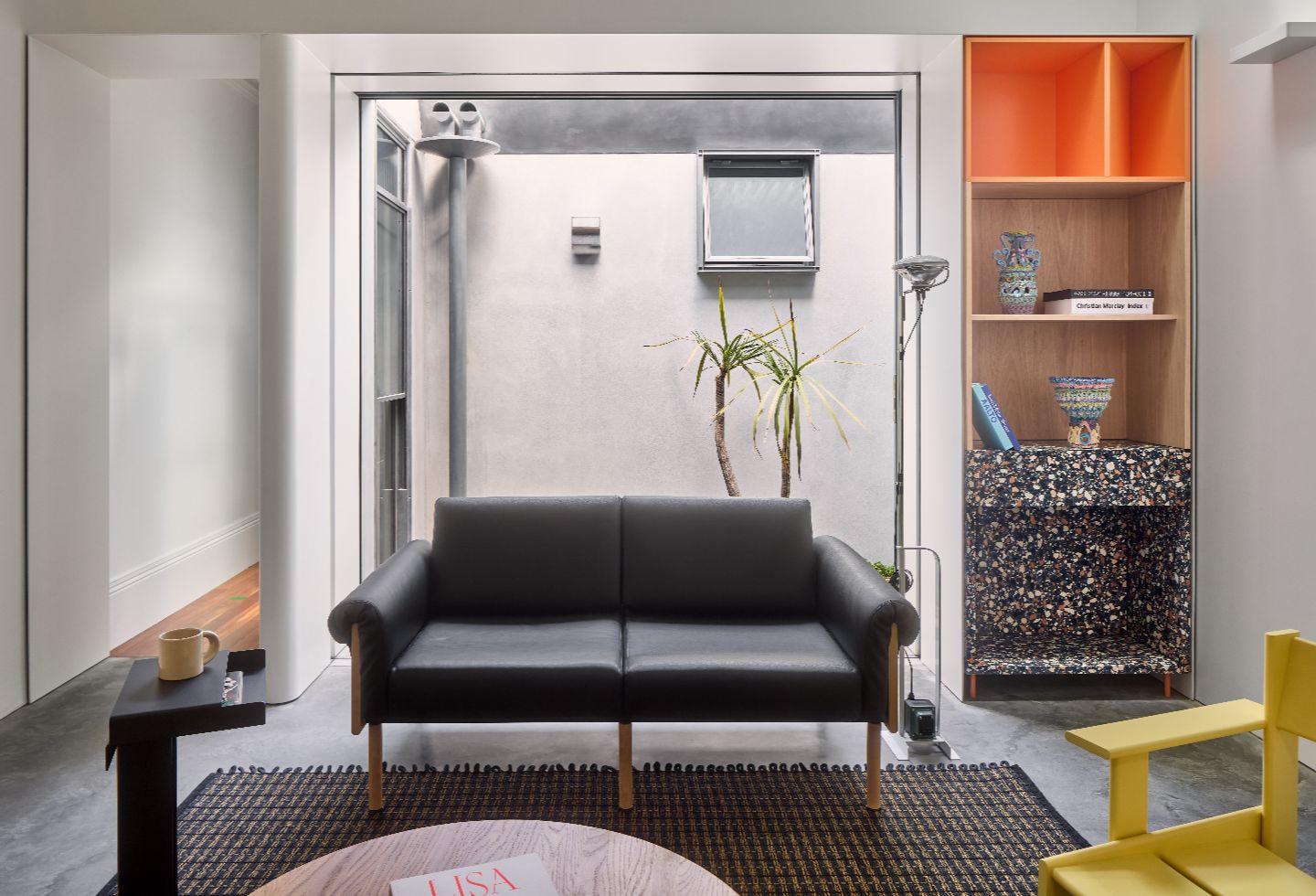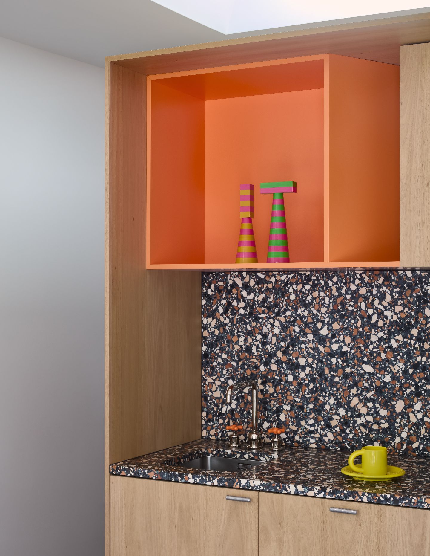 As Miranda explains, “We worked collaboratively to integrate an eclectic interior into the scheme, while considering its enduring appeal and relevance into the future. Our clients’ request for an unflinchingly orange kitchen typifies this brief, as it required extensive sampling to understand the variability of several shades over the course of a day and within the context of character-rich timber veneer and chunky terrazzo.”